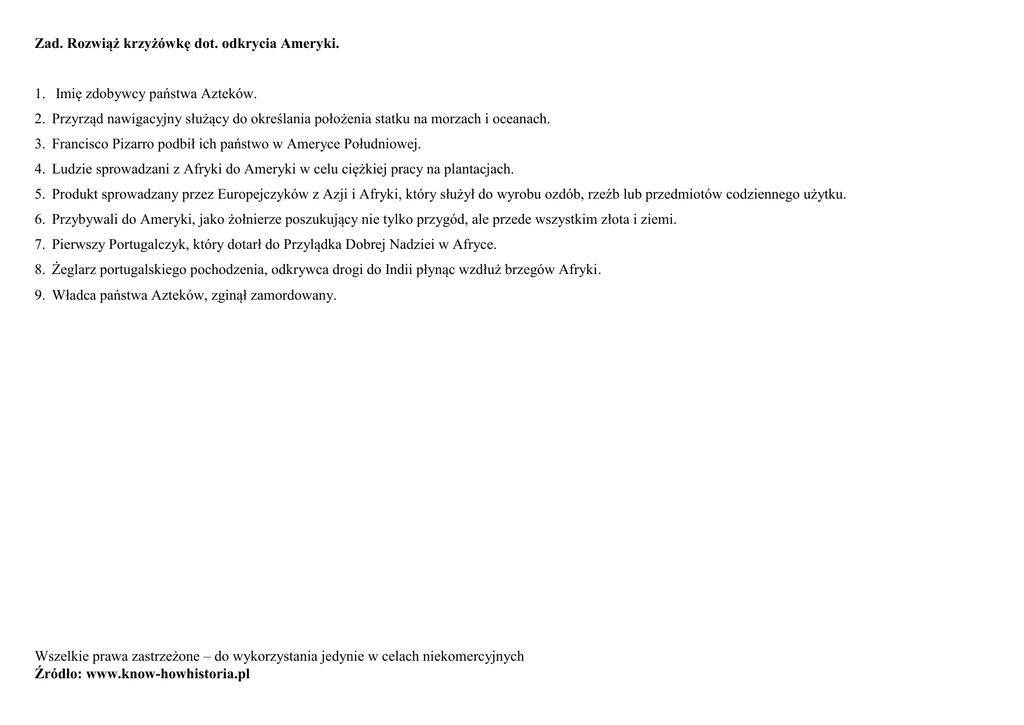 Zad. Rozwiąż krzyżówkę dot. odkrycia Ameryki. 1. Imię zdobywcy państwa Azteków. 2. Przyrząd nawigacyjny służący do określania położenia statku na morzach i oceanach. 3. Francisco Pizarro podbił ich państwo w Ameryce Południowej. 4. Ludzie sprowadzani z Afryki do Ameryki w celu ciężkiej pracy na plantacjach. 5. Produkt sprowadzany przez Europejczyków z Azji i Afryki, który służył do wyrobu ozdób, rzeźb lub przedmiotów codziennego użytku. 6. Przybywali do Ameryki, jako żołnierze poszukujący nie tylko przygód, ale przede wszystkim złota i ziemi. 7. Pierwszy Portugalczyk, który dotarł do Przylądka Dobrej Nadziei w Afryce. 8. Żeglarz portugalskiego pochodzenia, odkrywca drogi do Indii płynąc wzdłuż brzegów Afryki. 9. Władca państwa Azteków, zginął zamordowany. Wszelkie prawa zastrzeżone – do wykorzystania jedynie w celach niekomercyjnych Źródło: www.know-howhistoria.pl 1 2 3 4 5 6 7 8 9 Wszelkie prawa zastrzeżone – do wykorzystania jedynie w celach niekomercyjnych Źródło: www.know-howhistoria.pl