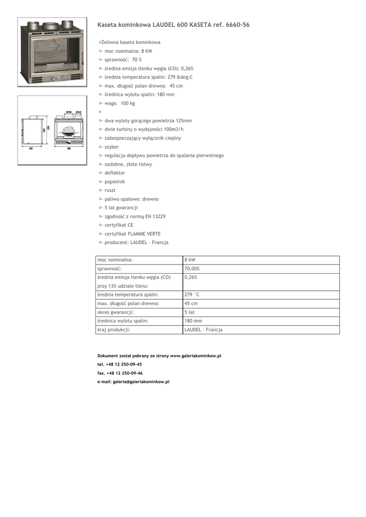 Kaseta kominkowa LAUDEL 600 KASETA ref. 6660-56 Żeliwna kaseta kominkowa - moc nominalna: 8 kW - sprawność: 70 % - średnia emisja tlenku węgla (CO): 0,26% - średnia temperatura spalin: 279 °C - max. długość polan drewna: 45 cm - średnica wylotu spalin: 180 mm - waga: 100 kg - dwa wyloty gorącego powietrza 125mm - dwie turbiny o wydajności 100m3/h - zabezpieczający wyłącznik cieplny - szyber - regulacja dopływu powietrza do spalania pierwotnego - ozdobne, złote listwy - deflektor - popielnik - ruszt - paliwo opałowe: drewno - 5 lat gwarancji - zgodność z normą EN 13229 - certyfikat CE - certyfikat FLAMME VERTE - producent: LAUDEL - Francja moc nominalna: 8 kW sprawność: 70,00% średnia emisja tlenku węgla (CO) 0,26% przy 13% udziale tlenu: średnia temperatura spalin: 279 °C max. długość polan drewna: 45 cm okres gwarancji: 5 lat średnica wylotu spalin: 180 mm kraj produkcji: LAUDEL - Francja Dokument został pobrany ze strony www.galeriakominkow.pl tel. +48 12 250-09-45 fax. +48 12 250-09-46 e-mail: [email protected]