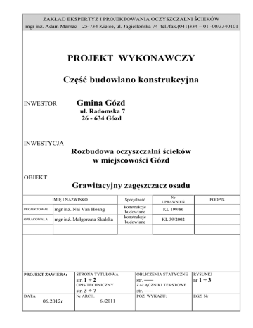 ZAKŁAD EKSPERTYZ I PROJEKTOWANIA OCZYSZCZALNI ŚCIEKÓW mgr inŜ. Adam Marzec 25-734 Kielce, ul. Jagiellońska 74 tel./fax.(041)334 – 01 -00/3340101 PROJEKT WYKONAWCZY Część budowlano konstrukcyjna INWESTOR Gmina Gózd ul. Radomska 7 26 - 634 Gózd INWESTYCJA Rozbudowa oczyszczalni ścieków w miejscowości Gózd OBIEKT Grawitacyjny zagęszczacz osadu IMIĘ I NAZWISKO Specjalność PROJEKTOWAŁ mgr inŜ. Nai Van Hoang OPRACOWAŁA mgr inŜ. Małgorzata Skalska SPRAWDZIŁ mgr inŜ. Stanisław Janyst PROJEKT ZAWIERA: DATA 06.2012r konstrukcje budowlane konstrukcje budowlane konstrukcje budowlane Nr UPRAWNIEŃ PODPIS KL 199/86 KL 39/2002 KL 217/86 STRONA TYTUŁOWA OBLICZENIA STATYCZNE RYSUNKI str. 1 ÷ 2 str. ––– nr 1 ÷ 3 OPIS TECHNICZNY ZAŁĄCZNIKI TEKSTOWE str. 3 ÷ 7 str. ––– Nr ARCH. POZ. WYKAZU: 6 /2011 EGZ. Nr 2 ZAWARTOŚĆ OPRACOWANIA 1. Opis techniczny 2. Rysunki: Rys. nr 1: Zagęszczacz osadu - przekrój poziomy Rys. nr 2: Zagęszczacz osadu - przekrój pionowy 1-1 Rys. nr 3: Zagęszczacz osadu - rysunek zbrojenia 3 OPIS TECHNICZNY do projektu wykonawczego rozbudowy oczyszczalni ścieków w miejscowości Gózd – Grawitacyjny zagęszczacz osadu – 1.0. Podstawa opracowania 1.1. Zlecenie Inwestora: Gmina Gózd 26-634 Gózd, ul. Radomska 7 1.2. Projekt zagospodarowania terenu opracowany równolegle. 1.3. Projekt budowlany konstrukcyjny grawitacyjnego zagęszczacza osadu. 1.4. Dokumentacja z geotechnicznych ustaleń warunków gruntowych wykonanych na terenie oczyszczalni ścieków zlokalizowanej w miejscowości Gózd, pow. radowski, woj. mazowieckie, opracowana przez „QWIERT” Dominik Kuc, ul. Barwinek 14/50, Kielce w listopadzie 2011 r. 1.5. Robocze ustalenia z Zamawiającym w sprawie podstawowych materiałów i technologii wykonania. 1.6. Obowiązujące normy i przepisy. 2.0. Przedmiot opracowania Przedmiotem niniejszego opracowania jest projekt wykonawczy branŜy konstrukcyjnej zagęszczacza grawitacyjnego osadu. Zagęszczacz osadu jest obiektem projektowanym, wchodzącym w zakres projektu budowlanego przedsięwzięcia pn. „Rozbudowa oczyszczalni ścieków w miejscowości Gózd”. 3.0. Lokalizacja obiektu Projektowany zagęszczacz grawitacyjny osadu zlokalizowany jest na terenie rozbudowywanej oczyszczalni ścieków w miejscowości Gózd, pow. radomski, woj. mazowieckie. Usytuowanie obiektu na działce oczyszczalni ścieków według planu sytuacyjnego Projektu zagospodarowania terenu. 4.0. Warunki gruntowo - wodne Warunki gruntowo - wodne określono na podstawie dokumentacji geotechnicznej - poz. 1.4. PodłoŜe gruntowe budują grunty: rodzime mineralne niespoiste, mało spoiste, średnio spoiste, nasypowe i organiczne. Ww. grunty podzielono na trzy warstwy geotechniczne, z podziału wyłączono grunty organiczne nie nadające się do bezpośredniego posadowienia. Warstwa I - warstwę tę reprezentują grunty rodzime mineralne, niespoiste, reprezentowane przez nawodnione, średnio zagęszczone piaski pylaste o stopniu zagęszczenia ID = 0,45. Warstwa II - do warstwy tej zaliczono grunty rodzime mineralne, mało spoiste, wykształcone jako mało wilgotne, półzwarte piaski gliniaste o stopniu plastyczności IL < 0,00. Piaski te naleŜą do grupy skonsolidowania oznaczonej symbolem „B” tj. grunty spoiste, morenowe, nieskonsolidowane. Warstwa III - warstwę tę reprezentują grunty rodzime mineralne, średnio spoiste, reprezentowane przez wilgotne, twardoplastyczne gliny piaszczyste o stopniu plastyczności IL = 0,20. Grunty te naleŜą do grupy skonsolidowania oznaczonej symbolem „B” tj. grunty spoiste, morenowe, nieskonsolidowane. Wodę gruntową o zwierciadle swobodnym i napiętym nawiercono w piaskach pylastych na głębokości 1,70 ÷ 2,00 m ppt., na rzędnej 170,30 m n.p.m. Po długotrwałych opadach 4 atmosferycznych lub roztopach wiosennych zwierciadło wody gruntowej stabilizować się będzie na rzędnej około 171,00 m n.p.m. Projektowany obiekt znajduje się w rejonie otworu próbnego nr 2. Profil otworu nr 2. 0,00 - 0,60 Hp Rzędna terenu 172,40 m n.p.m. gleba piaszczysta 0,60 - 1,30 Nm namuł organiczny (glina pylasta) 1,30 - 2,10 Gp glina piaszczysta twardoplastyczna, IL = 0,20 (warstwa III) 2,10 - 3,00 Pπ piasek pylasty średnio zagęszczony, ID = 0,45 (warstwa I) Poziom wody gruntowej: − nawiercony − ustabilizowany − maksymalny 2,10 (rzędna 170,30 m n.p.m.) 2,00 (rzędna 170,40 m n.p.m.) 1,40 (rzędna 171,00 m n.p.m.) 5.0. Opis konstrukcji 5.1. Dane ogólne − średnica wewnętrzna zbiornika − głębokość − pochylenie (spadek) płyty dennej − średnica wewnętrzna komory osadu − głębokość komory osadu 4,50 m 3,60 ÷ 4,39 m 0,34 m 0,60 m 0,45 m 5.2. Warunki posadowienia obiektu Komora osadu posadowiona jest na gruncie rodzimym, który tworzy glina piaszczysta twardoplastyczna, powyŜej poziomu wody gruntowej. W poziomie posadowienia zbiornika zagęszczacza osadu występują namuły organiczne. Projektuje się wymianę gruntu nienośnego poprzez całkowite usunięcie namułów i wykonanie podsypki z dobrze zagęszczonego gruntu sypkiego - piasku lub pospółki. Grunt pod zbiornikiem naleŜy zagęścić do wskaźnika Is ≥ 0,98. Moduł odkształcenia wtórnego do pierwotnego dla tego gruntu nie moŜe być większy od 2,2. 5.3. ZałoŜenia obliczeniowe Konstrukcja zbiornika jest powłoką walcową o ścianie spręŜyście utwierdzonej w płycie dennej. Centralne zagłębienie w płycie dna tworzy komorę osadu. Przyjęte obciąŜenia uŜytkowe oraz obliczenia statyczne znajdują się w projekcie budowlanym. 5.4. Konstrukcja zagęszczacza osadu Płyta dna Ŝelbetowa grubości 30 cm, wykonana ze spadkiem w kierunku komory osadu. Komora osadu o średnicy 60 cm i głębokości 45 cm usytuowana jest w osi zbiornika. PodłoŜe pod płytą dna stanowi (licząc od najniŜszej warstwy): − warstwa filtracyjna z zagęszczonego piasku - 20 cm − beton podkładowy B10 (C8/10) - 10 cm − izolacja pozioma - 2× papa termozg