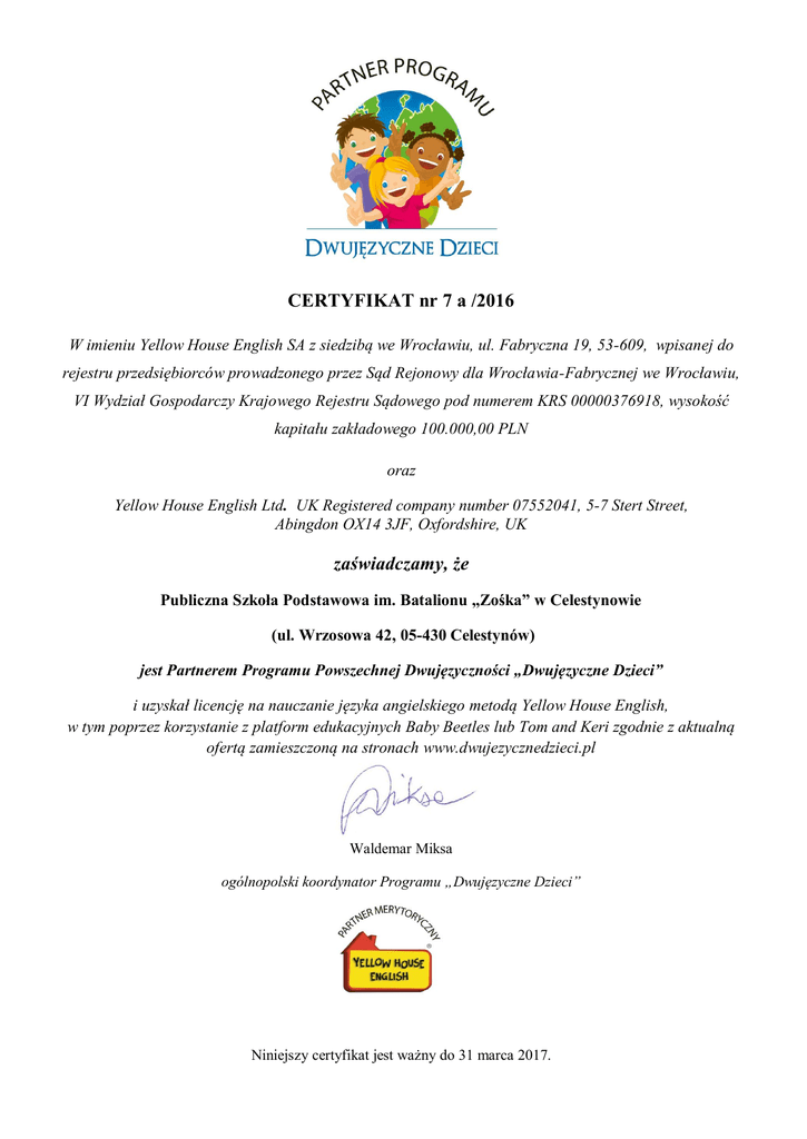 CERTYFIKAT nr 7 a /2016 W imieniu Yellow House English SA z siedzibą we Wrocławiu, ul. Fabryczna 19, 53-609, wpisanej do rejestru przedsiębiorców prowadzonego przez Sąd Rejonowy dla Wrocławia-Fabrycznej we Wrocławiu, VI Wydział Gospodarczy Krajowego Rejestru Sądowego pod numerem KRS 00000376918, wysokość kapitału zakładowego 100.000,00 PLN oraz Yellow House English Ltd. UK Registered company number 07552041, 5-7 Stert Street, Abingdon OX14 3JF, Oxfordshire, UK zaświadczamy, że Publiczna Szkoła Podstawowa im. Batalionu „Zośka” w Celestynowie (ul. Wrzosowa 42, 05-430 Celestynów) jest Partnerem Programu Powszechnej Dwujęzyczności „Dwujęzyczne Dzieci” i uzyskał licencję na nauczanie języka angielskiego metodą Yellow House English, w tym poprzez korzystanie z platform edukacyjnych Baby Beetles lub Tom and Keri zgodnie z aktualną ofertą zamieszczoną na stronach www.dwujezycznedzieci.pl Waldemar Miksa ogólnopolski koordynator Programu „Dwujęzyczne Dzieci” Niniejszy certyfikat jest ważny do 31 marca 2017. Zasady używania oznaczeń (logotypów) „Partner Programu Dwujęzyczne Dzieci” i „Yellow House English Partner Merytoryczny” dla celów promocyjnych żłobków, przedszkoli, klubów malucha, klubów mam itp. (dalej „instytucje oświatowe”) oraz materiałów nieodpłatnych Wymienione powyżej oznaczenia mogą być używane na stronach internetowych, folderach, ulotkach i ogłoszeniach reklamujących instytucję oświatową tylko jeżeli: 1. Instytucja oświatowa lub podmiot ją nadzorujący posiada aktualne poświadczenie uczestnictwa w Programie w formie umowy z Yellow House English SA lub aktualnego certyfikatu wydanego i podpisanego przez ogólnopolskiego koordynatora Programu Powszechnej Dwujęzyczności „Dwujęzyczne Dzieci”. 2. W przypadku braku aktualnego certyfikatu zezwolenie wygasa, a wszelkie materiały udostępnione nieodpłatnie winny niezwłocznie zostać przekazane koordynatorowi regionalnemu lub odesłane na adres: Yellow House English SA, ul. Fabryczna 19, 53-609 Wrocław. 3. Oznaczenia odnoszą się bezpośrednio do korzystania ze znaków towarowych i innych praw własności intelektualnej reprezentowanej przez Yellow House English. Oznaczenia NIE MOGĄ być używane do promocji jakichkolwiek innych usług nauczania języka angielskiego pochodzących od wydawców, nauczycieli, szkół językowych itp. innych niż Yellow House English, chyba że takie podmioty zostały zatwierdzone jako partnerzy programu Dwujęzyczne Dzieci i umieszczone na stronie internetowej programu dwujezycznedzieci.pl lub bilingualfuture.org. 4. Oznaczenia są używane zgodnie z zasadami określonymi i dostarczonymi przez Yellow House English Limited dotyczącymi koloru, formatu, tła i zastrzeżeniami prawnymi. Szczegółowe zasady i informacje są dostępne u upoważnionego przedstawiciela Yellow House English lub regionalnego koordynatora Programu Powszechnej Dwujęzyczności „Dwujęzyczne Dzieci”. 5. W przypadku nieprawidłowego używania oznaczeń, pomimo zwrócenia uwagi na ten fakt przez licencjodawcę, licencja może zostać wypowiedziana przez niego ze skutkiem natychmiastowym.