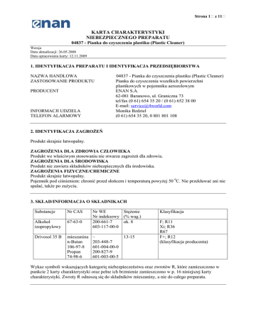 Strona 1 z 11 KARTA CHARAKTERYSTYKI NIEBEZPIECZNEGO PREPARATU 04837 - Pianka do czyszczenia plastiku (Plastic Cleaner) Wersja Data aktualizacji: 26.05.2008 Data opracowania karty: 12.11.2009 1. IDENTYFIKACJA PREPARATU I IDENTYFIKACJA PRZEDSIĘBIORSTWA NAZWA HANDLOWA ZASTOSOWANIE PRODUKTU PRODUCENT INFORMACJI UDZIELA TELEFON ALARMOWY 04837 - Pianka do czyszczenia plastiku (Plastic Cleaner) Pianka do czyszczenia wszelkich powierzchni plastikowych w pojemniku aerozolowym ENAN S.A. 62-081 Baranowo, ul. Graniczna 73 tel/fax (0 61) 654 35 20 / (0 61) 652 38 00 E-mail: [email protected] Monika Bzdziel (0 61) 654 35 20, 0 801 801 108 2. IDENTYFIKACJA ZAGROśEŃ Produkt skrajnie łatwopalny. ZAGROśENIA DLA ZDROWIA CZŁOWIEKA Produkt we właściwym stosowaniu nie stwarza zagroŜeń dla zdrowia. ZAGROśENIA DLA ŚRODOWISKA Produkt nie zawiera składników niebezpiecznych dla środowiska. ZAGROśENIA FIZYCZNE/CHEMICZNE Produkt skrajnie łatwopalny. Pojemnik pod ciśnieniem: chronić przed słońcem i temperaturą powyŜej 50 0C. Nie przekłuwać ani nie spalać, takŜe po zuŜyciu. 3. SKŁAD/INFORMACJA O SKŁADNIKACH Substancje Nr CAS Alkohol izopropylowy 67-63-0 Drivosol 35 B mieszanina n-Butan 106-97-8 Propan 74-98-6 Nr WE StęŜenie Nr indeksowy (% wag.) 200-661-7 ok. 8 603-117-00-0 – 203-448-7 601-004-00-0 200-827-9 601-003-00-5 13-15 Klasyfikacja F; R11 Xi; R36 R67 F+; R12 (klasyfikacja producenta) Wykaz symboli wskazujących kategorię niebezpieczeństwa oraz zwrotów R, które zamieszczono w punkcie 2 karty charakterystyki oraz pełne ich brzmienie zamieszczono w p. 16 niniejszej karty charakterystyki. Zwroty R odnoszą się do składników mieszaniny, a nie do całego preparatu. Strona 2 z 11 KARTA CHARAKTERYSTYKI NIEBEZPIECZNEGO PREPARATU 04837 - Pianka do czyszczenia plastiku (Plastic Cleaner) 4. PIERWSZA POMOC DROGI ODDECHOWE W razie zawrotów głowy lub nudności wyprowadzić poszkodowanego na świeŜe powietrze, w razie braku szybkiej poprawy zasięgnąć porady lekarza. KONTAKT ZE SKÓRĄ Zanieczyszczoną skórę przemyć duŜą ilością wody. Jeśli podraŜnienie skóry utrzymuje się zapewnić opiekę medyczną. KONTAKT Z OCZAMI Oczy płukać duŜą ilością wody ok. 15 min., skonsultować się z lekarzem. POŁKNIĘCIE Wypić duŜą ilość wody, nie powodować wymiotów, skonsultować się z lekarzem. 5. POSTĘPOWANIE W PRZYPADKU POśARU ODPOWIEDNIE ŚRODKI GAŚNICZE Woda – rozproszone prądy wodne, piana odporna na alkohol, dwutlenek węgla, proszki gaśnicze. ŚRODKI GAŚNICZE, KTÓRYCH NIE WOLNO UśYWAĆ ZE WZGLĘDÓW BEZPIECZEŃSTWA Nie stosować zwartych strumieni wody. Unikać stosowania halonów, aby nie skaŜać środowiska. SZCZEGÓLNE ZAGROśENIA Skrajnie łatwopalna ciecz. Woda moŜe być nieskutecznym środkiem gaśniczym. Powinna być uŜyta w celu ochłodzenia pojemników z preparatem, aby zapobiec wybuchowi. Pary mogą przemieszczać się wzdłuŜ podłoŜa do źródła zapłonu i spowodować wsteczny ciąg płomienia. Zbiorniki naraŜone na działanie ognia lub wysokiej temperatury chłodzić wodą z bezpiecznej odległości; jeśli to moŜliwe, usunąć je z obszaru zagroŜenia (groźba wybuchu). NIEBEZPIECZNE PRODUKTY ROZKŁADU W wyniku spalania mogą powstawać tlenki węgla (CO, CO2). SPECJALNE WYPOSAśENIE OCHRONNE DLA STRAśAKÓW Podczas poŜaru mogą powstawać substancje szkodliwe dla zdrowia. NałoŜyć odzieŜ ochronną gazoszczelną i aparat izolujący drogi oddechowe (aparat tlenowy skompletowany z maską). INNE INFORMACJE Nie dopuścić do przedostania się środków gaśniczych do kanalizacji i cieków wodnych. Zawiadomić otoczenie o poŜarze. Usunąć z obszaru zagroŜenia wszystkie osoby nie biorące udziału w likwidowaniu poŜaru. Powiadomić Państwową StraŜ PoŜarną, a w razie konieczności takŜe Policję Państwową, najbliŜsze władze terenowe i najbliŜszą jednostkę Ratownictwa Chemicznego. Strona 3 z 11 KARTA CHARAKTERYSTYKI NIEBEZPIECZNEGO PREPARATU 04837 - Pianka do czyszczenia plastiku (Plastic Cleaner) 6. POSTĘPOWANIE W PRZYPADKU NIEZAMIERZONEGO UWOLNIENIA DO ŚRODOWISKA INDYWIDUALNE ŚRODKI OSTROśNOŚCI Zadbać o wystarczające wietrzenie, stosować rękawice ochronne z kauczuku butylowego, gumy nitrylowej lub neoprenu, stosować kauczukowe obuwie ochronne oraz ubranie ochronne, stosować okulary ochronne lub maskę zabezpieczającą twarz w przypadku moŜliwości rozchlapywania roztworu produktu. ŚRODKI OSTROśNOŚCI W ZAKRESIE OCHRONY ŚRODOWISKA W razie awarii nie dopuszczać do zrzutów do środowiska. Zabezpieczyć produkt przed przedostaniem się do kanałów ściekowych, wód powierzchniowych i gruntowych oraz do gleby. Próbować zebrać jak tylko to moŜliwe, do odpowiednich pojemników celem dalszej utylizacji. METODY OCZYSZCZANIA Produkt znajduje się w hermetycznie zamkniętych pojemnikach aerozolowych – wyciek jest mało prawdopodobny. W razie uszkodzenia pojemnika usunąć z otoczenia źródła ognia i zapewnić dobrą wentylację. Wyciek zebrać za pomocą obojętnych absorbentów np. piasku. Umieścić w odpowiednim pojemniku i przekazać do utylizacji. 7. POSTĘPOWANIE Z PREPARATEM I JEGO MAGAZYNOWANIE POSTĘPOWANIE Z PREPARATEM Stosować tylko w pomieszczeniach dobrze wentylowanych – wymagana wentylacja przypodłogowa, nie magazynować w szczelnych zamkniętych pomieszczeniach. Unikać kontaktu z oczami. Unikać przedłuŜonego lub powtarzającego się kontaktu ze skórą. Unikać rozlewania. Unikać źródeł zapłonu, podwyŜszonej temperatury, gorących powierzchni i otwartego ognia. Chronić przed wyładowaniami elektrostatycznymi, upewnić się czy oświetlenie elektryczne i instalacja elektryczna są sprawne i nie stanowią potencjalnego źródła zapłonu. Nie stosować narzędzi skrawających powodujących iskrzenie. Unikać wdychania oparów/aerozoli produktu. Do wszystkich specyficznych rekomendacji kontrolowania zagroŜeń przeprowadzić ocenę ryzyka zawodowego na stanowisku pracy w celu