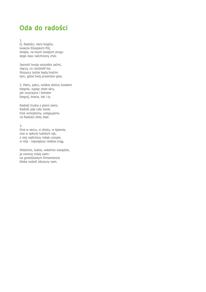 Oda do radości 1. O, Radości, iskro bogów, kwiecie Elizejskich Pól, święta, na twym świętym progu staje nasz natchniony chór. Jasność twoja wszystko zaćmi, złączy, co rozdzielił los. Wszyscy ludzie będą braćmi tam, gdzie twój przemówi głos. 2. Patrz, patrz, biegnie, sypiąc jak zwycięzca i biegnij, bracie, wielkie słońce światem złote skry, bohater tak i ty. Radość tryska z piersi ziemi, Radość pije cały świat. Dziś wchodzimy, wstępujemy na Radości złoty ślad. 3. Ona w sercu, w zbożu, w śpiewie, ona w splocie ludzkich rąk, z niej najlichszy robak czerpie, w niej - największy niebios krąg. Wstańcie, ludzie, wstańcie wszędzie, ja nowinę niosę wam: na gwieździstym firmamencie bliska radość błyszczy nam.