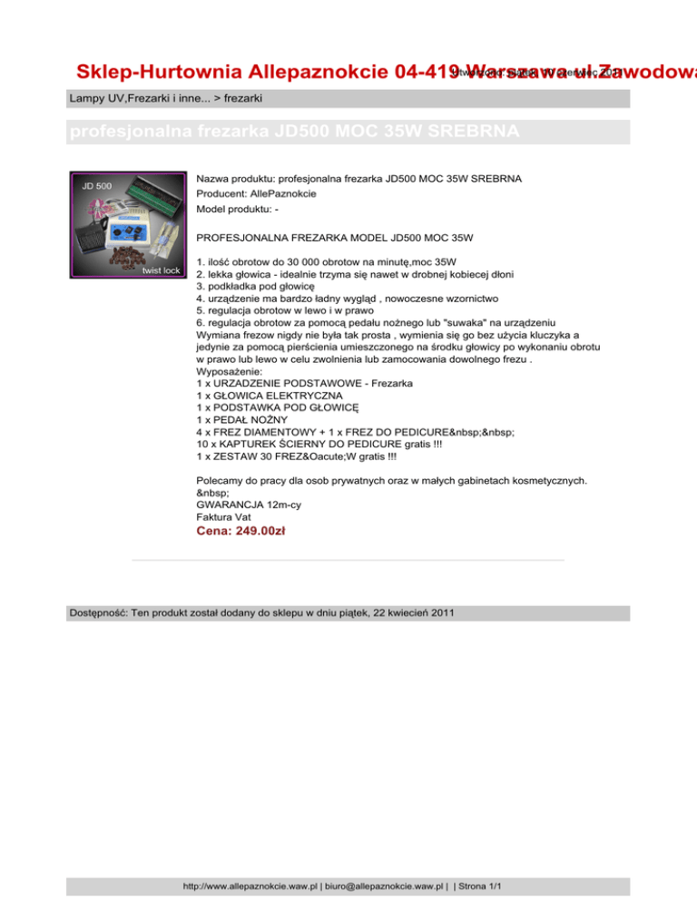piątek, 10 czerwiec 2011 Sklep-Hurtownia Allepaznokcie 04-419Utworzono: Warszawa ul.Zawodowa Lampy UV,Frezarki i inne... > frezarki profesjonalna frezarka JD500 MOC 35W SREBRNA Nazwa produktu: profesjonalna frezarka JD500 MOC 35W SREBRNA Producent: AllePaznokcie Model produktu: PROFESJONALNA FREZARKA MODEL JD500 MOC 35W 1. ilość obrotow do 30 000 obrotow na minutę,moc 35W 2. lekka głowica - idealnie trzyma się nawet w drobnej kobiecej dłoni 3. podkładka pod głowicę 4. urządzenie ma bardzo ładny wygląd , nowoczesne wzornictwo 5. regulacja obrotow w lewo i w prawo 6. regulacja obrotow za pomocą pedału nożnego lub "suwaka" na urządzeniu Wymiana frezow nigdy nie była tak prosta , wymienia się go bez użycia kluczyka a jedynie za pomocą pierścienia umieszczonego na środku głowicy po wykonaniu obrotu w prawo lub lewo w celu zwolnienia lub zamocowania dowolnego frezu . Wyposażenie: 1 x URZADZENIE PODSTAWOWE - Frezarka 1 x GŁOWICA ELEKTRYCZNA 1 x PODSTAWKA POD GŁOWICĘ 1 x PEDAŁ NOŻNY 4 x FREZ DIAMENTOWY + 1 x FREZ DO PEDICURE 10 x KAPTUREK ŚCIERNY DO PEDICURE gratis !!! 1 x ZESTAW 30 FREZÓW gratis !!! Polecamy do pracy dla osob prywatnych oraz w małych gabinetach kosmetycznych. GWARANCJA 12m-cy Faktura Vat Cena: 249.00zł Dostępność: Ten produkt został dodany do sklepu w dniu piątek, 22 kwiecień 2011 http://www.allepaznokcie.waw.pl | [email protected] | | Strona 1/1