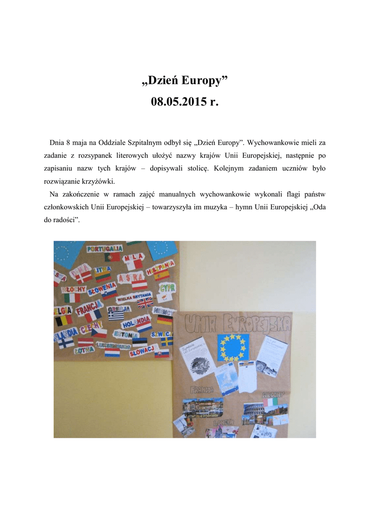 „Dzień Europy” 08.05.2015 r. Dnia 8 maja na Oddziale Szpitalnym odbył się „Dzień Europy”. Wychowankowie mieli za zadanie z rozsypanek literowych ułożyć nazwy krajów Unii Europejskiej, następnie po zapisaniu nazw tych krajów – dopisywali stolicę. Kolejnym zadaniem uczniów było rozwiązanie krzyżówki. Na zakończenie w ramach zajęć manualnych wychowankowie wykonali flagi państw członkowskich Unii Europejskiej – towarzyszyła im muzyka – hymn Unii Europejskiej „Oda do radości”.