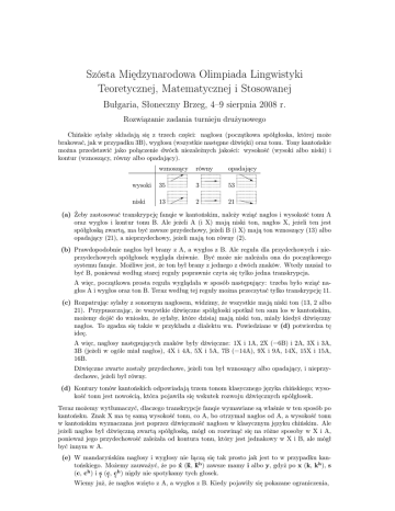 Szósta Międzynarodowa Olimpiada Lingwistyki Teoretycznej, Matematycznej i Stosowanej Bułgaria, Słoneczny Brzeg, 4–9 sierpnia 2008 r. Rozwiązanie zadania turnieju drużynowego Chińskie sylaby składają się z trzech części: nagłosu (początkowa spółgłoska, której może brakować, jak w przypadku 3B), wygłosu (wszystkie następne dźwięki) oraz tonu. Tony kantońskie można przedstawić jako połączenie dwóch niezależnych jakości: wysokość (wysoki albo niski) i kontur (wznoszący, równy albo opadający). wysoki niski wznoszący " !! 35 13 ! ! " równy 3 2 # # opadający $$ % 53 21 && ' (a) Żeby zastosować transkrypcję fanqie w kantońskim, należy wziąć nagłos i wysokość tonu A oraz wygłos i kontur tonu B. Ale jeżeli A (i X) mają niski ton, nagłos X, jeżeli ten jest spółgłoską zwartą, ma być zawsze przydechowy, jeżeli B (i X) mają ton wznoszący (13) albo opadający (21), a nieprzydechowy, jeżeli mają ton równy (2). (b) Prawdopodobnie nagłos był brany z A, a wygłos z B. Ale reguła dla przydechowych i nieprzydechowych spółgłosek wygląda dziwnie. Być może nie należała ona do początkowego systemu fanqie. Możliwe jest, że ton był brany z jednego z dwóch znaków. Wtedy musiał to być B, ponieważ według starej reguły poprawnie czyta się tylko jedna transkrypcja. A więc, początkowa prosta reguła wyglądała w sposób następujący: trzeba było wziąć nagłos A i wygłos oraz ton B. Teraz według tej reguły można przeczytać tylko transkrypcję 11. (c) Rozpatrując sylaby z sonornym nagłosem, widzimy, że wszystkie mają niski ton (13, 2 albo 21). Przypuszczając, że wszystkie dźwięczne spółgłoski spotkał ten sam los w kantońskim, możemy dojść do wniosku, że sylaby, które dzisiaj mają niski ton, miały kiedyś dźwięczny nagłos. To zgadza się także w przykładu z dialektu wu. Powiedziane w (d) potwierdza tę ideę. A więc, nagłosy następujących znaków były dźwięczne: 1X i 1A, 2X (=6B) i 2A, 3X i 3A, 3B (jeżeli w ogóle miał nagłos), 4X i 4A, 5X i 5A, 7B (=14A), 9X i 9A, 14X, 15X i 15A, 16B. Dźwięczne zwarte zostały przydechowe, jeżeli ton był wznoszący albo opadający, i nieprzydechowe, jeżeli był równy. (d) Kontury tonów kantońskich odpowiadają trzem tonom klasycznego języka chińskiego; wysokość tonu jest nowością, która pojawiła się wskutek rozwoju dźwięcznych spółgłosek. Teraz możemy wytłumaczyć, dlaczego transkrypcje fanqie wymawiane są właśnie w ten sposób po kantońsku. Znak X ma tę samą wysokość tonu, co A, bo otrzymał nagłos od A, a wysokość tonu w kantońskim wyznaczana jest poprzez dźwięczność nagłosu w klasycznym języku chińskim. Ale jeżeli nagłos był dźwięczną zwartą spółgłoską, mógł on rozwinąć się na różne sposoby w X i A, ponieważ jego przydechowość zależała od kontura tonu, który jest jednakowy w X i B, ale mógł być innym w A. (e) W mandaryńskim nagłosy i wygłosy nie łączą się tak prosto jak jest to w przypadku kantońskiego. Możemy zauważyć, że po x́ (ḱ, ḱh ) zawsze mamy i albo y, gdyż po x (k, kh ), s (c, ch ) i s (c, ch ) nigdy nie spotykamy tych głosek. ‘ ‘ ‘ Wiemy już, że nagłos wzięto z A, a wygłos z B. Kiedy pojawiły się pokazane ograniczenia, 2 Szósta Międzynarodowa Olimpiada Lingwistyki (2008). Rozwiązanie zadania turnieju drużynowego • i wypadło, y stało u po s (c, ch ); ‘ ‘ ‘ • x (k, kh ) i s (c, ch ) przeszły w x́ (ḱ, ḱh ) przed i albo y. Tych samych reguł stosujemy, kiedy czytamy transkrypcje fanqie po mandaryńsku. Jednak • jeżeli nagłos A jest x́ (ḱ, ḱh ), a wygłos B nie zaczyna się ani z i, ani z y, nie ma możliwości wyznaczyć nagłos X; • jeżeli nagłos B jest s (c, ch ), a nagłos A nie jest jednym z tych dźwięków, nie ma ‘ ‘ ‘ możliwości wyznaczyć wygłos X. (f ) Na podstawie tona sylaby kantońskiej można wyznaczyć, czy nagłos był dźwięczny czy bezdźwięczny w klasycznej chińszczyźnie. Tony w mandaryńskim rozwijały się w sposób następujący: • wznoszący: 51, jeżeli nagłos był dźwięczny, ale nie sonorny, w innym przypadku 214; • równy: 51 (zawsze); • opadający: 5, jeżeli nagłos był bezdźwięczny, w innym przypadku 35. Jak widać, kontur tutaj nie został zachowany. Dźwięczne zwarte zostały przydechowe, jeżeli ton był opadający, i nieprzydechowe, jeżeli był równy albo wznoszący. Przy czytaniu transkrypcji fanqie po mandaryńsku sprawy z tonami wyglądają następująco: 5 L (F, H+)35 L214 (F, H±)214 L51 H+51 (F, H−)51 35 5, 35 5 35 35 35 5 35 5 5, 35 214 214 214 51 214 214 214 214 214, 51 (F, H−)51 214, 51 214, 51 51 214, 51 214, 51 214, 51 214, 51 214, 51 (H+, L)51 51 51 51 51 51 51 51 51 Tutaj L oznacza spółgłoskę sonorną, F szczelinową, H− zwartą nieprzydechową, a H+ przydechową. A więc w większości przypadków nie można jednoznacznie wyznaczyć, jaki jest ton X w mandaryńskim na podstawie tonów A i B, chociaż w niektórych przypadkach to jest możliwe. (g) Sylaby z nagłosem sonornym i tonem 5, a także z nieprzydechowym nagłosem i tonem 35 nie powinny istnieć w mandaryńskim (jeżeli takie są, to znaczy, że reguły miałyby mieć wyjątki). (h) 46: 21, 47: 51, 48: 13, 49: 35, 50: 53, 51: 2. (i) 52 th ai53 , 53 siu3 , 54 loN2 , 55 paai2 . (j) 56 sai51 , 57 ḱian214 , 58 saN214 , 59 ph ai214 , 60 x́yan51 , 61 ḱh yan214 , 62 x́ia51 , 63 xan51 , ‘ 64 cou51 , 65 naN35 , 66 sai5 . ‘