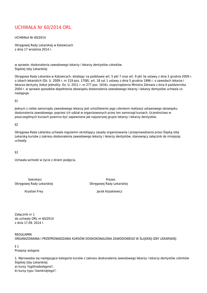 UCHWAŁA Nr 60/2014 ORL UCHWAŁA Nr 60/2014 Okręgowej Rady Lekarskiej w Katowicach z dnia 17 września 2014 r. w sprawie: doskonalenia zawodowego lekarzy i lekarzy dentystów członków Śląskiej Izby Lekarskiej Okręgowa Rada Lekarska w Katowicach, działając na podstawie art. 5 pkt 7 oraz art. 9 pkt 3a ustawy z dnia 2 grudnia 2009 r. o izbach lekarskich (Dz. U. 2009 r. nr 219 poz. 1708), art. 18 ust 1 ustawy z dnia 5 grudnia 1996 r. o zawodach lekarza i lekarza dentysty (tekst jednolity: Dz. U. 2011 r. nr 277 poz. 1634), rozporządzenia Ministra Zdrowia z dnia 6 października 2004 r. w sprawie sposobów dopełnienia obowiązku doskonalenia zawodowego lekarzy i lekarzy dentystów uchwala co następuje: §1 Jednym z celów samorządu zawodowego lekarzy jest umożliwienie jego członkom realizacji ustawowego obowiązku doskonalenia zawodowego, poprzez ich udział w organizowanych przez ten samorząd kursach. Uczestnictwo w poszczególnych kursach powinno być zapewnione jak najszerszej grupie lekarzy i lekarzy dentystów. §2 Okręgowa Rada Lekarska uchwala regulamin określający zasady organizowania i przeprowadzania przez Śląską Izbę Lekarską kursów z zakresu doskonalenia zawodowego lekarzy i lekarzy dentystów, stanowiący załącznik do niniejszej uchwały. §3 Uchwała wchodzi w życie z dniem podjęcia. Sekretarz Okręgowej Rady Lekarskiej Prezes Okręgowej Rady Lekarskiej Krystian Frey Jacek Kozakiewicz Załącznik nr 1 do uchwały ORL nr 60/2014 z dnia 17.09. 2014 r. REGULAMIN ORGANIZOWANIA I PRZEPROWADZANIA KURSÓW DOSKOKONALENIA ZAWODOWEGO W ŚLĄSKIEJ IZBY LEKARSKIEJ §1 Przepisy wstępne 1. Wprowadza się następujące kategorie kursów z zakresu doskonalenia zawodowego lekarzy i lekarzy dentystów członków Śląskiej Izby Lekarskiej: a) kursy ?ogólnodostępne?, b) kursy typu ?zamkniętego?. §2 Kursy ?ogólnodostępne? 1. Kursy ?ogólnodostępne? są kursami organizowanymi dla bliżej nieokreślonej liczby uczestników, ograniczonej jedynie względami techniczno-organizacyjnymi. Dokładna liczba uczestników nie jest znana przed odbyciem się kursu. Możliwe jest jednak wstępne zgłaszanie zamiaru uczestnictwa przez osoby zainteresowane, które nie ma charakteru wiążącego. Kursy mają charakter nieodpłatny. Pomiędzy uczestnikiem szkolenia a ŚIL nie dochodzi do zawarcia umowy o szkolenie i nie jest znana wartość świadczenia niepieniężnego przypadającego na konkretnego uczestnika. 2. Ogłoszenie o kursie w swojej treści powinno zawierać informację o tematyce kursu, miejscu i dacie przeprowadzenia kursu, liczbie punktów edukacyjnych przyznawanych z tytułu uczestnictwa. 3. Śląska Izba Lekarska wydaje certyfikaty uczestnictwa na podstawie prowadzonej podczas kursu listy pod nazwą ?certyfikat uczestnictwa?, osobom które zgłoszą chęć potwierdzenia uzyskania punktów szkoleniowych. §3 Kursy typu ?zamkniętego? 1. Kursy typu ?zamkniętego? są szkoleniami o ograniczonej liczbie miejsc. Udział w szkoleniu jest uzależniony od uprzedniej rejestracji oraz uiszczenia opłaty rejestracyjnej stanowiącej odzwierciedlenie kosztów materiałów zużywalnych. Poprzez rejestrację, uiszczenie opłaty rejestracyjnej i potwierdzenie zakwalifikowania uczestnika do udziału w danym kursie dochodzi do zawarcia pomiędzy ŚIL, a uczestnikiem umowy o szkolenie. Umowa nie ma formy pisemnej. 2. Z tytułu uiszczenia opłaty rejestracyjnej, stanowiącej odzwierciedlenie kosztów materiałów zużywalnych wystawiana jest faktura VAT. 3. Ogłoszenie o kursie w swojej treści powinno zawierać informację o tematyce kursu, miejscu i dacie przeprowadzenia kursu, liczbie punktów edukacyjnych przyznawanych z tytułu uczestnictwa. W przypadku gdy w momencie zamieszczenia ogłoszenia o kursie znana jest konkretna wartość świadczenia niepieniężnego jaka przypada na danego uczestnika, rodząca konsekwencje podatkowe, ogłoszenie w swojej treści powinno zawierać informację o wysokości tego świadczenia. 4. W przypadku gdy w momencie zamieszczenia ogłoszenia o kursie znana jest konkretna wartość świadczenia niepieniężnego jaka przypada na danego uczestnika, Śląska Izba Lekarska zobowiązana jest do sporządzenia informacji PIT-8C, z zastrzeżeniem pkt 6. 5. Śląska Izba Lekarska wydaje certyfikaty uczestnictwa na podstawie prowadzonej listy pod nazwą ?certyfikat uczestnictwa?, osobom które zgłoszą chęć potwierdzenia uzyskania punktów szkoleniowych. 6. W przypadku kursów, o których mowa w niniejszym paragrafie finansowanych lub współfinansowanych ze środków budżetu państwa, jednostek samorządu terytorialnego, ze środków agencji rządowych lub ze środków pochodzących od rządów państw obcych, organizacji międzynarodowych lub międzynarodowych instytucji finansowych, w ramach rządowych programów, w tym z funduszy strukturalnych Unii Europejskiej, Śląska Izba Lekarska nie sporządza informacji PIT-8C. Sekretarz Okręgowej Rady Lekarskiej Krystian Frey Prezes Okręgowej Rady Lekarskiej Jacek Kozakiewicz Podmiot udostępniający informację Okregowa Rada Lekarska Autor/Data powstania Jacek Kozakiewicz 2014-09-17 Wprowadził/Data wprowadzenia Tomasz Gawlik 2014-11-15 Ostatnia zmiana/ data zmiany Tomasz Gawlik 2014-11-15 Ilość odsłon artykułu 2589