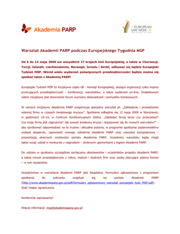 Warsztat Akademii PARP podczas Europejskiego Tygodnia MSP Od 6 do 14 maja 2009 we wszystkich 27 krajach Unii Europejskiej, a takŜe w Chorwacji, Turcji, Islandii, Liechtensteinie, Norwegii, Izraelu i Serbii, odbywać się będzie Europejski Tydzień MSP. Wśród wielu wydarzeń poświęconych przedsiębiorczości będzie moŜna się spotkać takŜe z Akademią PARP! Europejski Tydzień MŚP to inicjatywa rządu UE - Komisji Europejskiej, słuŜąca organizacji cyklu imprez promujących przedsiębiorczość - konferencji, warsztatów, a takŜe wydarzeń on-line. Dodatkowym celem inicjatywy jest stworzenie forum wymiany doświadczeń i pomysłów biznesowych. W ramach inicjatywy Akademia PARP zorganizuje specjalny warsztat pt. „Zakładanie i prowadzenie własnej firmy w czasach światowego kryzysu”. Spotkanie odbędzie się 12 maja 2009 w Warszawie, w godzinach 10-14, w Centrum Konferencyjnym Zielna. „Zakładać firmę teraz czy przeczekać? Czy moja firma jest zagroŜona? Jak oswoić światowy kryzys i dopasować się do nowych warunków?” aby spróbować odpowiedzieć na te trudne i aktualne pytania, w programie spotkania zaplanowaliśmy wykład ekspercki, zapowiedź nowego szkolenia Akademii PARP oraz warsztat komputerowy prezentację obecnych moŜliwości portalu Akademia PARP. Uczestnicy warsztatu będą mogli takŜe wziąć udział w konkursie z nagrodami – drobnymi upominkami z logiem Akademii PARP. Do udziału w spotkaniu szczególnie zachęcamy absolwentów i uczestników projektu Akademii PARP, a takŜe innych przedsiębiorców z mikro, małych i średnich firm oraz osoby planujące własny biznes – w tym studentów. Uczestnictwo w warsztacie Akademii PARP jest bezpłatne. Formularz zgłoszeniowy z programem spotkania do pobrania znajduje się na portalu Akademii PARP (http://www.akademiaparp.gov.pl/pdf/formularz_zgloszeniowy_warsztat_europejski_tydz_MSP.pdf). Ilość miejsc ograniczona. Serdecznie zapraszamy! Więcej informacji: [email protected] Infolinia 0-801 444 MSP (czyli 0-801 444 677)