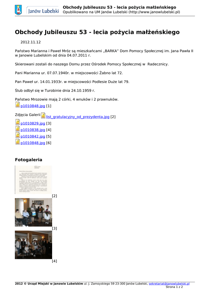 Obchody Jubileuszu 53 - lecia pożycia małżeńskiego Opublikowano na UM Janów Lubelski (http://www.janowlubelski.pl) Obchody Jubileuszu 53 - lecia pożycia małżeńskiego 2012.11.12 Państwo Marianna i Paweł Mróz są mieszkańcami „BARKA” Dom Pomocy Społecznej im. Jana Pawła II w Janowie Lubelskim od dnia 04.07.2011 r. Skierowani zostali do naszego Domu przez Ośrodek Pomocy Społecznej w Radecznicy. Pani Marianna ur. 07.07.1940r. w miejscowości Żabno lat 72. Pan Paweł ur. 14.01.1933r. w miejscowości Podlesie Duże lat 79. Ślub odbył się w Turobinie dnia 24.10.1959 r. Państwo Mrozowie mają 2 córki, 4 wnuków i 2 prawnuków. p1010848.jpg [1] Zdjęcia Galerii list_gratulacyjny_od_prezydenta.jpg [2] p1010829.jpg [3] p1010838.jpg [4] p1010842.jpg [5] p1010848.jpg [6] Fotogaleria [2] [3] [4] 2012 © Urząd Miejski w Janowie Lubelskim ul. J. Zamoyskiego 59 23-300 Janów Lubelski, [email protected] Strona 1 z 2 Obchody Jubileuszu 53 - lecia pożycia małżeńskiego Opublikowano na UM Janów Lubelski (http://www.janowlubelski.pl) [5] [6] Linki: [1] http://www.janowlubelski.pl/sites/default/files/news/images/p1010848_0.jpg [2] http://www.janowlubelski.pl/sites/default/files/gallery/gallery_images/list_gratulacyjny_od_prezyde nta.jpg [3] http://www.janowlubelski.pl/sites/default/files/gallery/gallery_images/p1010829.jpg [4] http://www.janowlubelski.pl/sites/default/files/gallery/gallery_images/p1010838.jpg [5] http://www.janowlubelski.pl/sites/default/files/gallery/gallery_images/p1010842.jpg [6] http://www.janowlubelski.pl/sites/default/files/gallery/gallery_images/p1010848_0.jpg 2012 © Urząd Miejski w Janowie Lubelskim ul. J. Zamoyskiego 59 23-300 Janów Lubelski, [email protected] Strona 2 z 2 Powered by TCPDF (www.tcpdf.org)