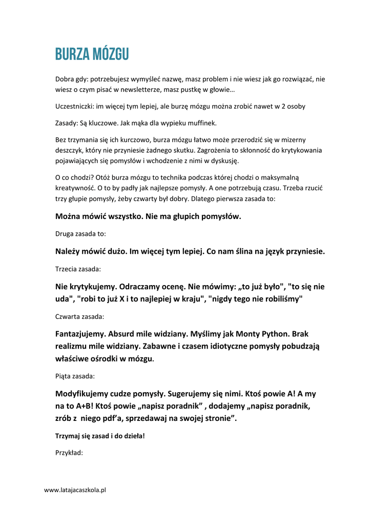 BURZA MÓZGU Dobra gdy: potrzebujesz wymyśleć nazwę, masz problem i nie wiesz jak go rozwiązać, nie wiesz o czym pisać w newsletterze, masz pustkę w głowie… Uczestniczki: im więcej tym lepiej, ale burzę mózgu można zrobić nawet w 2 osoby Zasady: Są kluczowe. Jak mąka dla wypieku muffinek. Bez trzymania się ich kurczowo, burza mózgu łatwo może przerodzić się w mizerny deszczyk, który nie przyniesie żadnego skutku. Zagrożenia to skłonność do krytykowania pojawiających się pomysłów i wchodzenie z nimi w dyskusję. O co chodzi? Otóż burza mózgu to technika podczas której chodzi o maksymalną kreatywność. O to by padły jak najlepsze pomysły. A one potrzebują czasu. Trzeba rzucić trzy głupie pomysły, żeby czwarty był dobry. Dlatego pierwsza zasada to: Można mówić wszystko. Nie ma głupich pomysłów. Druga zasada to: Należy mówić dużo. Im więcej tym lepiej. Co nam ślina na język przyniesie. Trzecia zasada: Nie krytykujemy. Odraczamy ocenę. Nie mówimy: „to już było", "to się nie uda", "robi to już X i to najlepiej w kraju", "nigdy tego nie robiliśmy" Czwarta zasada: Fantazjujemy. Absurd mile widziany. Myślimy jak Monty Python. Brak realizmu mile widziany. Zabawne i czasem idiotyczne pomysły pobudzają właściwe ośrodki w mózgu. Piąta zasada: Modyfikujemy cudze pomysły. Sugerujemy się nimi. Ktoś powie A! A my na to A+B! Ktoś powie „napisz poradnik” , dodajemy „napisz poradnik, zrób z niego pdf’a, sprzedawaj na swojej stronie”. Trzymaj się zasad i do dzieła! Przykład: www.latajacaszkola.pl Uczestniczka Latającej Szkoły, której grupa docelowa to zamożne kobiety w średnim wieku, spytała: Dziewczyny, nie mam kontaktu z takim sferami. Jak dotrzeć do moich potencjalnych klientek? Jedna z odpowiedzi z burzy mózgu: „Zacznij chodzić do drogiej kosmetyczki. Opowiadaj o tym co robisz. Zostaw wizytówki. Salony kosmetyczne to węzły networkingowe.” PANI, PAMIĘTAJ! TO TY JESTEŚ SĘDZIĄ I KRÓLOWĄ W JEDNEJ OSOBIE. TY TUTAJ DECYDUJESZ. PODZIĘKUJ ZA POMOC I PODEJMIJ DECYZJĘ ZGODNIE Z GŁOSEM SWOJEGO ROZUMU, SWOJEGO SERCA, SWOJEJ INTUICJI. www.latajacaszkola.pl