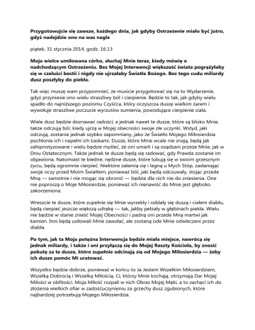Przygotowujcie się zawsze, każdego dnia, jak gdyby Ostrzeżenie miało być jutro, gdyż nadejdzie ono na was nagle piątek, 31 stycznia 2014, godz. 16.13 Moja wielce umiłowana córko, słuchaj Mnie teraz, kiedy mówię o nadchodzącym Ostrzeżeniu. Bez Mojej Interwencji większość świata pogrążyłaby się w czeluści bestii i nigdy nie ujrzałaby Światła Bożego. Bez tego cudu miliardy dusz poszłyby do piekła. Tak więc muszę wam przypomnieć, że musicie przygotować się na to Wydarzenie, gdyż przyniesie ono wielu straszliwy ból i cierpienie. Będzie to tak, jak gdyby wielu spadło do najniższego poziomu Czyśćca, który oczyszcza duszę wielkim żarem i wywołuje straszliwe poczucie wyrzutów sumienia, powodujące cierpienie ciała. Wiele dusz będzie doznawać radości; a jednak nawet te dusze, które są blisko Mnie, także odczują ból, kiedy ujrzą w Mojej obecności swoje złe uczynki. Wstyd, jaki odczują, zostanie jednak szybko zapomniany, jako że Światło Mojego Miłosierdzia pochłonie ich i napełni ich Łaskami. Dusze, które Mnie wcale nie znają, będą jak zahipnotyzowane i wielu będzie myśleć, że oni umarli i są osądzani przeze Mnie, jak w Dniu Ostatecznym. Także jednak te dusze będą się radować, gdy Prawda zostanie im objawiona. Natomiast te biedne, nędzne dusze, które lubują się w swoim grzesznym życiu, będą ogromnie cierpieć. Niektóre załamią się i legną u Mych Stóp, zasłaniając swoje oczy przed Moim Światłem, ponieważ ból, jaki będą odczuwały, stojąc przede Mną — samotnie i nie mogąc się obronić — będzie dla nich nie do zniesienia. One nie poproszą o Moje Miłosierdzie, ponieważ ich nienawiść do Mnie jest głęboko zakorzeniona. Wreszcie te dusze, które zupełnie się Mnie wyrzekły i oddały się duszą i ciałem diabłu, będą cierpieć jeszcze większą udrękę — tak, jakby pełzały w głębinach piekła. Wielu nie będzie w stanie znieść Mojej Obecności i padną oni przede Mną martwi jak kamień. Inni będą usiłowali Mnie zawołać, ale zostaną ode Mnie odwleczeni przez diabła. Po tym, jak ta Moja potężna Interwencja będzie miała miejsce, nawrócą się jednak miliardy, i także i oni przyłączą się do Mojej Reszty Kościoła, by znosić pokutę za te dusze, które zupełnie odcinają się od Mojego Miłosierdzia — żeby ich dusze pomóc Mi uratować. Wszystko będzie dobrze, ponieważ w końcu to Ja Jestem Wszelkim Miłosierdziem, Wszelką Dobrocią i Wszelką Miłością. Ci, którzy Mnie kochają, otrzymają Dar Mojej Miłości w obfitości. Moja Miłość rozpali w nich Obraz Mojej Męki, a to zachęci ich do złożenia wielkich ofiar w zadośćuczynieniu za grzechy dusz zgubionych, które najbardziej potrzebują Mojego Miłosierdzia. Przygotowujcie się zawsze, każdego dnia, jak gdyby Ostrzeżenie miało być jutro, gdyż nadejdzie ono na was nagle. Wasz Jezus