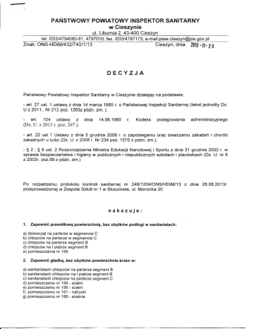PANSTWOWYPOWIATOWY INSPEKTOR SANITARNY w Cieszynie ul. Liburnia 2, 43-400 Cieszyn 4797010; fax. 1033/4797173; e-mail:[email protected] tel. 1033/4794080-81, Znak: ONS-HDiM/4321740/1/13 Cieszyn, - art. 27 ust. 1 ustawy z dnia 14 marca 1985 r. U z 2011,. Nr 212 poz. 1263z pMn. zm. ), art. 104 ustawy z dnia 0 14.06.1960 dnia 2013 -H-10 Panstwowej Inspekcji Sanitarnej (tekst jednolity Oz. r. Kodeks post~powania administracyjnego (Dz. U. z 2013 r. paz. 267.), - art. 22 ust 1 Ustawy z dnia 5 grudnia 2008 r. 0 zapobieganiu oraz zwalczaniu zakazen i chor6b zakaznych u ludzi (Oz. U. z 2008 r. Nr 234 poz. 15.70 z p6zn. zm.), - § 2 ; § 8 ust. 2 Rozporzqdzenia Ministra Edukacji Narodowej i Sportu z dnia 31 grudnia 2002 r. w sprawie bezpieczenstwa i higieny w publicznych i niepublicznych szkofach i plac6wkach (Oz. U. nr 6 z 2003r. poz.69 z p6zn. zm.) Po rozpatrzeniu protokofu kontroli sanitarnej nr 248/1204/0NS/HOiM/13 przeprowadzonej w Zespole Szk6f nr 1 w Skoczowie, ul. Morcinka 20 a) b) c) d) e) dziewczqt na parterze w segmencie C chfopcow na parterze w segmencie C chfopcow na parterze segment B chfopcow na I pi~trze segment B pomieszczenia nr 199 a) b) c) d) e) f) g) sanitariatach chfopcow na parterze segment B sanitariatach chfopcow na I pi~trze segment B sanitariatach chfopcow na parterze segment C pomieszczeniu nr 199 - szatni pomieszczeniu nr 196 - szatni pomieszczeniu nr 191 - natryski pomieszczeniu nr 188 - szatnia z dnia 28.08.2013r. a) b) c) d) e) f) g) pomieszczeniu nr 199 - we pomieszczeniu nr 199 - natryski pomieszczeniu nr 196 - we pomieszczeniu nr 196 - natryski pomieszczeniu nr 191 - natryski sanitariatach dla dziewczqt na parterze segment B sanitariatach dla dziewczqt na II piE;ltrzesegment B a) b) c) d) e) f) dla dziewczqt na I piE;ltrzesegment B dla dziewczqt na II piE;ltrzesegment B dla chtopc6w na II piE;ltrzesegment B dla dZiewczqt na parterze segment pomieszczenia nr 191 pomieszczenia nr 188 e a) pomieszczeniu b) pomieszczeniu a) b) c) d) 7. nr 191 nr 188 pomieszczeniu nr 191 - szatnia pomieszczeniu nr 196 - natryski pomieszczeniu sanitariat6w dla dziewczqt na II piE;ltrzesegment B pomieszczeniu sanitariat6w na II piE;ltrzesegment F Zapewnic prawidfowy stan techniczny, (bez ubytk6w farby, zniszczonych scianek dziafowych kabin ubikacyjnych w: i ruchomych e!ement6w) a) sanitariatach na II piE;ltrzesegment F b) sanitariatach dla dziewczqt na I piE;ltrzesegment B a) pomieszczeniu nr 196 - natryski b) pomieszczeniu nr 198 - natryski c) pomieszczeniu nr 199 - natryski 9. Zapewnic prawidfowy stan techniczny (bez zardzewien) grzejnik6w centralnego ogrzewania oraz rurwodnych w pomieszczeniu natrysk6wnr 199. Wymienione Punkty 1a, Punkty 1c, Punkty 1e; obowiqzki nalezy wykonac w terminie: b; 2c; 4d; Gd; 7a - do dnia 1 wrzesnia 2014r. d; 2a, b; 3f, g; 4a, b, c; Gc; 7b - do dnia 1 wrzesnia 2015r. 2d, e, f, g; 3a, b, c, d, e; 4e, f; 5a, b; Ga, b; Sa, b, c; 9 - do dnia 1 wrzesnia Do wykonania niniejszej decyzji zobowiqzana jest strena: Zesp6t Szk6t Nr 1, ul. Morcinka 20, 43-430 Skocz6w 201Gr. Przeprowadzona w dniu 28.08.2013r. kontrola sanitarna w Zespole Szk6f Nr 1 w Skoczowie, ul. Morcinka 20 wykazafa: a) pomieszczenie I - (nr 199) - szatnia: sciany z ubytkami farby, - WC (1 oczko + 1 umywalka): wyposazenie wyeksploatowane, ubytki w kafelkach podfogowych, - natryski (3 kabiny) - wyeksploatowane wyposazenie, z oznakami znacznego zuzycia, ubytki kafelek sciennych i podfogowych, skorodowane elementy grzejnika centralnego ogrzewania oraz rur, zardzewiafa, trudna w utrzymaniu czystosci g6rna cz~sc kratki sciekowej, b) pomieszczenie II - (nr 196) - szatnia: sciany bardzo brudne, z ubytkami farby oraz tynku (w cz~sci lamperii) - WC (1 oczko + 1 umywalka): wyposazenie wyeksploatowane, trudne w utrzymaniu czystosci, - natryski: wyposazenie wyeksploatowane, z oznakami znacznego zuzycia, drzwi wejsciowe do natrysk6w zniszczone z oznakami wielokrotnych napraw, obecnie z ubytkami w pfycie zewn~trznej, zardzewiafa, trudna w utrzymaniu czystosci g6rna cz~sc kratki sciekowej, c) pomieszczenie III - (nr 191) - szatnia: stolarka drzwiowa zniszczona, z ubytkami farby, - WC nieczynne zamkni~te - wg oswiadczenia osoby odpowiedzialnej powodem zamkni~cia jest niedrozna kanalizacja, - natryski - starego typu Uedno pomieszczenie, bez rozdziafu na kabiny), rury na ciepfq i zimnq wod~ oraz sitka prysznicowe wyeksploatowane, skorodowane. Cz~sc natrysk6w nieczynnych. Podfoga i sciany pokryte kafelkami 0 znacznym stopniu zuzycia, ze zdartq chropowata powfokq, liczne ubytki w -kafelkactlsciennych i podfogowych. Pr6g przy wejsciu do pomieszczenia wykonanyz rnateriafu nasiqkliwego trudnego w utrzymaniu czystosci (betonowy). d) pomieszczenie IV - (nr188) - szatnia: sciany brudne z odpadajqcymi pfatami farby, - WC: nieczynne zamkni~te - wg oswiadczenia osoby odpowiedzialnej powodem zamkni~cia jest niedrozna kanalizacja, - natryski: starego typu nieczynne - zdemontowane sitka i zaslepione wylewki, posadzki chropowate, wyeksploatowane, trudne w utrzymaniu czystosci, kratka sciekowa - zardzewiafa g6rna cz~sc kratki sciekowej. a) parter: - sanitariaty dla chfopc6w- sciany i podfogi z odpadajqcymi kafelkami, z Iicznymi ubytkami, - sanitariaty dla dziewczqt - wyeksploatowane spfuczki, metalowe elementy (rury, odpfywy) ze sladami rdzy, wyposazenie zniszczone z p~kni~ciami, b) I pi~tro: - sanitariaty dla dziewczqt - ruchome drewniane scianki dziafowe kabin ubikacyjnych, na 3 kabiny ubikacyjne czynne tylko 2 (1 nieczynna), - sanitariaty dla chfopc6w - ubytki w kafelkach podfogowych, sciany z ubytkami farby - trudne w utrzymaniu czystosci, c) II pi~tro: - sanitariaty dziewczqt - armatura wyeksploatowana, na 3 kabiny ubikacyjne czynne tylko 2 (1 nieczynna, zamkni~ta), stolarka drzwiowa zniszczona, z ubytkami, powierzchnia trudna w utrzymaniu czystosci - odpadajqca farba. Wyczuwalny intensywny zapach kanalizacyjny, - sanitariaty dla chtopc6w - zamkni~te, nieczynne cate pomieszczenie z 1 kabinq ubikacyjnq, pisuarem i umywalkq. Wg osw