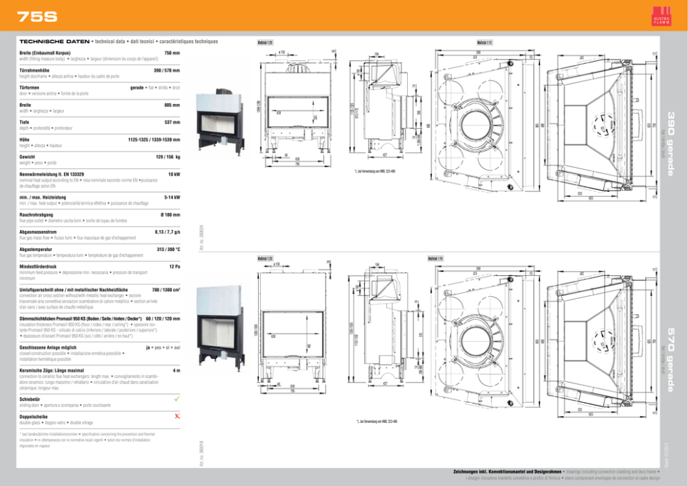 75S 38 14 ø 180 390 / 570 mm 40 129 / 156 kg 5-14 kW 539 Rauchrohrabgang flue pipe outlet • diametro uscita fumi • sortie de tuyau de fumées 625 750 ø 125 *)...bei Verwendung von HMS: 323-498 10 kW 13 min. / max. Heizleistung min. / max. heat output • potenzialità termica effettiva • puissance de chauffage 427 630 795 323 Nennwärmeleistung lt. EN 133329 nominal heat output according to EN • resa nominale secondo norme EN •puissance de chauffage selon EN 805 488 662 14 *) 298-498 1125-1325 / 1339-1539 mm Gewicht weight • peso • poids 184 ø 180 ø 125 805 488 4m 630 795 427 323 539 Doppelscheibe double glass • doppio vetro • double vitrage 13 40 Schiebetür sliding door • apertura a scomparsa • porte coulissante *)...bei Verwendung von HMS: 323-498 Stand: 07/2013 Art. no. 360018 * laut landesüblicher Installationsnormen • specification concerning fire prevention and thermal insulation • in ottemperanza con le normative locali vigenti • selon les normes d’installation régionales en vigueur 625 750 570 14 298-498 ja • yes • sì • oui flat / diritta / droit 463 1339-1539 638 570 gerade Dämmschichtdicken Promasil 950 KS (Boden / Seite / hinten / Decke*) 60 / 120 / 120 mm insulation thickness Promasil 950 KS (floor / sides / rear / ceiling*) • spessore isolante Promasil 950 KS - silicato di calcio (inferiore / laterale / posteriore / superiore*) • épaisseurs d’isolant Promasil 950 KS (sol / côté / arriére / en haut*) 1305-1505 14 Umluftquerschnitt ohne / mit metallischer Nachheizfläche 700 / 1300 cm2 convection air cross section without/with metallic heat exchanger • sezione trasversale aria convettiva senza/con scambiatore di calore metallico • section arrivée d’air sans / avec surface de chauffe métallique Keramische Züge: Länge maximal connection to ceramic flue heat exchangers: length max. • convogliamento in scambiatore ceramico: lungo massimo / refrattario • circulation d’air chaud dans canalisation céramique: longeur max. 13 38 ø 150 12 Pa 1152-1352 Mindestförderdruck minimum feed pressure • depressione min. necessaria • pression de transport minimum 537 602 313 / 300 °C 53 Abgastemperatur flue gas temperature • temperatura fumi • température de gaz d’echappement 287 8,13 / 7,7 g/s Art. no. 360024 Ø 180 mm Abgasmassenstrom flue gas mass flow • flusso fumi • flux massique de gaz d’echappement Geschlossene Anlage möglich closed construction possible • installazione ermetica possibile • installation hermétique possible 390 1125-1325 972-1172 283 537 mm flat / diritta / droit Tiefe depth • profondità • profondeur 638 390 gerade 805 mm 1099-1299 gerade • flat • diritta • droit Breite width • larghezza • largeur Höhe height • altezza • hauteur 537 602 Türformen door • versione antina • forme de la porte 184 53 Türrahmenhöhe height doorframe • altezza antina • hauteur du cadre de porte ø 150 750 mm 287 Breite (Einbaumaß Korpus) width (fitting measure body) • larghezza • largeur (dimension du corps de l’appareil) 13 TECHNISCHE DATEN • technical data • dati tecnici • caractéristiques techniques Zeichnungen inkl. Konvektionsmantel und Designrahmen • drawings including convection cladding and deco frame • i disegni includono mantello convettivo e profilo di finitura • plans comprenant enveloppe de convection et cadre design