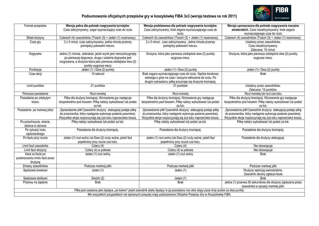 Podsumowanie oficjalnych przepisów gry w koszykówkę FIBA 3x3 (wersja testowa na rok 2011) Format przepisów Wersja pełna dla potrzeb rozgrywania turniejów. Czas zatrzymywany, zegar wyznaczający czas do rzutu Skład drużyny Czas gry Czterech (4) zawodników (Trzech (3) + Jeden (1) rezerwowy). 2 x 5 minut, czas zatrzymywany, jedna minuta przerwy pomiędzy połowami meczu. Dogrywka Punktacja Czas akcji Jedna (1) minuta. Jednakże, jeżeli wynik jest nierozstrzygnięty po pierwszej dogrywce, druga i ostatnia dogrywka jest rozgrywana, a drużyna która jako pierwsza zdobędzie dwa (2) punkty wygrywa mecz Jeden (1) i Dwa (2) punkty 12 sekund Limit punktów 21 punktów Jeden (1) i Dwa (2) punkty Brak zegara wyznaczającego czas do rzutu. Sędzia boiskowy ostrzega o grze na czas i zaczyna odliczanie do rzutu. Po drugim ostrzeżeniu piłkę przyznaje się drużynie broniącej. 21 punktów Pierwsze posiadanie Posiadanie po zdobytym koszu Rzut monetą Piłka dla drużyny broniącej. Wznowienie gry następuje bezpośrednio pod koszem. Piłkę należy wykozłować lub podać za łuk. „Sprawdzenie piłki”(zawodnik drużyny atakującej podaje piłkę do przeciwnika, który następnie wykonuje podanie powrotne). Wszystkie akcje rozpoczynają się zza łuku naprzeciwko kosza. Piłkę należy wykozłować lub podać za łuk. Rzut monetą Piłka dla drużyny broniącej. Wznowienie gry następuje bezpośrednio pod koszem. Piłkę należy wykozłować lub podać za łuk. „Sprawdzenie piłki”(zawodnik drużyny atakującej podaje piłkę do przeciwnika, który następnie wykonuje podanie powrotne). Wszystkie akcje rozpoczynają się zza łuku naprzeciwko kosza. Piłkę należy wykozłować lub podać za łuk. Ustalany przez zawodników. Zalecane: 15 punktów. Rzut monetą lub rzut zza łuku Piłka dla drużyny broniącej. Wznowienie gry następuje bezpośrednio pod koszem. Piłkę należy wykozłować lub podać za łuk. „Sprawdzenie piłki”(zawodnik drużyny atakującej podaje piłkę do przeciwnika, który następnie wykonuje podanie powrotne). Wszystkie akcje rozpoczynają się zza łuku naprzeciwko kosza. Piłkę należy wykozłować lub podać za łuk. Posiadanie dla drużyny broniącej. Posiadanie dla drużyny broniącej. Posiadanie dla drużyny broniącej. Jeden (1) rzut wolny lub Dwa (2) rzuty wolne, jeżeli faul popełniony przy rzucie zza łuku. Cztery (4) Cztery (4) w połowie Jeden (1) rzut wolny Jeden (1) rzut wolny lub Dwa (2) rzuty wolne, jeżeli faul popełniony przy rzucie zza łuku. Cztery (4) Cztery (4) w połowie Jeden (1) rzut wolny Posiadanie dla drużyny atakującej. Podczas martwej piłki Jeden (1) Podczas martwej piłki Jeden (1) Posiadanie po martwej piłce Po przechwycie, stracie, zbiórce w obronie Po sytuacji rzutu sędziowskiego Po faulu przy rzucie Limit fauli zawodnika Limit fauli drużyny Kara za faule po przekroczeniu limitu fauli przez drużynę Zmiany zawodników Sędziowie boiskowi Sędziowie stolikowi Przerwy na żądanie Wersja podstawowa dla potrzeb rozgrywania turniejów. Czas zatrzymywany, brak zegara wyznaczającego czas do rzutu. Czterech (4) zawodników (Trzech (3) + Jeden (1) rezerwowy). 2 x 5 minut, czas zatrzymywany , jedna minuta przerwy pomiędzy połowami meczu. Drużyna, która jako pierwsza zdobędzie dwa (2) punkty wygrywa mecz. Wersja uproszczona dla potrzeb rozgrywania meczów amatorskich. Czas niezatrzymywany, brak zegara wyznaczającego czas do rzutu Czterech (4) zawodników (Trzech (3) + Jeden (1) rezerwowy). Ustalany przez zawodników. Czas niezatrzymywany. Zalecane: 15 minut: Drużyna, która jako pierwsza zdobędzie dwa (2) punkty wygrywa mecz. Jeden (1) i Dwa (2) punkty Brak Nie obowiązuje Nie obowiązuje Brak Podczas martwej piłki Drużyny sędziują samodzielnie. Zawodnik obrony zgłasza faule. Dwóch (2) Jeden (1) Brak Brak Brak Jedna (1) przerwa 30 sekundowa dla drużyny zgłaszana przez zawodnika w sytuacji martwej piłki. Piłka jest uważana jako będąca „za łukiem” jeżeli zawodnik ataku będący w jej posiadaniu ma obie stopy poza linią rzutów za dwa punkty. We wszystkich przypadkach nie opisanych powyżej mają zastosowanie Oficjalne Przepisy Gry w Koszykówkę FIBA.