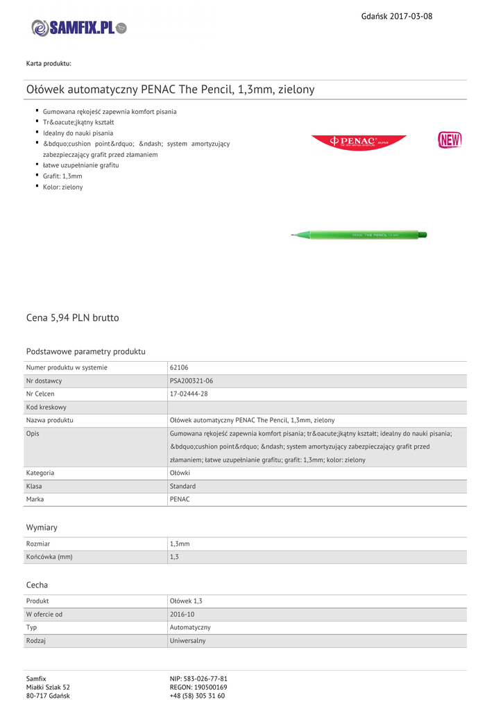Gdańsk 2017-03-08 Karta produktu: Ołówek automatyczny PENAC The Pencil, 1,3mm, zielony Gumowana rękojeść zapewnia komfort pisania Trójkątny kształt Idealny do nauki pisania „cushion point” – system amortyzujący zabezpieczający grafit przed złamaniem łatwe uzupełnianie grafitu Grafit: 1,3mm Kolor: zielony Cena 5,94 PLN brutto Podstawowe parametry produktu Numer produktu w systemie 62106 Nr dostawcy PSA200321-06 Nr Celcen 17-02444-28 Kod kreskowy Nazwa produktu Ołówek automatyczny PENAC The Pencil, 1,3mm, zielony Opis Gumowana rękojeść zapewnia komfort pisania; trójkątny kształt; idealny do nauki pisania; „cushion point” – system amortyzujący zabezpieczający grafit przed złamaniem; łatwe uzupełnianie grafitu; grafit: 1,3mm; kolor: zielony Kategoria Ołówki Klasa Standard Marka PENAC Wymiary Rozmiar 1,3mm Końcówka (mm) 1,3 Cecha Produkt Ołówek 1,3 W ofercie od 2016-10 Typ Automatyczny Rodzaj Uniwersalny Samfix Miałki Szlak 52 80-717 Gdańsk NIP: 583-026-77-81 REGON: 190500169 +48 (58) 305 31 60 Gdańsk 2017-03-08 Karta katalogowa produktu cd. Ołówek automatyczny PENAC The Pencil, 1,3mm, zielony Wspólny słownik zamówień CPV 30192131-8 Ołówki automatyczne Certyfikaty Hit Standard Nowy produkt w ofercie Nowość Kolor Kolor Zielony Serdecznie zapraszamy do współpracy Zespół Samfix. Samfix Miałki Szlak 52 80-717 Gdańsk NIP: 583-026-77-81 REGON: 190500169 +48 (58) 305 31 60
