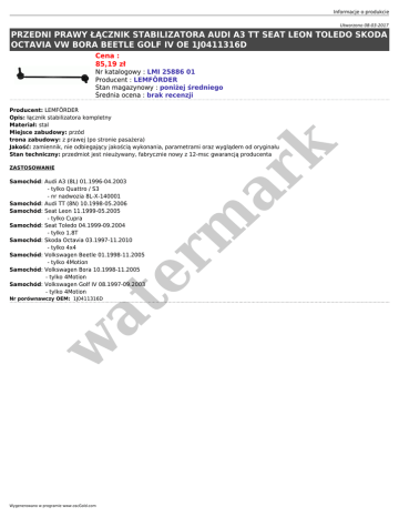 Informacje o produkcie Utworzono 08-03-2017 PRZEDNI PRAWY ŁĄCZNIK STABILIZATORA AUDI A3 TT SEAT LEON TOLEDO SKODA OCTAVIA VW BORA BEETLE GOLF IV OE 1J0411316D Cena : 85,19 zł Nr katalogowy : LMI 25886 01 Producent : LEMFÖRDER Stan magazynowy : poniżej średniego Średnia ocena : brak recenzji ZASTOSOWANIE er m ar k Producent: LEMFÖRDER Opis: łącznik stabilizatora kompletny Materiał: stal Miejsce zabudowy: przód trona zabudowy: z prawej (po stronie pasażera) Jakość: zamiennik, nie odbiegający jakością wykonania, parametrami oraz wyglądem od oryginału Stan techniczny: przedmiot jest nieużywany, fabrycznie nowy z 12-msc gwarancją producenta Samochód: Audi A3 (8L) 01.1996-04.2003 - tylko Quattro / S3 - nr nadwozia 8L-X-140001 Samochód: Audi TT (8N) 10.1998-05.2006 Samochód: Seat Leon 11.1999-05.2005 - tylko Cupra Samochód: Seat Toledo 04.1999-09.2004 - tylko 1.8T Samochód: Skoda Octavia 03.1997-11.2010 - tylko 4x4 Samochód: Volkswagen Beetle 01.1998-11.2005 - tylko 4Motion Samochód: Volkswagen Bora 10.1998-11.2005 - tylko 4Motion Samochód: Volkswagen Golf IV 08.1997-09.2003 - tylko 4Motion w at Nr porównawczy OEM: 1J0411316D Wygenerowano w programie www.oscGold.com
