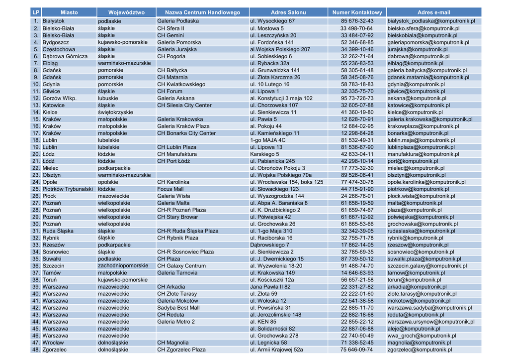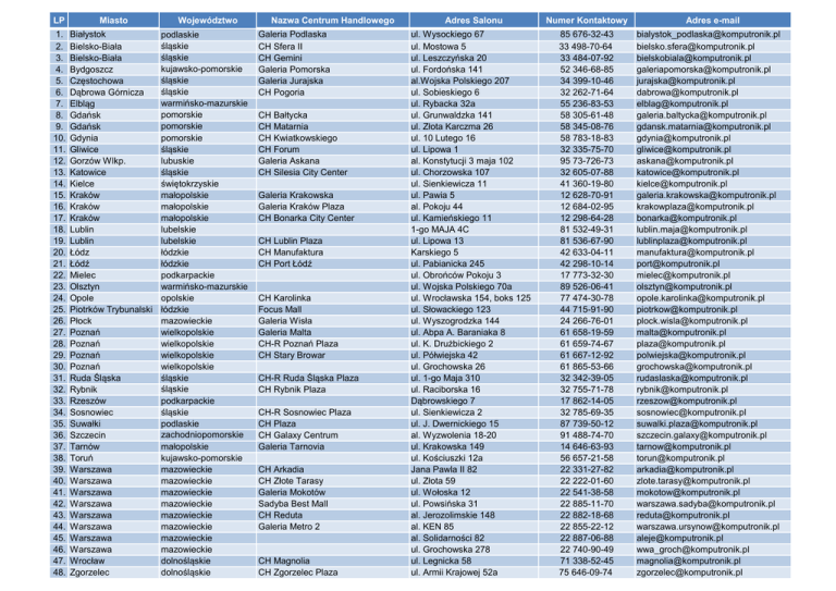 LP Miasto 1. 2. 3. 4. 5. 6. 7. 8. 9. 10. 11. 12. 13. 14. 15. 16. 17. 18. 19. 20. 21. 22. 23. 24. 25. 26. 27. 28. 29. 30. 31. 32. 33. 34. 35. 36. 37. 38. 39. 40. 41. 42. 43. 44. 45. 46. 47. 48. Białystok Bielsko-Biała Bielsko-Biała Bydgoszcz Częstochowa Dąbrowa Górnicza Elbląg Gdańsk Gdańsk Gdynia Gliwice Gorzów Wlkp. Katowice Kielce Kraków Kraków Kraków Lublin Lublin Łódz Łódź Mielec Olsztyn Opole Piotrków Trybunalski Płock Poznań Poznań Poznań Poznań Ruda Śląska Rybnik Rzeszów Sosnowiec Suwałki Szczecin Tarnów Toruń Warszawa Warszawa Warszawa Warszawa Warszawa Warszawa Warszawa Warszawa Wrocław Zgorzelec Województwo podlaskie śląskie śląskie kujawsko-pomorskie śląskie śląskie warmińsko-mazurskie pomorskie pomorskie pomorskie śląskie lubuskie śląskie świętokrzyskie małopolskie małopolskie małopolskie lubelskie lubelskie łódzkie łódzkie podkarpackie warmińsko-mazurskie opolskie łódzkie mazowieckie wielkopolskie wielkopolskie wielkopolskie wielkopolskie śląskie śląskie podkarpackie śląskie podlaskie zachodniopomorskie małopolskie kujawsko-pomorskie mazowieckie mazowieckie mazowieckie mazowieckie mazowieckie mazowieckie mazowieckie mazowieckie dolnośląskie dolnośląskie Nazwa Centrum Handlowego Galeria Podlaska CH Sfera II CH Gemini Galeria Pomorska Galeria Jurajska CH Pogoria CH Bałtycka CH Matarnia CH Kwiatkowskiego CH Forum Galeria Askana CH Silesia City Center Galeria Krakowska Galeria Kraków Plaza CH Bonarka City Center CH Lublin Plaza CH Manufaktura CH Port Łódź CH Karolinka Focus Mall Galeria Wisła Galeria Malta CH-R Poznań Plaza CH Stary Browar CH-R Ruda Śląska Plaza CH Rybnik Plaza CH-R Sosnowiec Plaza CH Plaza CH Galaxy Centrum Galeria Tarnovia CH Arkadia CH Złote Tarasy Galeria Mokotów Sadyba Best Mall CH Reduta Galeria Metro 2 CH Magnolia CH Zgorzelec Plaza Adres Salonu ul. Wysockiego 67 ul. Mostowa 5 ul. Leszczyńska 20 ul. Fordońska 141 al.Wojska Polskiego 207 ul. Sobieskiego 6 ul. Rybacka 32a ul. Grunwaldzka 141 ul. Złota Karczma 26 ul. 10 Lutego 16 ul. Lipowa 1 al. Konstytucji 3 maja 102 ul. Chorzowska 107 ul. Sienkiewicza 11 ul. Pawia 5 al. Pokoju 44 ul. Kamieńskiego 11 1-go MAJA 4C ul. Lipowa 13 Karskiego 5 ul. Pabianicka 245 ul. Obrońców Pokoju 3 ul. Wojska Polskiego 70a ul. Wrocławska 154, boks 125 ul. Słowackiego 123 ul. Wyszogrodzka 144 ul. Abpa A. Baraniaka 8 ul. K. Drużbickiego 2 ul. Półwiejska 42 ul. Grochowska 26 ul. 1-go Maja 310 ul. Raciborska 16 Dąbrowskiego 7 ul. Sienkiewicza 2 ul. J. Dwernickiego 15 al. Wyzwolenia 18-20 ul. Krakowska 149 ul. Kościuszki 12a Jana Pawla II 82 ul. Złota 59 ul. Wołoska 12 ul. Powsińska 31 al. Jerozolimskie 148 al. KEN 85 al. Solidarności 82 ul. Grochowska 278 ul. Legnicka 58 ul. Armii Krajowej 52a Numer Kontaktowy 85 676-32-43 33 498-70-64 33 484-07-92 52 346-68-85 34 399-10-46 32 262-71-64 55 236-83-53 58 305-61-48 58 345-08-76 58 783-18-83 32 335-75-70 95 73-726-73 32 605-07-88 41 360-19-80 12 628-70-91 12 684-02-95 12 298-64-28 81 532-49-31 81 536-67-90 42 633-04-11 42 298-10-14 17 773-32-30 89 526-06-41 77 474-30-78 44 715-91-90 24 266-76-01 61 658-19-59 61 659-74-67 61 667-12-92 61 865-53-66 32 342-39-05 32 755-71-78 17 862-14-05 32 785-69-35 87 739-50-12 91 488-74-70 14 646-63-93 56 657-21-58 22 331-27-82 22 222-01-60 22 541-38-58 22 885-11-70 22 882-18-68 22 855-22-12 22 887-06-88 22 740-90-49 71 338-52-45 75 646-09-74 Adres e-mail [email protected] [email protected] [email protected] [email protected] [email protected] [email protected] [email protected] [email protected] [email protected] [email protected] [email protected] [email protected] [email protected] [email protected] [email protected] [email protected] [email protected] [email protected] [email protected] [email protected] [email protected] [email protected] [email protected] [email protected] [email protected] [email protected] [email protected] [email protected] [email protected] [email protected] [email protected] [email protected] [email protected] [email protected] [email protected] [email protected] [email protected] [email protected] [email protected] [email protected] [email protected] [email protected] [email protected] [email protected] [email protected] [email protected] [email protected] [email protected]