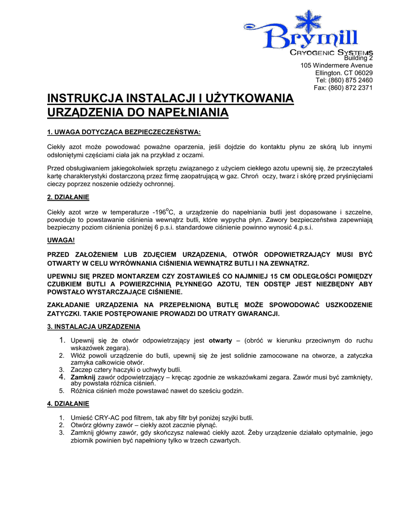 Building 2 105 Windermere Avenue Ellington. CT 06029 Tel: (860) 875 2460 Fax: (860) 872 2371 INSTRUKCJA INSTALACJI I UŻYTKOWANIA URZĄDZENIA DO NAPEŁNIANIA 1. UWAGA DOTYCZĄCA BEZPIECZECZEŃSTWA: Ciekły azot może powodować poważne oparzenia, jeśli dojdzie do kontaktu płynu ze skórą lub innymi odsłoniętymi częściami ciała jak na przykład z oczami. Przed obsługiwaniem jakiegokolwiek sprzętu związanego z użyciem ciekłego azotu upewnij się, że przeczytałeś kartę charakterystyki dostarczoną przez firmę zaopatrującą w gaz. Chroń oczy, twarz i skórę przed pryśnięciami cieczy poprzez noszenie odzieży ochronnej. 2. DZIAŁANIE o Ciekły azot wrze w temperaturze -196 C, a urządzenie do napełniania butli jest dopasowane i szczelne, powoduje to powstawanie ciśnienia wewnątrz butli, które wypycha płyn. Zawory bezpieczeństwa zapewniają bezpieczny poziom ciśnienia poniżej 6 p.s.i. standardowe ciśnienie powinno wynosić 4.p.s.i. UWAGA! PRZED ZAŁOŻENIEM LUB ZDJĘCIEM URZĄDZENIA, OTWÓR ODPOWIETRZAJĄCY MUSI BYĆ OTWARTY W CELU WYRÓWNANIA CIŚNIENIA WEWNĄTRZ BUTLI I NA ZEWNĄTRZ. UPEWNIJ SIĘ PRZED MONTARZEM CZY ZOSTAWIŁEŚ CO NAJMNIEJ 15 CM ODLEGŁOŚCI POMIĘDZY CZUBKIEM BUTLI A POWIERZCHNIĄ PŁYNNEGO AZOTU, TEN ODSTĘP JEST NIEZBĘDNY ABY POWSTAŁO WYSTARCZAJĄCE CIŚNIENIE. ZAKŁADANIE URZĄDZENIA NA PRZEPEŁNIONĄ BUTLĘ MOŻE SPOWODOWAĆ USZKODZENIE ZATYCZKI. TAKIE POSTĘPOWANIE PROWADZI DO UTRATY GWARANCJI. 3. INSTALACJA URZĄDZENIA 1. Upewnij się że otwór odpowietrzający jest otwarty – (obróć w kierunku przeciwnym do ruchu wskazówek zegara). 2. Włóż powoli urządzenie do butli, upewnij się że jest solidnie zamocowane na otworze, a zatyczka zamyka całkowicie otwór. 3. Zaczep cztery haczyki o uchwyty butli. 4. Zamknij zawór odpowietrzający – kręcąc zgodnie ze wskazówkami zegara. Zawór musi być zamknięty, aby powstała różnica ciśnień. 5. Różnica ciśnień może powstawać nawet do sześciu godzin. 4. DZIAŁANIE 1. Umieść CRY-AC pod filtrem, tak aby filtr był poniżej szyjki butli. 2. Otwórz główny zawór – ciekły azot zacznie płynąć. 3. Zamknij główny zawór, gdy skończysz nalewać ciekły azot. Żeby urządzenie działało optymalnie, jego zbiornik powinien być napełniony tylko w trzech czwartych.