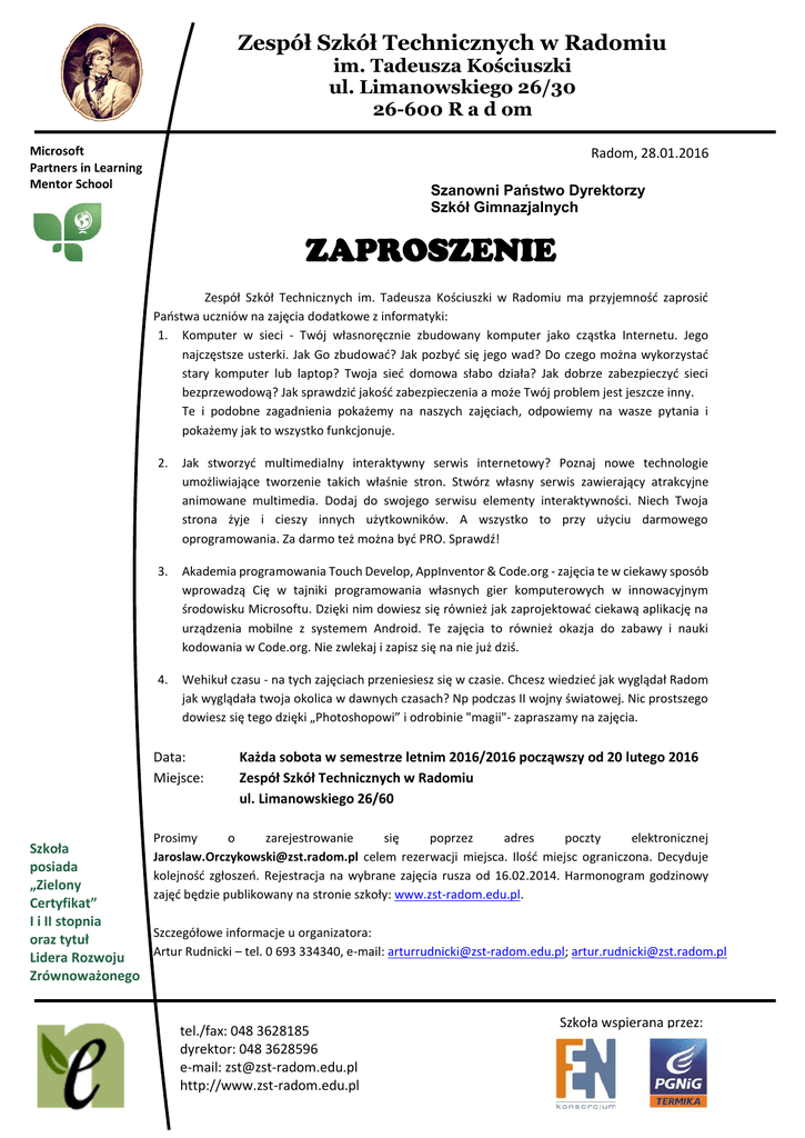 Zespół Szkół Technicznych w Radomiu im. Tadeusza Kościuszki ul. Limanowskiego 26/30 26-600 R a d om Microsoft Partners in Learning Mentor School Radom, 28.01.2016 Szanowni Państwo Dyrektorzy Szkół Gimnazjalnych ZAPROSZENIE Zespół Szkół Technicznych im. Tadeusza Kościuszki w Radomiu ma przyjemność zaprosić Państwa uczniów na zajęcia dodatkowe z informatyki: 1. Komputer w sieci - Twój własnoręcznie zbudowany komputer jako cząstka Internetu. Jego najczęstsze usterki. Jak Go zbudować? Jak pozbyć się jego wad? Do czego można wykorzystać stary komputer lub laptop? Twoja sieć domowa słabo działa? Jak dobrze zabezpieczyć sieci bezprzewodową? Jak sprawdzić jakość zabezpieczenia a może Twój problem jest jeszcze inny. Te i podobne zagadnienia pokażemy na naszych zajęciach, odpowiemy na wasze pytania i pokażemy jak to wszystko funkcjonuje. 2. Jak stworzyć multimedialny interaktywny serwis internetowy? Poznaj nowe technologie umożliwiające tworzenie takich właśnie stron. Stwórz własny serwis zawierający atrakcyjne animowane multimedia. Dodaj do swojego serwisu elementy interaktywności. Niech Twoja strona żyje i cieszy innych użytkowników. A wszystko to przy użyciu darmowego oprogramowania. Za darmo też można być PRO. Sprawdź! 3. Akademia programowania Touch Develop, AppInventor & Code.org - zajęcia te w ciekawy sposób wprowadzą Cię w tajniki programowania własnych gier komputerowych w innowacyjnym środowisku Microsoftu. Dzięki nim dowiesz się również jak zaprojektować ciekawą aplikację na urządzenia mobilne z systemem Android. Te zajęcia to również okazja do zabawy i nauki kodowania w Code.org. Nie zwlekaj i zapisz się na nie już dziś. 4. Wehikuł czasu - na tych zajęciach przeniesiesz się w czasie. Chcesz wiedzieć jak wyglądał Radom jak wyglądała twoja okolica w dawnych czasach? Np podczas II wojny światowej. Nic prostszego dowiesz się tego dzięki „Photoshopowi” i odrobinie "magii"- zapraszamy na zajęcia. Data: Miejsce: Szkoła posiada „Zielony Certyfikat” I i II stopnia oraz tytuł Lidera Rozwoju Zrównoważonego Każda sobota w semestrze letnim 2016/2016 począwszy od 20 lutego 2016 Zespół Szkół Technicznych w Radomiu ul. Limanowskiego 26/60 Prosimy o zarejestrowanie się poprzez adres poczty elektronicznej [email protected] celem rezerwacji miejsca. Ilość miejsc ograniczona. Decyduje kolejność zgłoszeń. Rejestracja na wybrane zajęcia rusza od 16.02.2014. Harmonogram godzinowy zajęć będzie publikowany na stronie szkoły: www.zst-radom.edu.pl. Szczegółowe informacje u organizatora: Artur Rudnicki – tel. 0 693 334340, e-mail: [email protected]; [email protected] tel./fax: 048 3628185 dyrektor: 048 3628596 e-mail: [email protected] http://www.zst-radom.edu.pl Szkoła wspierana przez: