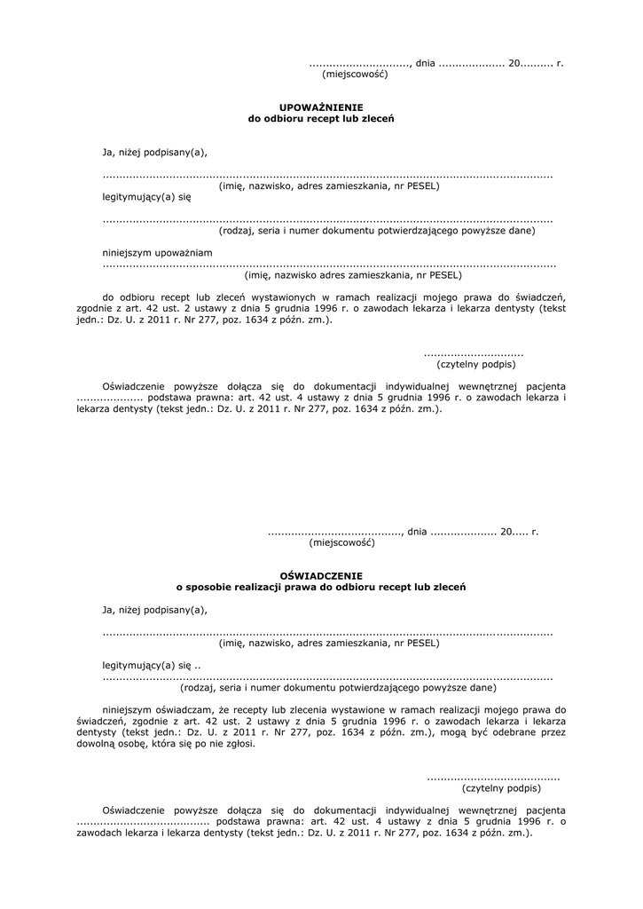 .............................., dnia .................... 20.......... r. (miejscowość) UPOWAŻNIENIE do odbioru recept lub zleceń Ja, niżej podpisany(a), ....................................................................................................................................... (imię, nazwisko, adres zamieszkania, nr PESEL) legitymujący(a) się ....................................................................................................................................... (rodzaj, seria i numer dokumentu potwierdzającego powyższe dane) niniejszym upoważniam ........................................................................................................................................ (imię, nazwisko adres zamieszkania, nr PESEL) do odbioru recept lub zleceń wystawionych w ramach realizacji mojego prawa do świadczeń, zgodnie z art. 42 ust. 2 ustawy z dnia 5 grudnia 1996 r. o zawodach lekarza i lekarza dentysty (tekst jedn.: Dz. U. z 2011 r. Nr 277, poz. 1634 z późn. zm.). .............................. (czytelny podpis) Oświadczenie powyższe dołącza się do dokumentacji indywidualnej wewnętrznej pacjenta .................... podstawa prawna: art. 42 ust. 4 ustawy z dnia 5 grudnia 1996 r. o zawodach lekarza i lekarza dentysty (tekst jedn.: Dz. U. z 2011 r. Nr 277, poz. 1634 z późn. zm.). ........................................, dnia .................... 20..... r. (miejscowość) OŚWIADCZENIE o sposobie realizacji prawa do odbioru recept lub zleceń Ja, niżej podpisany(a), ....................................................................................................................................... (imię, nazwisko, adres zamieszkania, nr PESEL) legitymujący(a) się .. ....................................................................................................................................... (rodzaj, seria i numer dokumentu potwierdzającego powyższe dane) niniejszym oświadczam, że recepty lub zlecenia wystawione w ramach realizacji mojego prawa do świadczeń, zgodnie z art. 42 ust. 2 ustawy z dnia 5 grudnia 1996 r. o zawodach lekarza i lekarza dentysty (tekst jedn.: Dz. U. z 2011 r. Nr 277, poz. 1634 z późn. zm.), mogą być odebrane przez dowolną osobę, która się po nie zgłosi. ........................................ (czytelny podpis) Oświadczenie powyższe dołącza się do dokumentacji indywidualnej wewnętrznej pacjenta ........................................ podstawa prawna: art. 42 ust. 4 ustawy z dnia 5 grudnia 1996 r. o zawodach lekarza i lekarza dentysty (tekst jedn.: Dz. U. z 2011 r. Nr 277, poz. 1634 z późn. zm.).