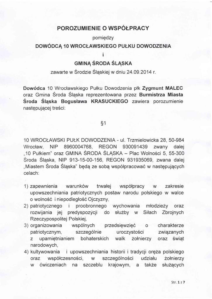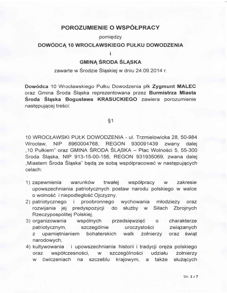 POROZUMIENIE O WSPOTPRACY pomiqdzy DOWODCA 10 WROC,T-AWSKTEGO PULKU DOWODZENIA i cMtNA SRODA S4SKA zawarte w Srodzie Slqskiej w dniu 24.09.2014 r. Dowodca 10 Wroclawskiego Putku Dowodzenia ptk Zygmunt MALEG oraz Gmina Sroda Slqska rcprezentowana przez Burmistrza Miasta Sroda Slqska Boguslawa KRASUCKIEGO zawiera porozumienie nastgpujqcej tre6ci: s1 - ul. Trzmielowicka 28, 50-984 Wroclaw, NIP 8960004768, REGON 930091439 zwany dalej 10 WROCT-AWSKI PUI-K DOWODZENIA - Plac Wolno5ci 5, 55-300 Sroda Slqska, NIP 913-15-00-156, REGON 931935069 , zwana dalej ,,Miastem Sroda Slqska" bedq ze sobE wspolpracowac w nastgpujqcych celach: ,,10 PuNkiem" oraz GMINA SRODA SLASKA 1) zapewnienia warunkow tnrualej wspolpracy w zakresie upowszechniania patriotycznych postaw narodu polskiego w walce o wolnoSc i niepodleglo6c Ojczyzny, 2) patriotycznego i proobronnego wychowania mlodzieZy oraz rozwijania jej predyspozyqi do sluzby w Silach Zbrojnych Rzeczypospol itej Polskiej, 3) organizowania wspolnych przedsigwzigc o charakterze patriotycznym, szczegolnie uroczystoSci zwiqzanych z upamigtnianiem bohaterskich walk 2oNnierzy oraz Swiqt narodowych, 4) kultywowania i upowszechniania historii i tradycji orqZa polskiego oraz wspotczesno5ci, w szczegolno6ci udzialu Zolnierzy w cwiczeniach na szczeblu krajowym, a takZe sNuzqcych Str.1z7 w kontyn gentach m iqdzynarodowych, 5) upamiqtniania miejsc pamiqci narodowej zwiqzanych z walk4 o wolnoSc i niepodlegloSc Polski, 6) popularyzaqi oraz upowszechnienia bojowych i pokojowych tradycji oraz dorobku 10 Putku, 7) ochrony czci, godnoSci i honoru Zolnierza polskiego oraz integrowania Srodowiska ZoNnierskiego ze Srodowiskiem cywilnym. B) podtrzymywania wiqzi solidarno5ci weteranow, bytych Zolnierzy zawodowych oraz sympatykow wojska Zolnierzami sluzqcymi w 10 Pulku. i z s2 Miasto Sroda Slqska zobowiEzuje siq do: 1) uzgadniania z Dowodcq 1 0 Pulku organizowanych przez Miasto Sroda Slqska przedsiqwziqc promujqcych i popularyzuj4cych biezqcE dzialalnoSc 10 PuNku, 2) upowszechniania patriotycznych postaw oraz historii orqza polskiego, miqdzy innymi poprzez i tradycji nawiqzywanie i utrzymywanie kontakt6w ze szkolami, 3) przywracania pamiqci i upamiqtniania osob i wydarzen maj4cych miejsce w przeszlo5ci na terenie Ziemi DolnoSlqskiej , a zwiqzanych z historiq kraju, w tym z czasami powojennymi, 4) przekazywania w miarq moZliwoSci pamiqtek i eksponatow o charakterze patriotycznym do Sali Tradycji 10 Pulku; i w uroczystoSciach patriotycznych, a takZe pokazach dwiczeniach wojskowych organizowanych przez 10 PuNk, 5) udzialu 6)wspoldzialania z Dow6dcq 10 Putku w przygotowaniu i prowadzeniu spraw zwiqzanych z obchodami rocznic i swiEt Putku oraz uroczystoSci o charakterze panstwowym, 7) wsp6lpracy z organizaqami bytych zolnierzy zawodowych i srodowisk kombatanckich. s3 10 Pulk zobowiqzuje siQ udzielic Miastu Sroda Slqska pomocy Str.2z7 w prowadzeniu dziaNalnoSci z iEzanej z popularyzaqq historii, patriotyzmu i wizerunku Sil Zbrojnych RP wSrod spoleczno6ci Miasta Sroda SlEska, w szczegolnoSci popzez'. 1) wsparcie merytoryczne logistyczne przedsiqwziqc Miasta Sroda i Slqska, ktorego podstaw4 bqdzie roczny plan wsp6lpracy oraz umowy cywilnoprawne zawarte zgodnie z postanowieniami zawartymi w $ 25 - 29 decyzji Ministra Obrony Narodowej Nr 187IMON z dnia 9 czerwca 2009 r. w sprawie wprowadzenia zasad wsp6lpracy resortu obrony narod wej organizacjami pozarzqdowymi innymi partnerami (Dz. Urz. MON Nr 12, poz. 131 , z potn. zm.), ktore okreslq warunki korzystania z nieruchomoSci lub ich czqsci otaz uzbrojenia i sprzqtu wojskowego, z i 2) udostqpnianie Miastu Sroda Slqska materiat6w promujqcych Zbrojne RP, 10 Putk otaz sluzbq wojskowE, 3) wNqczanie mieszkancow Miasta Sroda Slqska SiNy do przedsiqwziqc o charakterze patriotyczno obronnym organizowanych przez 10 PuNk, 4) promowanie Miasta Sroda Slqska w Srodowisku wojskowym, 5) popularyzowanie dzialalno6ci Miasta Sroda Sl4ska, w miarq moZliwoSci w publikacjach Pulku, 6) wspieranie inicjatyw Miasta 'roda SlEska majqcych na celu budowanie pozytywnego wizerunku i promowanie Sil Zbrojnych RP, 7) prezentacjg udostepnianie sprzqtu i Srodkow NqcznoSci, w miarq posiadanych mozliwoSci, zgod nie z nastqpujEcymi zasadami: a) udostqpnione mienie moze byc wykorzystane wylqcznie do realizaQi cel6w zawarlych w planie wsp6Npracy, o ktorym mowa i ws5, b) Miasto Sro a Slqska ponosi zwykle koszty udostqpnionego mienia, eksploatacyjne . 8) uczestnictwo w obchodach rocznic i SwlEt o charakterze panstwowym organizowanych lub wspotorganizowanych ptzez Miasto Sroda SlEska, 9) wsparcie logistyczne przedsiqwziqc realizowanych przez Miasto Sroda Slqska celu promocji sluzby wojskowej stuzby w Narodowych Sitach Rezenruowych. w i Str.3 z7 s4 Korzystanie przez Miasto Sroda Slqska z nieruchornoSci wojskowych w celu prowadzenia statutowej dziaNalno5ci pozytku publicznego z zakresu obrony narodowej moZe miec miejsce na podstawie umowy cywilnej zawartej przez Miasto Sroda Slqska z wta6dwym organem wojskowym. s5 Miasto Sroda Slqska bqdzie przysylalo do dnia 10 wrzesnia kazdego roku, do 10 Putku, propozycje przedsiqwziqc do planu wspolpracy resortu obrony narodowej z organizacjami pozarzqdowymi i innymi partnerami spolecznymi na nastqpny rok kalendarzowy. s6 Strony zobowiqzujq siQ do wzajemnego informowania o zdarzeniach i okolicznoSciach istotnych ze wzglqdu na przedmiot i zakres niniejszego porozumienia. s7 Miasto Sroda Slqska zobowiqzuje siq do skladania na rzecz 10 PuNku do konca miesiqca grud nia kaZdego roku kalendarzowego informacji o realizacji porozumienia r s8 Porozumienie nie powoduje dodatkowych wydatkow z budZetu resortu obrony narodowej oraz Miasta Sroda Slqska. se. Str.4z7 Strony porozumienia nie ponoszq wobec siebie odpowiedzialnoSci cywilnej za zdarzenia, kt6re wystqpiE podczas lub w zwiqzku z realizacjqporozu m i e n ia. s 10 Wszelkie spory mogEce wynikn4c w zwiqzku z wykonywaniem postanowien porozumienia strony beda rozstrzygaly w drodze negocjacji , dqZqc do ich polub