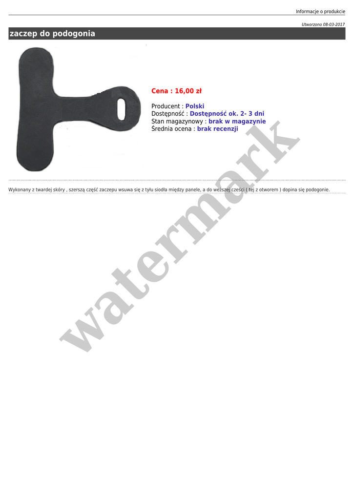 Informacje o produkcie Utworzono 08-03-2017 zaczep do podogonia Cena : 16,00 zł er m ar k Producent : Polski Dostępność : Dostępność ok. 2- 3 dni Stan magazynowy : brak w magazynie Średnia ocena : brak recenzji w at Wykonany z twardej skóry , szerszą część zaczepu wsuwa się z tyłu siodła między panele, a do weższej cześci ( tej z otworem ) dopina się podogonie.