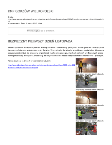 KMP GORZÓW WIELKOPOLSKI Źródło: http://www.gorzow.lubuska.policja.gov.pl/go1/serwis-informacyjny/aktualnosci/10947,Bezpieczny-pierwszy-dzien-listopada.ht ml Wygenerowano: Środa, 8 marca 2017, 18:44 Strona znajduje się w archiwum. BEZPIECZNY PIERWSZY DZIEŃ LISTOPADA Pierwszy dzień listopada powoli dobiega końca. Gorzowscy policjanci nadal jednak czuwają nad bezpieczeństwem podróżujących. Święto Wszystkich Świętych przebiega spokojnie. Kierowcy przyzwyczajeni już do zmian w organizacji ruchu drogowego, słuchali poleceń wydawanych przez funkcjonariuszy. Policjanci przez cały dzień pracowali na rzecz bezpieczeństwa kierowców i pieszych. Relacja z sytuacji na drogach w województwie lubuskim: http://www.lubuska.policja.gov.pl/serwis-informacyjny/aktualnosci/item/5135-znicz-201 4-biezaca-relacja-o-sytuacji-na-drogach Bezpieczny pierwszy dzień listopada Bezpieczny pierwszy dzień listopada Bezpieczny pierwszy dzień listopada Bezpieczny pierwszy dzień listopada Bezpieczny pierwszy dzień listopada Bezpieczny pierwszy dzień listopada Bezpieczny pierwszy dzień listopada Bezpieczny pierwszy dzień listopada Bezpieczny pierwszy dzień listopada Bezpieczny pierwszy dzień listopada Bezpieczny pierwszy dzień listopada Ocena: 0/5 (0) Tweetnij
