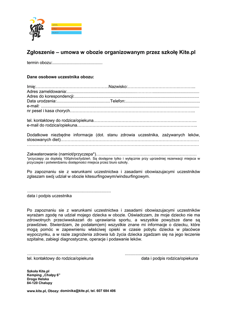 Zgłoszenie – umowa w obozie organizowanym przez szkołę szkoł Kite.pl termin obozu:........................................... obozu Dane osobowe uczestnika obozu: Imię:…………………………………………….Nazwisko:……………………………….… :…………………………………………….Nazwisko:……………………………….… :…………………………………………….Nazwisko:……………………………….………... Adres zameldowania:...........................................................…………........................................ zameldowania:...........................................................…………...................................... Adres do korespondencji:....................................................................................... korespondencji:......... .................................. Data urodzenia:.............................................. ...............................Telefon:.............................................. Telefon:................................................................ e-mail: mail: ........................................................................................................................................ .................................................................................................................. nr pesel i kasa chorych……………………………………………………………………………... chorych…………………………………………………………………………… tel. kontaktowy do rodzica/opiekuna……………………………………………………………….. e-mail mail do rodzica/opiekuna………………………………………………………………………….. Dodatkowe niezbędne dne informacje (dot. stanu zdrowia uczestnika, zażywanych zaż leków, stosowanych diet)……………………………………………………………………………………… …………………………………………………………………………………………………………… Zakwaterowanie (namiot/przyczepa*)…………………………………………… (namiot/przyczepa …………………… *przyczepy za dopłatą 100pln/os/tydzie 100pln/os/tydzień. Są dostępne tylko i wyłącznie przy uprzedniej rezerwacji miejsca w przyczepie i potwierdzeniu dostępnoś pności miejsca przez biuro szkoły. Po zapoznaniu sie z warunkami uczestnictwa uczestnictwa i zasadami obowiazujacymi uczestników zgłaszam swój udział w obozie bozie kitesurfingowym/windsurfingowym. kitesurfingowym/windsurfin ........................................................................ data i podpis uczestnika Po zapoznaniu sie z warunkami uczestnictwa i zasadami obowiazujacymi uczestników wyrażam zgodę na udział mojego dziecka w obozie. Oświadczam, że e moje dziecko nie ma zdrowotnych przeciwwskazań do uprawiania sportu, a wszystkie tkie powyższe powy dane są prawdziwe. Stwierdzam, że e podałam(em) wszystkie znane mi informacje o dziecku, które mogą pomóc w zapewnieniu właściwej wła ciwej opieki w czasie pobytu dziecka w pla placówce wypoczynku, a w razie zagrożenia zagroż zdrowia lub życia ycia dziecka zgadzam się na jego leczenie szpitalne, zabiegi diagnostyczne, operacje i podawanie leków. ....................................................... tel. kontaktowy do rodzica/opiekuna Szkoła Kite.pl Kemping „Chałpy 6” Droga Helska 84-120 Chałupy [email protected] tel. 607 684 406 www.kite.pl, Obozy: [email protected], ................................................................ .................................................. data i podpis rodzica/opiekuna