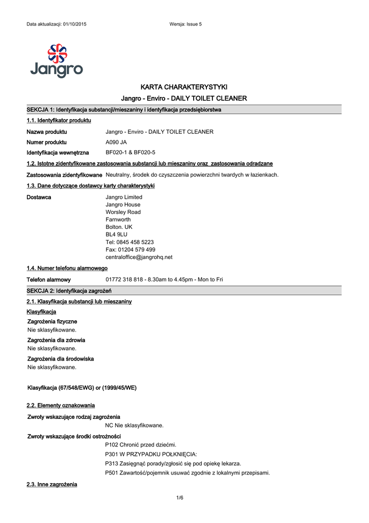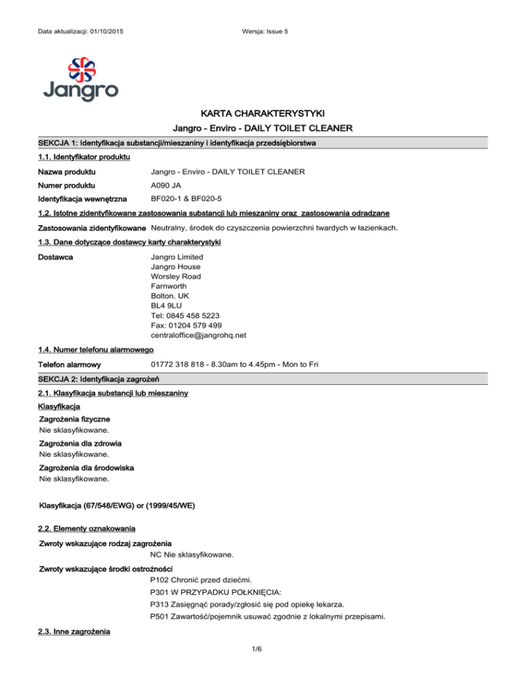 Data aktualizacji: 01/10/2015 Wersja: Issue 5 KARTA CHARAKTERYSTYKI Jangro - Enviro - DAILY TOILET CLEANER SEKCJA 1: Identyfikacja substancji/mieszaniny i identyfikacja przedsiębiorstwa 1.1. Identyfikator produktu Nazwa produktu Jangro - Enviro - DAILY TOILET CLEANER Numer produktu A090 JA Identyfikacja wewnętrzna BF020-1 & BF020-5 1.2. Istotne zidentyfikowane zastosowania substancji lub mieszaniny oraz zastosowania odradzane Zastosowania zidentyfikowane Neutralny, środek do czyszczenia powierzchni twardych w łazienkach. 1.3. Dane dotyczące dostawcy karty charakterystyki Dostawca Jangro Limited Jangro House Worsley Road Farnworth Bolton. UK BL4 9LU Tel: 0845 458 5223 Fax: 01204 579 499 [email protected] 1.4. Numer telefonu alarmowego Telefon alarmowy 01772 318 818 - 8.30am to 4.45pm - Mon to Fri SEKCJA 2: Identyfikacja zagrożeń 2.1. Klasyfikacja substancji lub mieszaniny Klasyfikacja Zagrożenia fizyczne Nie sklasyfikowane. Zagrożenia dla zdrowia Nie sklasyfikowane. Zagrożenia dla środowiska Nie sklasyfikowane. Klasyfikacja (67/548/EWG) or (1999/45/WE) 2.2. Elementy oznakowania Zwroty wskazujące rodzaj zagrożenia NC Nie sklasyfikowane. Zwroty wskazujące środki ostrożności P102 Chronić przed dziećmi. P301 W PRZYPADKU POŁKNIĘCIA: P313 Zasięgnąć porady/zgłosić się pod opiekę lekarza. P501 Zawartość/pojemnik usuwać zgodnie z lokalnymi przepisami. 2.3. Inne zagrożenia 1/6 Data aktualizacji: 01/10/2015 Wersja: Issue 5 Jangro - Enviro - DAILY TOILET CLEANER Produkt nie zawiera żadnych substancji sklasyfikowanych jako PBT lub vPvB. SEKCJA 3: Skład/informacja o składnikach 3.2. Mieszaniny 3-5% SODIUM (C12-14) ALKYL ETHOXY SULPHATE Numer CAS: 68891-38-3 Numer WE: — Klasyfikacja Klasyfikacja (67/548/EWG) or (1999/45/WE) Skin Irrit. 2 - H315 Xi;R36,R38. Eye Dam. 1 - H318 Pełny tekst zwrotów wskazujących rodzaj zagrożenia (zwrotów R) i określeń zagrożeń jest przedstawiony w sekcji 16. Uwagi dotyczące składu Składniki są obecne w stężeniach nie powodujących zagrożenia.. SEKCJA 4: Środki pierwszej pomocy 4.1. Opis środków pierwszej pomocy Wdychanie Mało prawdopodobna droga narażenia, gdyż produkt nie zawiera substancji lotnych. Jeśli wchłonięto rozpyloną ciecz/mgły, należy wykonać następujące czynności. Przenieść poszkodowanego na świeże powietrze i zapewnić ciepło i odpoczynek w pozycji umożliwiającej oddychanie. Połknięcie Nie wywoływać wymiotów. Podać duże ilości wody do picia. Zasięgnąć porady medycznej jeśli dyskomfort się utrzymuje. Kontakt ze skórą Umyć dużą ilością wody. Kontakt z oczami Natychmiast spłukać dużą ilością wody. Natychmiast zasięgnąć porady medycznej jeśli objawy utrzymują się po umyciu. 4.2. Najważniejsze ostre i opóźnione objawy oraz skutki narażenia Informacje ogólne Nasilenie opisanych objawów będzie różnić się w zależności od stężenia i czasu narażenia. Wdychanie Brak znanych specyficznych objawów. Połknięcie Brak znanych specyficznych objawów. ale - Może wywoływać złe samopoczucie w przypadku spożycia. Kontakt ze skórą Brak znanych specyficznych objawów. Długotrwały lub powtarzający się kontakt ze skórą może powodować zaczerwienienie, swędzenie, podrażnienie, wypryski i pękanie skóry. Kontakt z oczami Brak znanych specyficznych objawów. Długotrwały kontakt może powodować zaczerwienienie i/lub łzawienie. 4.3. Wskazania dotyczące wszelkiej natychmiastowej pomocy lekarskiej i szczególnego postępowania z poszkodowanym Wskazówki dla lekarza Leczyć objawowo. SEKCJA 5: Postępowanie w przypadku pożaru 5.1. Środki gaśnicze Odpowiednie środki gaśnicze Produkt nie jest łatwopalny. Używać środków gaśniczych odpowiednich dla palących się materiałów w najbliższym otoczeniu. 5.2. Szczególne zagrożenia związane z substancją lub mieszaniną Szczególne zagrożenia Produkty rozkładu termicznego lub spalania mogą zawierać następujące substancje: Drażniące gazy lub pary. 2/6 Data aktualizacji: 01/10/2015 Wersja: Issue 5 Jangro - Enviro - DAILY TOILET CLEANER 5.3. Informacje dla straży pożarnej Specjalny sprzęt ochronny dla strażaków Nosić aparat oddechowy z niezależnym dopływem powietrza i odpowiednie ubranie ochronne. SEKCJA 6: Postępowanie w przypadku niezamierzonego uwolnienia do środowiska 6.1. Indywidualne środki ostrożności, wyposażenie ochronne i procedury w sytuacjach awaryjnych Osobiste środki ostrożności Brak specjalnej odzieży ochronnej. (Patrz rozdział 8).. 6.2. Środki ostrożności w zakresie ochrony środowiska Środki ostrożności w zakresie ochrony środowiska Wycieki i niekontrolowane zrzuty do cieków wodnych muszą być niezwłocznie zgłaszane organom ochrony środowiska lub innym odpowiednim organom. 6.3. Metody i materiały zapobiegające rozprzestrzenianiu się skażenia i służące do usuwania skażenia Metody usuwania skażenia Małe ilości: Wyciek spłukać dużą ilością wody. Duże ilości: Zaabsorbować wyciek piaskiem, ziemią lub innym niepalnym materiałem. Zebrać i umieścić w odpowiednich pojemnikach na odpady i szczelnie zamknąć. 6.4. Odniesienia do innych sekcji Odniesienia do innych sekcji Informacje dotyczące odpowiedniego sprzętu ochrony osobistej, patrz sekcja 8. SEKCJA 7: Postępowanie z substancjami i mieszaninami oraz ich magazynowanie Środki ostrożności dotyczące bezpiecznego postępowania Środki ostrożności podczas stosowania Brak szczególnych zaleceń. 7.2. Warunki bezpiecznego magazynowania, łącznie z informacjami dotyczącymi wszelkich wzajemnych niezgodności Środki ostrożności dotyczące magazynowania Przechowywać wyłącznie w oryginalnym opakowaniu w chłodnym, dobrze wentylowanym miejscu. Przechowywać z dala od następujących materiałów: Utleniacze. 7.3. Szczególne zastosowanie(-a) końcowe Szczególne zastosowanie(-a) końcowe Zastosowania zidentyfikowane dla tego produktu przedstawiono w sekcji 1.2. Opis za