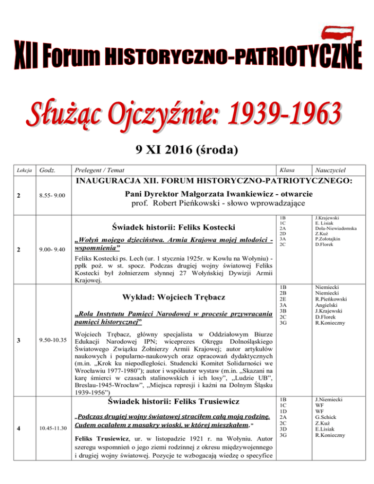 9 XI 2016 (środa) Lekcja Godz. Prelegent / Temat Klasa Nauczyciel INAUGURACJA XII. FORUM HISTORYCZNO-PATRIOTYCZNEGO: 2 8.55- 9.00 Pani Dyrektor Małgorzata Iwankiewicz - otwarcie prof. Robert Pieńkowski - słowo wprowadzające Świadek historii: Feliks Kostecki 2 9.00- 9.40 „Wołyń mojego dzieciństwa. Armia Krajowa mojej młodości wspomnienia” 1B 1C 2A 2D 3A 2C J.Krajewski E. Lisiak Dola-Niewiadomska Z.Kuź P.Zołotajkin D.Florek 1B 2B 2E 3A 3B 2C 3G Niemiecki Niemiecki R.Pieńkowski Angielski J.Krajewski D.Florek R.Konieczny 1B 1C 1D 2A 2C 3D 3G J.Niemiecki WF WF G.Schick Z.Kuź E.Lisiak R.Konieczny Feliks Kostecki ps. Lech (ur. 1 stycznia 1925r. w Kowlu na Wołyniu) ppłk poż. w st. spocz. Podczas drugiej wojny światowej Feliks Kostecki był żołnierzem słynnej 27 Wołyńskiej Dywizji Armii Krajowej. Wykład: Wojciech Trębacz „Rola Instytutu Pamięci Narodowej w procesie przywracania pamięci historycznej” 3 9.50-10.35 Wojciech Trębacz, główny specjalista w Oddziałowym Biurze Edukacji Narodowej IPN; wiceprezes Okręgu Dolnośląskiego Światowego Związku Żołnierzy Armii Krajowej; autor artykułów naukowych i popularno-naukowych oraz opracowań dydaktycznych (m.in. „Krok ku niepodległości. Studencki Komitet Solidarności we Wrocławiu 1977-1980”); autor i współautor wystaw (m.in. „Skazani na karę śmierci w czasach stalinowskich i ich losy”, „Ludzie UB”, Breslau-1945-Wrocław”, „Miejsca represji i kaźni na Dolnym Śląsku 1939-1956”) Świadek historii: Feliks Trusiewicz „Podczas drugiej wojny światowej straciłem całą moją rodzinę. 4 10.45-11.30 Cudem ocalałem z masakry wioski, w której mieszkałem.” Feliks Trusiewicz, ur. w listopadzie 1921 r. na Wołyniu. Autor szeregu wspomnień o jego ziemi rodzinnej z okresu międzywojennego i drugiej wojny światowej. Pozycje te wzbogacają wiedzę o specyfice Wołynia z jego różnorodnością etniczną, romantyzmem kulturowym, urzekającym folklorem i krajobrazem. Wspomnienia Trusiewicza nie pomijają tragicznych losów ludności polskiej prześladowanej i deportowanej na Sybir przez okupantów sowieckich, a później represjonownej przez okupantów niemieckich. Relacjonują także zagładę Żydów i rzeź ludności polskiej dokonaną przez oddziały UPA. Wykład: Ilona Gosiewska Stowarzyszenie „Odra - Niemen” w działaniach na rzecz ratowania polskiego dziedzictwa kulturowego poza granicami Polski oraz wspierania Kombatantów mieszkających na Kresach, w Polsce i na całym świecie” 5 11.50-12.35 1B 2E 2F 3A 3B 3F 2C 2D 3G R.Pieńkowski WF WF Wyb przedmiot Wyb przedmiot P.Zołotajkin J.Niemiecki J.Niemiecki R.Konieczny 2D 2A 2B 3A 3B 3C 3F 3G M. Matrzaj-Kacprzak 2B 2A 2C 2D 3B 3F 1E 1C i 1D J.Krajewski R.Pieńkowski WF WF Niemiecki P.Zołotajkin E.Cwynar M.Palcewicz – Prezes Stowarzyszenia Odra-Niemen. Stowarzyszenie jest organizacją, której głównym celem jest rozwijanie inicjatyw i projektów kresowych, polonijnych, historycznych i edukacyjnych. Stowarzyszeniu leży też na sercu sprawa budowy we Wrocławiu Pomnika Żołnierzom Wyklętym. Ilona Gosiewska Świadek historii: Stefan Siejka „Dlaczego chciałem przemocą obalić ustrój PRL?” 6 12.45-13.30 Kpt. rez. Stefan Siejka, ur. 2 III 1931 r. Prezes wrocławskiego oddziału Związku Młodocianych Więźniów Politycznych „Jaworzniacy”. W 1948 r. wstąpił do tajnej organizacji Młode Wojsko Polskie, której celem było "obalenie przemocą ustroju Państwa Polskiego". Aresztowany 21 XI 1949r. w wieku lat 18. Za działalność w tej organizacji w 1950r. skazany na 10 lat pozbawienia wolności. Wyrok odsiadywał m. in. w obozie pracy w Jaworznie. Zwolniony 18 V1956 na mocy amnestii. Świadek historii: Genowefa Aleksander „Co się stało 67 lat temu, gdy z koleżankami szłam na sprawdzian z matematyki?” 7 13:40-14:25 Porucznik rez. Genowefa Aleksander, ur. 10 XI 1932 r., członek Narodowych Sił Zbrojnych, Związku Więźniów Politycznych Okresu Stalinowskiego. W wieku 16 lat została w 1949 r. aresztowana za „przynależność do nielegalnej organizacji, która przemocą dążyła do obalenia organów władzy demokratycznej i ustroju państwa ludowego”. Została uznana za wroga Polski Ludowej. Pani Genowefa Aleksander spędziła cztery miesiące w areszcie Urzędu Bezpieczeństwa w Bolesławcu, a następnie została przewieziona do Wrocławia, gdzie w areszcie na ul. Sądowej spędziła 2 lata i jeden dzień. E.Cwynar J.Angielski Wyb przedmiot Wyb przedmiot R.Gawrońska P.Zołotajkin R.Konieczny