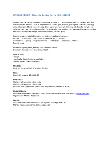 RADOŚĆ SERCA - Wieczór Tantry Serca DLA KOBIET Zapraszamy Cię gorąco na wieczorne spotkanie z tantrą i z kobiecością, podczas którego wspólnie doświadczymy RADOŚCI SERCA. Poprzez ruch, taniec, głos, oddech, poczujemy cudowną wibrację ciała, własną miękkość, moc i kreację. Otworzymy się na dotyk delikatny jak skrzydła motyla i na subtelną moc naszych pięciu zmysłów. Początek roku to wspaniały czas na nadanie nowej energii na cały rok – na wsparcie swojej kobiecości, radości, miłości, pasji. Radość serca.... moja kobiecość.....my kobiety....zabawa, humor... lekkość.... przestrzeń .... swobodna ekspresja emocji ...śmiech... wzruszenie .... spokój ... bezpieczeństwo .... fala radości ....obecność ... miłość ... Radość serca Ubierzcie się wygodnie, tak aby czuć swobodę ruchu. Będziemy ćwiczyć boso lub w skarpetkach. Weź ze sobą: - kocyk - poduszkę do siedzenia na podłodze - dobry humor i dobrą energię:) MIEJSCE: Łódź, ul. Lipowa 15/17, YOUR LIFE STUDIO CZAS: Piątek, 23 stycznia 19:00-22:30 WARTOŚĆ: 50zł przy płatności do 16 stycznia 60zł przy płatności po 16 stycznia (zaliczka 50% zł płatna na konto - info do przelewu podamy w mailu) PROWADZĄCA: Anna Waszkielewicz - asystentka Gayi i Mario Wiśniewskich ze Strasbourga (www.tantra.pl). Organizator: Monika Rodewald ZAPISY: Anna Waszkielewicz: +48 607 20 20 24; [email protected] Monika Rodewald: [email protected]