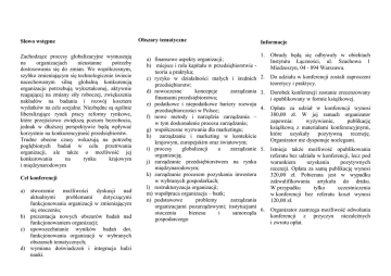Słowo wstępne Zachodzące procesy globalizacyjne wymuszają na organizacjach nieustanne potrzeby dostosowania się do zmian. We współczesnym, szybko zmieniającym się technologicznie świecie nacechowanym silną globalną konkurencją organizacje potrzebują wykształconej, aktywnie reagującej na zmiany siły roboczej, zwiększenia nakładów na badania i rozwój kosztem wydatków na cele socjalne. Niezbędne są ogólnie liberalizujące rynek pracy reformy rynkowe, które przejściowo zwiększą poziom bezrobocia, jednak w dłuższej perspektywie będą wpływać korzystnie na konkurencyjność przedsiębiorstw. Trudne obecne czasy wskazują na potrzebę pogłębionych badań w celu przetrwania organizacji, ale także o możliwość jej konkurowania na rynku krajowym i międzynarodowym Cel konferencji a) stworzenie możliwości dyskusji nad aktualnymi problemami dotyczącymi funkcjonowania organizacji w zmieniającym się otoczeniu; b) prezentacja nowych obszarów badań nad funkcjonowaniem organizacji; c) upowszechnianie wyników badań dot. funkcjonowania organizacji w wybranych obszarach tematycznych; d) wymiana doświadczeń i integracja ludzi nauki. Obszary tematyczne a) finansowe aspekty organizacji; b) miejsce i rola kapitału w przedsiębiorstwie teoria a praktyka; c) ryzyko w działalności małych i średnich przedsiębiorstw; d) nowoczesne koncepcje zarządzania finansami przedsiębiorstwa; e) podatkowe i niepodatkowe bariery rozwoju przedsiębiorczości w Polsce; f) nowe metody i narzędzia zarządzania – w tym doskonalenie procesu zarządzania; g) współczesne wyzwania dla marketingu; h) zarządzanie i marketing w kontekście krajowym, europejskim oraz światowym; i) procesy globalizacji a zarządzanie organizacją; j) zarządzanie przedsiębiorstwem na rynku międzynarodowym; k) zarządzanie procesem pozyskania inwestora w wybranych gospodarkach; l) restrukturyzacja organizacji; m) współpraca organizacja – bank; n) podstawowe problemy zarządzania organizacjami pozarządowymi; instytucjami otoczenia biznesu i samorządu gospodarczego Informacje 1. Obrady będą się odbywały w obiektach Instytutu Łączności, ul. Szachowa 1 Miedzeszyn, 04 - 894 Warszawa. 2. Do udziału w konferencji zostali zaproszeni teoretycy i praktycy. 3. Dorobek konferencji zostanie zrecenzowany i opublikowany w formie książkowej. 4. Opłata za udział w konferencji wynosi 380,00 zł. W jej ramach organizator zapewnia: wyżywienie, publikację książkową z materiałami konferencyjnymi, które uzyskały pozytywną recenzję. Organizator nie dysponuje noclegami. 5. Istnieje także możliwość opublikowania referatu bez udziału w konferencji, lecz pod warunkiem uzyskania pozytywnych recenzji. Opłata za samą publikację wynosi 320,00 zł. Pobierana jest w wypadku zakwalifikowania artykułu do druku. W przypadku tylko uczestniczenia w konferencji bez referatu koszt wynosi 120,00 zł. 6. Organizator zastrzega możliwość odwołania konferencji z przyczyn niezależnych i zwrotu opłat. Kalendarium przygotowań zaprasza na I MIĘDZYNARODOWĄ KONFERENCJĘ NAUKOWĄ 24 MAJA 2013 DOSKONALENIE PROCESU ZARZĄDZANIA ORGANIZACJĄ W ZMIENIAJĄCYM SIĘ OTOCZENIU Konferencja pod honorowym patronatem Kanclerza Konsorcjum Uczelni FUTURUS mgra inż. Roberta Gmaja i Rektora Warszawskiej Wyższej Szkoły Ekonomicznej im. Edwarda Wiszniewskiego dra Henryka Borko Patronat medialny i merytoryczny: Partnerzy: - ООО "ПВГШ-Бизнес-Образование", ПВГШ Польская высшая гуманитарная школа (Mińsk) - Польско-Казахстанская Промышленно-Торговая Палатa - Polsko-Kazachstańska Izba PrzemysłowoHandlowa (Warszawa, Ałmaty) Komitet Naukowy: dr Karol Dąbrowski – przewodniczący prof. nzw. dr Włodzimierz Nowacki z-ca przewodniczącego prof. nzw. dr hab. Bogdan Butkiewicz prof. nzw. dr hab. Stefan Kojło dr Agata Adamczyk-Wolska Komitet Organizacyjny: dr Agnieszka Chabowska-Litka - sekretarz tel. 602 - 268 - 624 e-mail: [email protected] mgr Anna Gmaj Adres Komitetu Organizacyjnego Warszawska Wyższa Szkoła Ekonomiczna im. E. Wiszniewskiego ul. Szachowa 1 04 - 894 Warszawa Rachunek bankowy: ING Bank 79 1050 1012 1000 0023 5148 1136 z dopiskiem „konferencja” 1. Nadesłanie wypełnionych kart uczestnictwa do 28 lutego 2013 r. 2. Opłatę konferencyjną należy przelać 15 marca 2013 r. na konto bankowe w ING Bank 79 1050 1012 1000 0023 5148 1136 z dopiskiem „konferencja” i podaniem danych. Opłaty za samą publikację należy dokonać w ciągu 14 dni od otrzymania informacji o zakwalifikowaniu artykułu do druku. 3. Wysłanie zgłoszonym Uczestnikom zaproszeń z programem konferencji do 29 marca 2013 r. 4. Ostateczny termin nadesłania (złożenia) tekstu referatu (komunikatu) w wersji elektronicznej do 15 marca 2013 r.