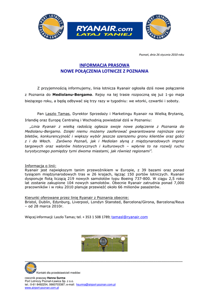 Poznań, dnia 26 stycznia 2010 roku INFORMACJA PRASOWA NOWE POŁĄCZENIA LOTNICZE Z POZNANIA Z przyjemnością informujemy, linia lotnicza Ryanair ogłosiła dziś nowe połączenie z Poznania do Mediolanu-Bergamo. Rejsy na tej trasie rozpoczną się już 1-go maja bieżącego roku, a będą odbywać się trzy razy w tygodniu: we wtorki, czwartki i soboty. Pan Laszlo Tamas, Dyrektor Sprzedaży i Marketingu Ryanair na Wielką Brytanię, Irlandię oraz Europę Centralną i Wschodnią powiedział dziś w Poznaniu: „Linia Ryanair z wielką radością ogłasza swoje nowe połączenie z Poznania do Mediolanu-Bergamo. Dzięki niemu możemy zaoferować gwarantowane najniższe ceny biletów, konkurencyjność i większy wybór jeszcze szerszemu gronu klientów oraz gości z i do Włoch. Zarówno Poznań, jak i Mediolan słyną z międzynarodowych imprez targowych oraz walorów historycznych i kulturowych – wpłynie to na rozwój ruchu turystycznego pomiędzy tymi dwoma miastami, jak również regionami”. Informacja o linii: Ryanair jest największym tanim przewoźnikiem w Europie, z 39 bazami oraz ponad tysiącem międzynarodowych tras w 26 krajach, łącząc 150 portów lotniczych. Ryanair dysponuje flotą liczącą 219 nowych samolotów typu Boeing 737-800. W ciągu 2,5 roku lat zostanie zakupione 104 nowych samolotów. Obecnie Ryanair zatrudnia ponad 7,000 pracowników i w roku 2010 planuje przewieźć około 66 milionów pasażerów. Kierunki oferowane przez linię Ryanair z Poznania obecnie: Bristol, Dublin, Edynburg, Liverpool, Londyn Stansted, Barcelona/Girona, Barcelona/Reus – od 28 marca 2010r. Więcej informacji: Laszlo Tamas; tel. + 353 1 508 1789; [email protected] __________________________________________________________________________________ Kontakt dla przedstawicieli mediów: rzecznik prasowy Hanna Surma Port Lotniczy Poznań-Ławica Sp. z o.o. tel.: 0-61 8492254, 0660703387; e-mail: [email protected] www.airport-poznan.com.pl