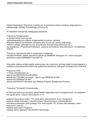 Zakład Diagnostyki Obrazowej Zakład Diagnostyki Obrazowej znajduje się na pierwszym piętrze pawilonu diagnostyczno zabiegowego Szpitala Powiatowego w Pszczynie. W Zakładzie funkcjonują następujące pracownie: Pracownia Rentgenowska w ramach której wykonuje się: ogólnodiagnostyczne zdjęcia rentgenowskie w pełnym zakresie; lekarskie badania kontrastowe narządów jamy brzusznej i kanału kręgowego; niektóre zabiegi radiologiczne (np. przezskórne drenaże dróg żółciowych itp.); we współpracy z Pracownią Endoskopii - badania kontrastowe dróg żółciowych i trzustkowych (ERCP). Pracownia wyposażona jest w następujące urządzenia: dwustanowiskowy zdalnie sterowany aparat rtg SIEMENS Siregraph CF z torem wizyjnym, przewoźny aparat SIEMENS Polymobil-10. Wszystkie zdjęcia rentgenowskie wykonywane są w technice cyfrowej dzięki funkcjonującemu z Zakładzie od października 2004 roku systemowi pośredniej radiografii cyfrowej firmy FUJIFILM. Pracownia USG w której zainstalowane są: aparat usg MEDISON SonoAce6000 aparat usg TOSHIBA Sonolayer - aparat usg SIEMENS SI-250 aparat usg SIEMENS SI-250 aparat usg ESAOTE MyLab25 (dar Wielkiej Orkiestry Świątecznej Pomocy) Pracownia Tomografii Komputerowej w Pracowni wykonuje sie pełny zakres badań diagnostycznych tomograficznych (za wyjątkiem tomografii serca i naczyń wieńcowych) m. in.: badania naczyniowe (angio - TK) aorty tętnic obwodowych, w tym mózgowych; badania układu kostnego z rekonstrukcjami trójwymiarowymi wysokiej jakości; wirtualne endoskopie: jelita grubego (tzw. kolonografia TK), drzewa oskrzelowego, zatok obocznych nosa itp.; badanie perfuzyjne mózgowia; badanie łuków zębowych dla potrzeb implantologii. 1/2 Zakład Diagnostyki Obrazowej Pracownia wyposażona jest w tomograf spiralny 16-rzędowy General Electric BrightSpeed Elite dwie nowoczesne stacje diagnostyczneGE Advantage Workstation 4.1 oraz AdW 4.4 . Zakład Diagnostyki Obrazowej pracuje w systemie 24-godzinnym - szczegółowych informacji o godzinach wykonywania konkretnych badań udziela rejestracja Zakładu pod bezpośrednim numerem telefonu: (032) 44 90 015 lub poprzez centralę szpitalną: (032) 210 30 21, wew. 205. 2/2