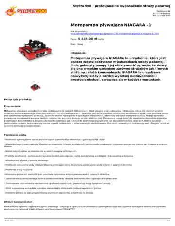 Strefa 998 - profesjonalne wyposażenie straży pożarnej Wietszyce 41 67-221 Białołęka tel: 723 895 900 Motopompa pływająca NIAGARA -1 link do produktu: http://strefa998.pl/motopompy-plywajace/191-motopompa-plywajaca-niagara-1-.html Cena: 5 535,00 zł brutto Stan: Nowy Informacje: Motopompa pływająca NIAGARA to urządzenie, które jest bardzo często spotykane w jednostkach straży pożarnej. Małe gabaryty pompy i jej efektywność sprawia, że cieszy się ona wysokim uznaniem zarówno strażaków jak i innych służb np.: służb komunalnych. NIAGARA to urządzenie najwyższej klasy o bardzo wysokiej niezawodności i prostocie obsługi, sprawdza się w każdych warunkach. Pełny opis produktu Przeznaczenie Motopompy pływające posiadają szerokie zastosowanie w służbach ratowniczych. Obok głównej grupy odbiorców – strażaków, cieszą się również wysokim uznaniem wśród pracowników służb komunalnych, leśnych, budowlanych – wszędzie tam gdzie zachodzi konieczność pompowania wody. Małe gabaryty pomp, przy optymalnej wydajności sprawiają, że jest to idealne rozwiązanie w sytuacjach kryzysowych, gdzie liczy się czas i efektywność pracy. Napęd spalinowy pozwala na zastosowanie pomp w każdym miejscu, bez potrzeby dostępu do sieci elektrycznej. Motopompy mogą służyć do napełniania zbiorników pojazdów pożarniczych bez potrzeby budowania stanowiska wodnego, jak również do awaryjnego nawadniania lub osuszania terenów rolniczych. Dobra wysokość podnoszenia sprawia, że motopompy można używać na terenach o zróżnicowanym ukształtowaniu. Dla służb ratowniczych motopompy serii „Niagara” to od lat synonim solidności i niezawodności. Podstawowe cechy - Możliwość wykorzystania we wszystkich typach samochodów ratowniczo - gaśniczych PSP i OSP. - Niewielka waga i małe gabaryty ułatwiają przewożenie (również w większości samochodów osobowych) i transport pompy do miejsca akcji nawet w trudnym terenie. - Niskie zużycie paliwa w stosunku do wysokich osiągów technicznych. - Prostota konstrukcji i zastosowanie wysokiej jakości podzespołów czynią pompę łatwą w obsłudze i niezawodną w działaniu. - Niezatapialny pływak z włókna szklanego. - Możliwość podawania wody o dużym stopniu zanieczyszczenia, co ułatwia pompowanie wody z piwnic i zalanych obiektów. - Możliwość pracy na sucho - Minimalna głębokość ssania 30 mm umożliwia optymalne wypompowanie wody z zalanych obiektów. - Zastosowanie czterosuwowego silnika pozwala stosować benzynę bez konieczności sporządzania mieszanki. - Zastosowane uszczelnienia mechaniczne (grafitowo-ceramiczne) gwarantują długą żywotność pompy. - Silnik wyposażony w regulator obrotów zapewniający utrzymanie zadanej wydajności pompy. - Elementy pompy ze specjalnych stopów aluminium zapewniają odporność na korozję. Jakość i bezpieczeństwo Produkowana zgodnie z wymogami rynku krajowego i unijnego w oparciu o certyfikowany system jakości ISO 9001.Spełnia wymagania techniczno-użytkowe według rozporządzenia MSWiA i Dyrektywy Maszynowej 2006/42/WE. 8-03-2017 1/2 Dane techniczne Maks. zasięg rzutu wody 30 m Wysokość podnoszenia do Nasada tłoczona 75 Min. głębokość ssania Silnik do 30 m słupa wody 30 mm Honda GXV 160 K 1A/N 15 Moc (3600 obr./min)4 kW Zużycie paliwa 0,931 l/h Pojemność zbiornika 1,81 l Czas pracy na pełnym zbiorniku Ciężar motopompy Wymiary gabarytowe 2 godz. 28 kg 770 x 430 x 630 mm Maks. wydajność 1200 dm3/min Wydajność nominalna (przy 2 barach) 8-03-2017 400 dm3/min 2/2