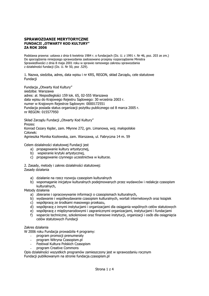 SPRAWOZDANIE MERYTORYCZNE FUNDACJI „OTWARTY KOD KULTURY” ZA ROK 2006 Podstawa prawna: ustawa z dnia 6 kwietnia 1984 r. o fundacjach (Dz. U. z 1991 r. Nr 46, poz. 203 ze zm.) Do sporządzenia niniejszego sprawozdania zastosowano przepisy rozporządzenie Ministra Sprawiedliwości z dnia 8 maja 2001 roku w sprawie ramowego zakresu sprawozdania z działalności fundacji (Dz. U. Nr 50, poz .529). 1. Nazwa, siedziba, adres, data wpisu i nr KRS, REGON, skład Zarządu, cele statutowe Fundacji Fundacja „Otwarty Kod Kultury” siedziba: Warszawa adres: al. Niepodległości 159 lok. 65, 02-555 Warszawa data wpisu do Krajowego Rejestru Sądowego: 30 września 2003 r. numer w Krajowym Rejestrze Sądowym: 0000172551 Fundacja posiada status organizacji pożytku publicznego od 8 marca 2005 r. nr REGON: 015577950 Skład Zarządu Fundacji „Otwarty Kod Kultury” Prezes: Konrad Cezary Kęder, zam. Młynne 272, gm. Limanowa, woj. małopolskie Członek: Agnieszka Monika Kozłowska, zam. Warszawa, ul. Fabryczna 14 m. 59 Celem działalności statutowej Fundacji jest a) propagowanie kultury artystycznej, b) wspieranie krytyki artystycznej, c) propagowanie czynnego uczestnictwa w kulturze. 2. Zasady, metody i zakres działalności statutowej: Zasady działania a) działanie na rzecz rozwoju czasopism kulturalnych b) wspomaganie inicjatyw kulturalnych podejmowanych przez wydawców i redakcje czasopism kulturalnych, Metody działania a) zbieranie i opracowywanie informacji o czasopismach kulturalnych, b) wydawanie i współwydawanie czasopism kulturalnych, wortali internetowych oraz książek c) współpracę ze środkami masowego przekazu, d) współpracę z innymi instytucjami i organizacjami dla osiągania wspólnych celów statutowych e) współpracę z międzynarodowymi i zagranicznymi organizacjami, instytucjami i fundacjami f) wsparcie techniczne, szkoleniowe oraz finansowe instytucji, organizacji i osób dla osiągnięcia celów statutowych Fundacji Zakres działania W 2006 roku Fundacja prowadziła 4 programy: - program promocji prenumeraty - program Witryna Czasopism.pl - Festiwal Kultura Polskich Czasopism - program Creative Commons Opis działalności wszystkich programów zamieszczony jest w sprawozdaniu rocznym Fundacji publikowanym na stronie fundacja.czasopism.pl Strona 1 z 4 3. Fundacja „Otwarty Kod Kultury” nie prowadzi działalności gospodarczej. 4. Zarząd Fundacji „Otwarty Kod Kultury” podejmuje uchwały i decyzje na posiedzeniach. Decyzje Zarządu zapisywane są w protokołach; decyzje dotyczące przyznanych dotacji zamieszczone są w sprawozdaniu rocznym Fundacji publikowanym na stronie fundacja.czasopism.pl. Uchwały Zarządu Fundacji „Otwarty Kod Kultury”: Uchwała nr 1/2006 Zarządu Fundacji Otwarty Kod Kultury z dnia 31 marca 2006 roku W dniu 31 marca 2006 roku Zarząd Fundacji „Otwarty Kod Kultury” podjął uchwałę o przyjęciu bilansu za rok 2005 przygotowanego przez firmę Soltax sp. z o.o. i przedstawieniu go Radzie Fundacji z wnioskiem o zatwierdzenie. Uchwała nr 2/2006 Zarządu Fundacji Otwarty Kod Kultury z dnia 31 marca 2006 roku W dniu 31 marca 2006 roku Zarząd Fundacji „Otwarty Kod Kultury” podjął uchwałę o zmianie siedziby Fundacji ze względu na nieadekwatną do potrzeb realizowanych przez Fundację programów powierzchnię lokalu przy ul. Mazowieckiej 12. Uchwała nr 3/2006 Zarządu Fundacji Otwarty Kod Kultury z dnia 12 czerwca 2006 roku W dniu 12 czerwca 2006 roku Zarząd Fundacji „Otwarty Kod Kultury” podjął uchwałę o przedstawieniu Radzie Fundacji propozycji przyjęcia w poczet członków Rady pani Katarzyny Olgi Szotkowskiej. 5. Informacja o wysokości uzyskanych przychodów: Przychody z działalności statutowej nieodpłatnej Przychody z działalności statutowej odpłatnej Pozostałe przychody Przychody finansowe Łącznie 131 170,30 22 329,18 500,00 3,62 154 003,10 6. Informacja o poniesionych kosztach: Koszty realizacji zadań statutowych działalności nieodpłatnej Koszty realizacji zadań statutowych działalności odpłatnej Pozostałe koszty Koszty finansowe Koszty administracyjne łącznie 92 459,23 15 208,15 0,00 1 187,05 17 165,96 126 020,39 7. Dane o: a) liczbie osób zatrudnionych z podziałem na stanowiska (średnio rocznie) - prezes ogółem b) łącznej kwocie wynagrodzeń: - wynagrodzenia - nagrody łącznie c) wysokości rocznego wynagrodzenia wypłaconego członkom Zarządu: - wysokość rocznego wynagrodzenia wypłaconego członkom Zarządu d) wydatkach na wynagrodzenia z umów zlecenia: 1,0 1,0 17 689,70 0,00 17 689,70 17 689,70 nie dotyczy Strona 2 z 4 e) pożyczkach pieniężnych nie dotyczy f) kwotach ulokowanych na rachunkach bankowych (stan na dzień 31 grudnia 2006 roku) Bre Bank SA Oddział Korporacyjny Warszawa Opis rachunku Waluta Saldo w walucie PLN - RACHUNEK BIEŻ.POMOCNICZY PLN 0,01 PLN - RACHUNEK BIEŻĄCY PLN 260,32 USD - RACH.TECH.NEGOCJOWANENTWW USD 0,00 PLN - RACHUNEK BIEŻ.POMOCNICZY PLN 0,08 EUR - RACH.TECH.NEGOCJOWANE NTWW EUR 0,00 PLN - RACHUNEK BIEŻ.POMOCNICZY PLN 2.233,70 PLN - RACH.TECH.NEGOCJOWANE NTWW PLN 0,00 g) wartości posiadanych na dzień 31.12.2006 obligacji oraz wielkości nabytych akcji w spółkach prawa handlowego: nie dotyczy h) nabytych nieruchomościach nie dotyczy i) nabytych pozostałych środkach trwałych nie dotyczy j) wartości aktywów i zobowiązań fundacji ujętych sprawozdaniach finansowych AKTYWA 4 811,11 Aktywa trwałe 2000,00 Wartości niematerialne i prawne 0,00 Rzeczowe aktywa trwałe 0,00 Należności długoterminowe 2000,00 Inwestycje długoterminowe 0,00 Długoterminowe rozliczenia międzyokresowe 0,00 Aktywa obrotowe 2 661,11 Zapasy rzeczowych aktywów obrotowych 0,00 Należności krótkoterminowe 167,00 Inwestycje krótkoterminowe 2 494,11 Środki pieniężne 2 494,11 Pozostałe aktywa finansowe 0,00 Krótkoterminowe rozliczenia międzyokresowe 150,00 PASYWA Fundusze własne Fundusz statutowy Fundusz z aktualizacji wyceny Wynik finansowy net