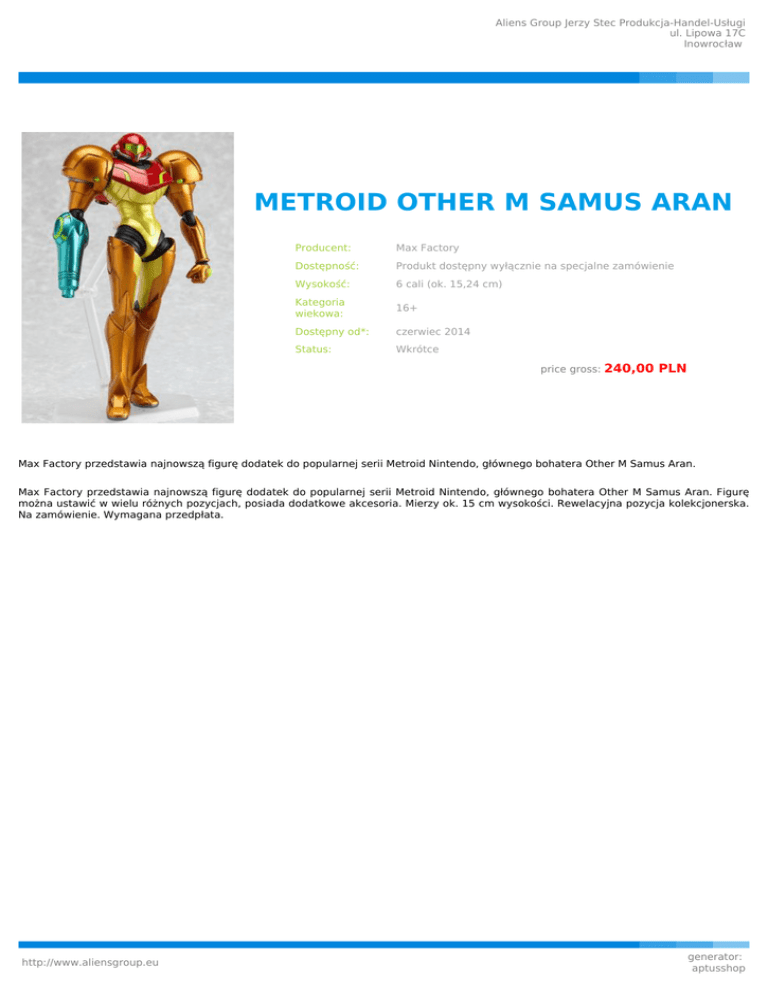 Aliens Group Jerzy Stec Produkcja-Handel-Usługi ul. Lipowa 17C Inowrocław METROID OTHER M SAMUS ARAN Producent: Max Factory Dostępność: Produkt dostępny wyłącznie na specjalne zamówienie Wysokość: 6 cali (ok. 15,24 cm) Kategoria wiekowa: 16+ Dostępny od*: czerwiec 2014 Status: Wkrótce price gross: 240,00 PLN Max Factory przedstawia najnowszą figurę dodatek do popularnej serii Metroid Nintendo, głównego bohatera Other M Samus Aran. Max Factory przedstawia najnowszą figurę dodatek do popularnej serii Metroid Nintendo, głównego bohatera Other M Samus Aran. Figurę można ustawić w wielu różnych pozycjach, posiada dodatkowe akcesoria. Mierzy ok. 15 cm wysokości. Rewelacyjna pozycja kolekcjonerska. Na zamówienie. Wymagana przedpłata. http://www.aliensgroup.eu generator: aptusshop