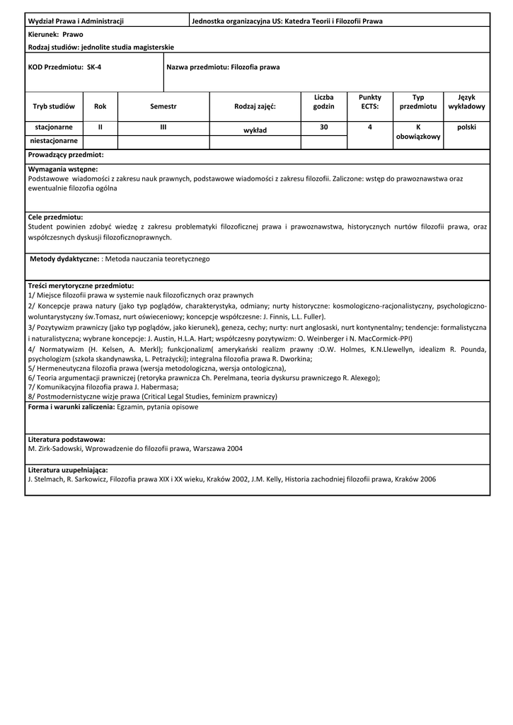 Wydział Prawa i Administracji Jednostka organizacyjna US: Katedra Teorii i Filozofii Prawa Kierunek: Prawo Rodzaj studiów: jednolite studia magisterskie KOD Przedmiotu: SK-4 Nazwa przedmiotu: Filozofia prawa Tryb studiów Rok Semestr Rodzaj zajęć: Liczba godzin Punkty ECTS: Typ przedmiotu Język wykładowy stacjonarne II III wykład 30 4 K obowiązkowy polski niestacjonarne Prowadzący przedmiot: Wymagania wstępne: Podstawowe wiadomości z zakresu nauk prawnych, podstawowe wiadomości z zakresu filozofii. Zaliczone: wstęp do prawoznawstwa oraz ewentualnie filozofia ogólna Cele przedmiotu: Student powinien zdobyć wiedzę z zakresu problematyki filozoficznej prawa i prawoznawstwa, historycznych nurtów filozofii prawa, oraz współczesnych dyskusji filozoficznoprawnych. Metody dydaktyczne: : Metoda nauczania teoretycznego Treści merytoryczne przedmiotu: 1/ Miejsce filozofii prawa w systemie nauk filozoficznych oraz prawnych 2/ Koncepcje prawa natury (jako typ poglądów, charakterystyka, odmiany; nurty historyczne: kosmologiczno-racjonalistyczny, psychologicznowoluntarystyczny św.Tomasz, nurt oświeceniowy; koncepcje współczesne: J. Finnis, L.L. Fuller). 3/ Pozytywizm prawniczy (jako typ poglądów, jako kierunek), geneza, cechy; nurty: nurt anglosaski, nurt kontynentalny; tendencje: formalistyczna i naturalistyczna; wybrane koncepcje: J. Austin, H.L.A. Hart; współczesny pozytywizm: O. Weinberger i N. MacCormick-PPI) 4/ Normatywizm (H. Kelsen, A. Merkl); funkcjonalizm( amerykański realizm prawny :O.W. Holmes, K.N.Llewellyn, idealizm R. Pounda, psychologizm (szkoła skandynawska, L. Petrażycki); integralna filozofia prawa R. Dworkina; 5/ Hermeneutyczna filozofia prawa (wersja metodologiczna, wersja ontologiczna), 6/ Teoria argumentacji prawniczej (retoryka prawnicza Ch. Perelmana, teoria dyskursu prawniczego R. Alexego); 7/ Komunikacyjna filozofia prawa J. Habermasa; 8/ Postmodernistyczne wizje prawa (Critical Legal Studies, feminizm prawniczy) Forma i warunki zaliczenia: Egzamin, pytania opisowe Literatura podstawowa: M. Zirk-Sadowski, Wprowadzenie do filozofii prawa, Warszawa 2004 Literatura uzupełniająca: J. Stelmach, R. Sarkowicz, Filozofia prawa XIX i XX wieku, Kraków 2002, J.M. Kelly, Historia zachodniej filozofii prawa, Kraków 2006
