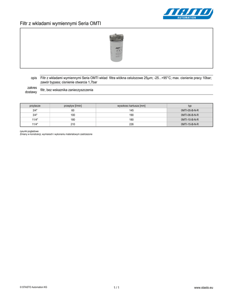 Filtr z wkladami wymiennymi Seria OMTI opis Filtr z wkladami wymiennymi Seria OMTI wklad filtra wlókna celulozowe 25µm; -25...+95°C; max. cisnienie pracy 10bar; zawór bypass; cisnienie otwarcia 1,7bar zakres filtr, bez wskaznika zanieczyszczenia dostawy przylacze przeplyw [l/min] wysokosc kartusza [mm] typ 3/4" 60 145 0MTI-05-B-N-R 3/4" 100 190 0MTI-06-B-N-R 11/4" 180 180 0MTI-10-B-N-R 11/4" 210 226 0MTI-15-B-N-R rysunki pogladowe Zmiany w konstrukcji, wymiarach i wykonaniu materialowym zastrzezone © STASTO Automation KG 1/1 www.stasto.eu