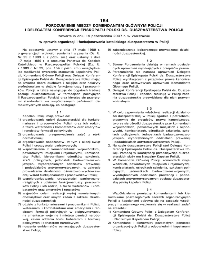 154 POROZUMIENIE MIĘDZY KOMENDANTEM GŁÓWNYM POLICJI I DELEGATEM KONFERENCJI EPISKOPATU POLSKI DS. DUSZPASTERSTWA POLICJI zawarte w dniu 19 października 2007 r. w Warszawie w sprawie organizacji i funkcjonowania katolickiego duszpasterstwa w Policji Na podstawie ustawy z dnia 17 maja 1989 r. o gwarancjach wolności sumienia i wyznania (Dz. U. Nr 29 z 1989 r. z późn. zm.) oraz ustawy z dnia 17 maja 1989 r. o stosunku Państwa do Kościoła Katolickiego w Rzeczypospolitej Polskiej (Dz. U. z 1989 r. Nr 29, poz. 154 z późn. zm.) uwzględniając możliwość tworzenia stanowisk kapelanów Policji, Komendant Główny Policji oraz Delegat Konferencji Episkopatu Polski ds. Duszpasterstwa Policji mając na uwadze dobro duchowe i religijne oraz należyty profesjonalizm w służbie funkcjonariuszy i pracowników Policji, a także nawiązując do bogatych tradycji posługi duszpasterskiej w formacjach policyjnych II Rzeczypospolitej Polskiej oraz kierując się przyjętymi standardami we współczesnych państwach demokratycznych ustalają, co następuje: 1) 2) 3) 4) 5) 6) 7) 8) §1 Kapelani Policji mają prawo do: organizowania opieki duszpasterskiej dla funkcjonariuszy i pracowników Policji oraz ich rodzin, a także weteranów i kombatantów oraz emerytów i rencistów formacji policyjnych; organizowania, przeprowadzenia zajęć z etyki normatywnej; organizowania nabożeństw, w tym z okazji świąt Policji i uroczystości państwowych; współdziałania z komendantami: wojewódzkimi, powiatowymi (miejskimi i rejonowymi), komisariatów Policji, kierownikami ośrodków szkolenia, szkół policyjnych, jednostek badawczo-rozwojowych, wyodrębnionych oddziałów prewencji i pododdziałów antyterrorystycznych, w zakresie prowadzenia działalności oświatowo-wychowawczej wśród funkcjonariuszy i pracowników Policji; współorganizowania uroczystości patriotyczno-religijnych z udziałem funkcjonariuszy, pracowników Policji i ich rodzin, a także weteranów i kombatantów oraz emerytów i rencistów; wyjazdów celem realizacji wyżej wymienionych obowiązków oraz innych zadań z zakresu działalności duszpasterskiej; udziału z funkcjonariuszami i pracownikami Policji, weteranami i kombatantami oraz emerytami i rencistami formacji policyjnych w pielgrzymowaniu na cmentarze wojenne i miejsca pamięci narodowej, celem oddania hołdu bohaterom z formacji policyjnych i bohaterom narodowym; noszenia emblematów oznaczających duszpasterstwo Policji; 9) zabezpieczenia logistycznego prowadzonej działalności duszpasterskiej. §2 1. Strony Porozumienia działają w ramach posiadanych uprawnień wynikających z przepisów prawa. 2. Porozumienie nie narusza uprawnień Delegata Konferencji Episkopatu Polski ds. Duszpasterstwa Policji wynikających z przepisów prawa kanonicznego oraz ustawowych uprawnień Komendanta Głównego Policji. 3. Delegat Konferencji Episkopatu Polski ds. Duszpasterstwa Policji i kapelani realizują w Policji zadania duszpasterskie przewidziane dla nich prawem kościelnym. §3 1. W celu zapewnienia właściwej realizacji działalności duszpasterskiej w Policji zgodnie z potrzebami, stosownie do przepisów prawa kanonicznego, tworzy się ośrodki duszpasterskie przy komendach wojewódzkich, powiatowych (miejskich i rejonowych), komisariatach, ośrodkach szkolenia, szkołach policyjnych, jednostkach badawczo-rozwojowych, wyodrębnionych oddziałach prewencji i pododdziałach antyterrorystycznych Policji. 2. Na czele duszpasterstwa Policji stoi Delegat Konferencji Episkopatu Polski ds. Duszpasterstwa Policji. Pomocą w koordynacji przedsięwzięć duszpasterskich służy mu Naczelny Kapelan Policji. 3. W Komendzie Głównej Policji, komendach wojewódzkich, powiatowych (miejskich i rejonowych), komisariatach, ośrodkach szkolenia, szkołach policyjnych, jednostkach badawczo-rozwojowych, wyodrębnionych oddziałach prewencji i pododdziałach antyterrorystycznych posługę duszpasterską pełnią kapelani Policji. §4 Współdziałanie pomiędzy komendantami lub kierownikami poszczególnych szczebli organizacyjnych Policji a kapelanami odbywa się na zasadzie współpracy i wzajemnego wspierania się w realizacji zadań na szczeblu: 1) Komendant Główny Policji z Delegatem Konferencji Episkopatu Polski ds. Duszpasterstwa Policji i Naczelnym Kapelanem Policji; 2) Komendanci i kierownicy pozostałych jednostek organizacyjnych Policji z odpowiednimi kapelanami Policji. Dziennik Urzędowy Komendy Głównej Policji nr 20 -787- §5 1. Delegat Konferencji Episkopatu Polski ds. Duszpasterstwa Policji w porozumieniu z biskupem diecezjalnym (lub – wyższym przełożonym zakonnym) kieruje kapelanów do realizacji zadań duszpasterskich w Policji na podstawie stosownego dekretu. 2. Stosownie do przepisów prawa kanonicznego Delegat Konferencji Episkopatu Polski ds. Duszpasterstwa Policji ma prawo wnioskowania do Komendanta Głównego Policji o mianowanie i odwołanie ze stanowiska służbowego Naczelnego Kapelana i kapelanów Policji. 3. W zakresie doboru metod pracy i programów duszpasterskich Delegat Konferencji Episkopatu Polski ds. Duszpasterstwa Policji i kapelani są samodzielni. §6 W zakresie przestrzegania przepisów służby duszpasterskiej w Policji przełożonym dyscyplinarnym w stosunku do kapelanów Policji jest Delegat Konferencji Episkopatu Polski ds. Duszpasterstwa Policji. §7 Zatrudnianie kapelanów Policji odbywa się na zasadach określonych w odrębnych przepisach. §8 Komendant Główny Policji, komendanci Policji i kierownicy poszczególnych jednostek organizacyjnych Policji: 1) podejmują niezbędne czynności w celu zapewnienia odpowiednich warunków do wykonywania przez Naczelnego Kapelana i kapelanów Policji praktyk i posług religijnych oraz korzystania z tych posług przez funkcjonariuszy i pracowników poszczególnych jednostek organizacyjnych Policji; 2) umożliwiają wszystkim funkcjonariuszom, pracownikom Policji i ich rodzinom, weteranom i kombatantom