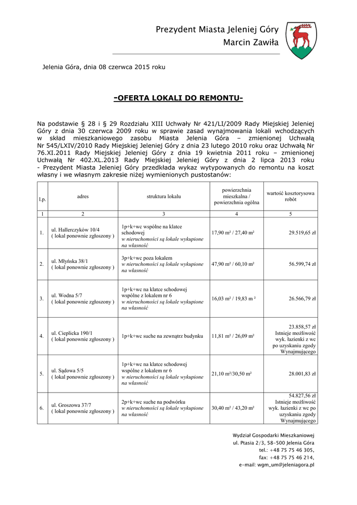 Prezydent Miasta Jeleniej Góry Marcin Zawiła Jelenia Góra, dnia 08 czerwca 2015 roku -OFERTA LOKALI DO REMONTUNa podstawie § 28 i § 29 Rozdziału XIII Uchwały Nr 421/LI/2009 Rady Miejskiej Jeleniej Góry z dnia 30 czerwca 2009 roku w sprawie zasad wynajmowania lokali wchodzących w skład mieszkaniowego zasobu Miasta Jelenia Góra – zmienionej Uchwałą Nr 545/LXIV/2010 Rady Miejskiej Jeleniej Góry z dnia 23 lutego 2010 roku oraz Uchwałą Nr 76.XI.2011 Rady Miejskiej Jeleniej Góry z dnia 19 kwietnia 2011 roku – zmienionej Uchwałą Nr 402.XL.2013 Rady Miejskiej Jeleniej Góry z dnia 2 lipca 2013 roku - Prezydent Miasta Jeleniej Góry przedkłada wykaz wytypowanych do remontu na koszt własny i we własnym zakresie niżej wymienionych pustostanów: adres struktura lokalu powierzchnia mieszkalna / powierzchnia ogólna wartość kosztorysowa robót 1 2 3 4 5 1. ul. Hallerczyków 10/4 ( lokal ponownie zgłoszony ) 2. ul. Młyńska 38/1 ( lokal ponownie zgłoszony ) 3. ul. Wodna 5/7 ( lokal ponownie zgłoszony ) 4. ul. Cieplicka 190/1 ( lokal ponownie zgłoszony ) 1p+k+wc suche na zewnątrz budynku 11,81 m² / 26,09 m² 5. ul. Sądowa 5/5 ( lokal ponownie zgłoszony ) 1p+k+wc na klatce schodowej wspólne z lokalem nr 6 w nieruchomości są lokale wykupione na własność 21,10 m²/30,50 m² ul. Groszowa 37/7 ( lokal ponownie zgłoszony ) 2p+k+wc suche na podwórku w nieruchomości są lokale wykupione na własność l.p. 6. 1p+k+wc wspólne na klatce schodowej w nieruchomości są lokale wykupione na własność 17,90 m² / 27,40 m² 29.519,65 zł 3p+k+wc poza lokalem w nieruchomości są lokale wykupione na własność 47,90 m² / 60,10 m² 56.599,74 zł 1p+k+wc na klatce schodowej wspólne z lokalem nr 6 w nieruchomości są lokale wykupione na własność 16,03 m² / 19,83 m ² 26.566,79 zł 30,40 m² / 43,20 m² 23.858,57 zł Istnieje możliwość wyk. łazienki z wc po uzyskaniu zgody Wynajmującego 28.001,83 zł 54.827,56 zł Istnieje możliwość wyk. łazienki z wc po uzyskaniu zgody Wynajmującego Wydział Gospodarki Mieszkaniowej ul. Ptasia 2/3, 58-500 Jelenia Góra tel.: +48 75 75 46 305, fax: +48 75 75 46 214, e-mail: [email protected] adres struktura lokalu powierzchnia mieszkalna / powierzchnia ogólna wartość kosztorysowa robót 1 2 3 4 5 7. ul. Jana Kasprowicza 55/9 ( lokal ponownie zgłoszony ) 1p+k+wc+schowek w nieruchomości są lokale wykupione na własność 8. ul. Jana Kasprowicza 2/5 ( lokal ponownie zgłoszony ) l.p. 9. ul. Groszowa 37/2 ( lokal ponownie zgłoszony ) 10. ul. Obrońców Pokoju 11/2 ( lokal ponownie zgłoszony ) 1p+k+wc wspólne z lokalem nr 6 na klatce schodowej w nieruchomości są lokale wykupione na własność 2p+k+ł z wc w nieruchomości są lokale wykupione na własność 1p+k+pp+ł z wc w nieruchomości są lokale wykupione na własność 1p+k + wc samodzielne na klatce schodowej 13,60 m²/21,30 m² 27.527,95 zł 15,19 m²/20,30 m² 28.476,43 zł 40,10 m²/53,00 m² 68.513,83 zł Istnieje możliwość pozostawienia łazienki z wc w lokalu po uzyskaniu zgody Wynajmującego 31,26 m²/56,26 m² 59.062,50 zł 46.971,59 zł Istnieje możliwość wyk. łazienki z wc z części kuchni po uzyskaniu zgody Wynajmującego 11. ul. Karkonoska 118/1 ( lokal ponownie zgłoszony ) 12. ul. Nadbrzeżna 22a/9 1p+k+wc wspólne z lokalem nr 6 na klatce schodowej 30,72 m²/60,75 m² 39.466,62 zł 13. ul. Nowowiejska 69/6 2p+k+pp+ł z wc 26,57 m²/53,96 m² 65.229,94 zł 14. ul. Kornela Makuszyńskiego 1/6 2p+k+pp+ł +2 komórki w nieruchomości są lokale wykupione na własność 22,64 m²/43,97 m² 42.248,36 zł 15. ul. Zaułek 9/3 2p+k+pp+wc wspólne z lokalem nr 4 na klatce schodowej 29,00 m²/38,80 m² 37.064,38 zł 16. ul. Zjednoczenia Narodowego 55/3 2p+k+wc samodzielne na klatce schodowej w nieruchomości są lokale wykupione na własność 34,70 m²/46,75 m² 24.828,80 zł Istnieje możliwość wyk. łazienki z wc z części kuchni po uzyskaniu zgody Wynajmującego 17. ul. Osiedle Robotnicze 7/5 1p+k+pp+ł z wc w nieruchomości są lokale wykupione na własność 27,57 m²/43,20 m² 38.096,81 zł 42,49 m²/67,86 m² 43.977,05 zł Istnieje możliwość wyk. pomieszczenia łazienki z części kuchni po uzyskaniu zgody Wynajmującego 18. ul. Osiedle Robotnicze 7/8 1p+k+pp+wc samodzielne na klatce schodowej w nieruchomości są lokale wykupione na własność 23,18 m² / 41,26 m² l.p. 1 19. adres struktura lokalu powierzchnia mieszkalna / powierzchnia ogólna wartość kosztorysowa robót 2 3 4 5 ul. Cieplicka 107/4 27,56 m²/48,53 m² 35.382,31 zł Istnieje możliwość wykonania łazienki w pomieszczeniu wc po uzyskaniu zgody Wynajmującego 1p+k+pp+wc + 2 pomieszczenia strychowe 17,00 m²/29,55 m² 40.583,36 zł Istnieje możliwość wyk. łazienki z pomieszczenia gospodarczego po uzyskaniu zgody Wynajmującego ul. Parkowa 4/3 2p+k+ł z wc Według inwentaryzacji 3p+k+ł z wc 39,14 m²/44,73 m² 32.184,94 zł al. Wojska Polskiego 22/3a 2p+k+pp+ wc i pp wspólny z lokalem nr 3 w nieruchomości są lokale wykupione na własność 33,20 m²/54,80 m² 40.025,98 zł 20. ul. Wincentego Pola 17/7 21. 22. 1p+k+pp+wc w nieruchomości są lokale wykupione na własność Oferty należy składać w Wydziale Gospodarki Mieszkaniowej Referacie Gospodarki Lokalami w Jeleniej Górze z siedzibą przy ul. Ptasiej 2/3 w pokoju nr 9 w godzinach urzędowania. Na podstawie art. 29 pkt. 2 wyżej cytowanej uchwały, warunkiem przyjęcia oferty jest wcześniejsze złożenie wniosku o zawarcie umowy najmu lokalu mieszkalnego z zasobu Miasta Jelenia Góra. Ze szczegółowymi informacjami dotyczącymi zakresu robót oraz kosztorysami zainteresowani mogą zapoznać się w Wydziale Gospodarki Mieszkaniowej - Referat Gospodarki Lokalami w Jeleniej Górze z siedzibą przy ul. Ptasiej 2/3 w pokoju nr 9. Wskazane lokale będzie można oglądać w godzinach urzędowania Zakładu Gospodarki Komunalnej i Mieszkaniowej na podstawie wydanego przez Wydział Gospodarki Mieszkaniowej wsk