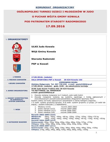 KOMUNIKAT ORGANIZACYJNY OGÓLNOPOLSKI TURNIEJ DZIECI I MŁODZIKÓW W JUDO O PUCHAR WÓJTA GMINY KOWALA POD PATRONATEM STAROSTY RADOMSKIEGO 17.09.2016 1. ORGANIZATORZY ULKS Judo Kowala Wójt Gminy Kowala Starosta Radomski PSP w Kowali 2.TERMIN 3. MIEJSCE ZAWODÓW 4.BIURO ZAWODÓW 5. ADRES ORGANIZATORA 6. ZASADY UCZESTNICTWA W ZAWODACH/ SYSTEM ZAWODÓW 7. WIEK 8. KATEGORIE WAGOWE 17.09.2016r. (sobota) HALA SPORTOWA PSP w Kowali 26-624 Kowala 103 KIEROWNIK BIURA Okólska Małgorzata Tel. 507 739 035 e-mail : [email protected] 17.09.2016r. (sobota) godz. 8:00 - do zakończenia turnieju ULKS Judo Kowla Trablice 83c 26-624 Kowala Tel.507739035 tel. 609503629 e-mail: [email protected] 1. Zawody zostaną rozegrane na 4 matach, pole walki 6x6m 2. Zawody rozegrane zostaną wg systemu zgodnego z liczbą zgłoszonych / zweryfikowanych zawodniczek/zawodników (Regulamin Sportowy PZJ). System zależy od liczby zgłoszonych zawodników w danej kategorii wagowej: 1-5 osób- system grupowy(1grupa); 6-8 osób- system grupowy (2 grupy );9 osób lub więcej – system francuski ( z repasażami) 1. 2. 3. 4. Młodzicy (U15) Dzieci starsze (U13) Dzieci młodsze (U11) Dzieci młodsze (U9) rocznik 2002-2003 rocznik 2004-2005 rocznik 2006-2007 rocznik 2008-2009 Rocznik 2002-2003 (U15) Młodziczki -36kg, -40kg, -44kg, -48 kg, -52kg, -57kg, -63kg, -70kg,+70 kg Młodzicy -38kg, -42kg, -46kg, -50kg, -55kg, -60kg, -66 kg, -73kg, -81kg, +81kg Rocznik 2004-2005 (U13) Dziewczynki: 30kg, 33kg, 36kg, 40kg, 44kg, 48kg, 52kg, 57kg, +57kg Chłopcy: 32kg, 35kg, 38kg, 42kg, 46kg, 50kg, 55kg, 60kg, +60kg Rocznik 2006-2007 (U11) Dziewczynki: 24kg, 27kg, 30kg, 33kg, 36kg, 40kg, 44kg, 48kg, 52kg, +52kg Chłopcy: 27kg, 30kg, 34kg, 38kg, 42kg, 46kg, 50kg, 55kg, +55kg 1 Rocznik 2008-2009: (U9) Dziewczynki i chłopcy : 21kg, 24kg, 27kg, 30kg, 33kg, 36kg, 40kg, +40kg 9. CZAS WALKI 10. JUDOGI 11. KOSZTY UCZESTNICTWA 12. OPŁATA STARTOWA 13. ZGŁOSZENIA SPORTOWE DO ZAWODÓW Do 16.09.2016 (godz. 12:00) Młodzicy, młodziczki – 3 minuty, Golden Score – z otwartym czasem walki Pozostałe roczniki – 2 minuty, Golden Score 1minuta 1. Obowiązują judogi białe. Drugi wyczytany zawodnik ma obowiązek założyć czerwoną przepaskę lub może startować w niebieskiej judogi. 2. Dopuszcza się posiadanie na judogi backnumbers ze swoim nazwiskiem. Zainteresowane Kluby. 30,00 zł od uczestnika( zgłoszenia elektroniczne do 16.09.2016) 40,00 zł w dniu zawodów Dokonywane będą tylko przez panel rejestracyjny na stronie www.judostat.pl/rejestracja do dnia 16 września 2016 do godz12:00. Osoby nie zgłoszone do turnieju przez panel rejestracyjny mogą zostać dopisane w dniu zawodów, opłata startowa wzrośnie do 40zł Dzieci: wszystkie grupy wiekowe . 9.00-10.00 Młodzicy: waga godz. 12.00-13.00 Podczas ważenia należy posiadać ważne badania lekarskie lub zgodę rodzica, trenera na start w zawodach. Uwaga : 1.Zawodnik/czka nie mieszczący się w limicie wagowym w kategorii wagowej, w której został zgłoszony zostanie automatycznie przepisany do innej kategorii wagowej. 2.Dopuszczalne jest100 gram tolerancji (podczas ważenia wszyscy zawodnicy i zawodniczki muszą mieć na sobie bieliznę osobistą ). 3.Można wziąć udział w zawodach tylko w jednej grupie wiekowej i wagowej. 14. WAŻENIE 15. SĘDZIOWANIEPRZEPISY WALK TECHNIKI ZAKAZANE Grupa U15 Młodziczek i Młodzików możliwe jest wykonywanie technik z kolan, technik poświęcenia, dźwigni i duszeń. Obowiązują zasady sędziowania wg regulaminu PZJudo. Grupa U13 – zabronione są dźwignie i duszenia Grupa U 11, U9 – zabronione są dźwignie i duszenia, zabronione są rzuty z kolan i poświęcenia. We wszystkich grupach zawodnicy mogą otrzymywać kary shido i hansokumake. W grupach dzieci, kary nie będą dawane tak rygorystycznie jak w zawodach młodzików, pierwsze będzie upomnienie słowne. 16. PROGRAM ZAWODÓW NAGRADZANIE, CEREMONIA DEKORACJI GODZ. 9:00-10:00 ważenie grupa dzieci Godz. 10:00-11:00 weryfikacja i losowanie zawodów dzieci Godz. 11:00 Otwarcie Turnieju Godz. 12:00-13:00 ważenie młodziczek i młodzików Godz. 13:00-13:45 weryfikacja i losowanie Dekoracje zawodników po każdej zakończonej kategorii wiekowej. W ceremonii dekoracji uczestniczą zawodniczki i zawodnicy z miejsc I-V. Zawodniczki/zawodnicy, którzy zdobyli miejsca I-III w każdej kategorii wagowej otrzymują medal , dyplom i nagrodę; miejsce V – dyplom. Puchary dla 3 najlepszych klubów w klasyfikacji ogólnej. Puchary dla najlepszej zawodniczki i zawodnika Turnieju. 17. INNE INFORMACJE 1. Zawodniczki / zawodnicy muszą posiadać ważne ubezpieczenie od następstw nieszczęśliwych wypadków NNW. Odpowiedzialność za zapewnienie ubezpieczenia dla uczestników zawodów spoczywa na klubach. 2. Na miejscu czynny będzie bufet z przekąskami. 3. Każdy zawodnik otrzyma drobny poczęstunek. 4. Istnieje możliwość zamówienia obiadu w cenie 15zł po wcześniejszym zgłoszeniu na e-mail : [email protected] Życzymy przyjemnego pobytu w Kowali 2 3