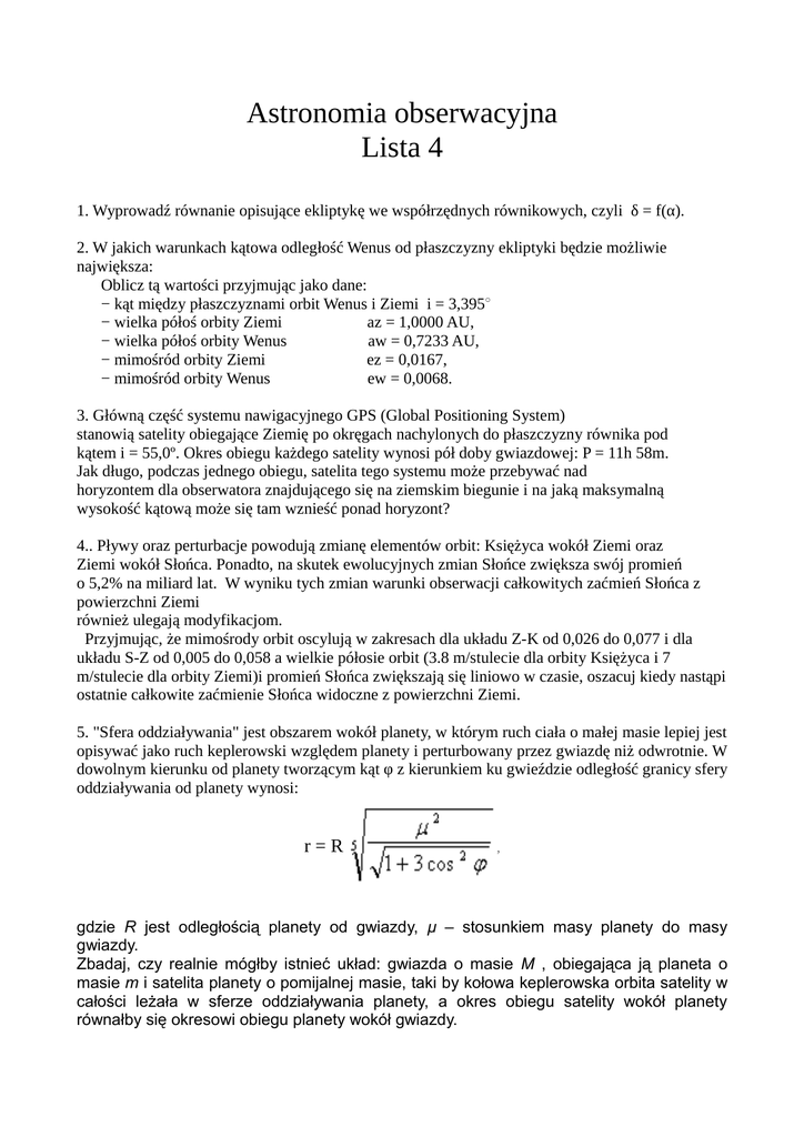 Astronomia obserwacyjna Lista 4 1. Wyprowadź równanie opisujące ekliptykę we współrzędnych równikowych, czyli δ = f(α). 2. W jakich warunkach kątowa odległość Wenus od płaszczyzny ekliptyki będzie możliwie największa: Oblicz tą wartości przyjmując jako dane: − kąt między płaszczyznami orbit Wenus i Ziemi i = 3,395○ − wielka półoś orbity Ziemi az = 1,0000 AU, − wielka półoś orbity Wenus aw = 0,7233 AU, − mimośród orbity Ziemi ez = 0,0167, − mimośród orbity Wenus ew = 0,0068. 3. Główną część systemu nawigacyjnego GPS (Global Positioning System) stanowią satelity obiegające Ziemię po okręgach nachylonych do płaszczyzny równika pod kątem i = 55,0º. Okres obiegu każdego satelity wynosi pół doby gwiazdowej: P = 11h 58m. Jak długo, podczas jednego obiegu, satelita tego systemu może przebywać nad horyzontem dla obserwatora znajdującego się na ziemskim biegunie i na jaką maksymalną wysokość kątową może się tam wznieść ponad horyzont? 4.. Pływy oraz perturbacje powodują zmianę elementów orbit: Księżyca wokół Ziemi oraz Ziemi wokół Słońca. Ponadto, na skutek ewolucyjnych zmian Słońce zwiększa swój promień o 5,2% na miliard lat. W wyniku tych zmian warunki obserwacji całkowitych zaćmień Słońca z powierzchni Ziemi również ulegają modyfikacjom. Przyjmując, że mimośrody orbit oscylują w zakresach dla układu Z-K od 0,026 do 0,077 i dla układu S-Z od 0,005 do 0,058 a wielkie półosie orbit (3.8 m/stulecie dla orbity Księżyca i 7 m/stulecie dla orbity Ziemi)i promień Słońca zwiększają się liniowo w czasie, oszacuj kiedy nastąpi ostatnie całkowite zaćmienie Słońca widoczne z powierzchni Ziemi. 5. "Sfera oddziaływania" jest obszarem wokół planety, w którym ruch ciała o małej masie lepiej jest opisywać jako ruch keplerowski względem planety i perturbowany przez gwiazdę niż odwrotnie. W dowolnym kierunku od planety tworzącym kąt φ z kierunkiem ku gwieździe odległość granicy sfery oddziaływania od planety wynosi: r=R , gdzie R jest odległością planety od gwiazdy, µ – stosunkiem masy planety do masy gwiazdy. Zbadaj, czy realnie mógłby istnieć układ: gwiazda o masie M , obiegająca ją planeta o masie m i satelita planety o pomijalnej masie, taki by kołowa keplerowska orbita satelity w całości leżała w sferze oddziaływania planety, a okres obiegu satelity wokół planety równałby się okresowi obiegu planety wokół gwiazdy.