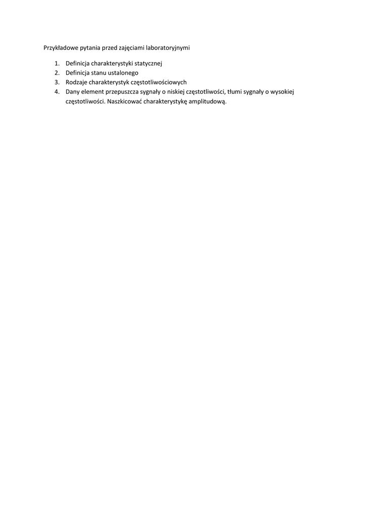 Przykładowe pytania przed zajęciami laboratoryjnymi 1. 2. 3. 4. Definicja charakterystyki statycznej Definicja stanu ustalonego Rodzaje charakterystyk częstotliwościowych Dany element przepuszcza sygnały o niskiej częstotliwości, tłumi sygnały o wysokiej częstotliwości. Naszkicowad charakterystykę amplitudową.