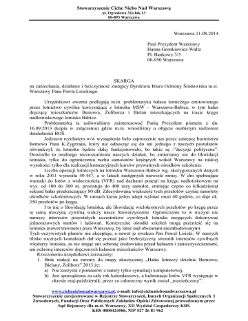 Stowarzyszenie Ciche Niebo Nad Warszawą ul. Ogrodowa 32a lok.13 00-893 Warszawa Warszawa 11.08.2014 Pani Prezydent Warszawy Hanna Gronkiewicz-Waltz Pl. Bankowy 3/5 00-950 Warszawa SKARGA na zaniechania, działanie i bezczynność zastępcy Dyrektora Biura Ochrony Środowiska m.st. Warszawy Pana Pawła Lisickiego. Urzędnikowi owemu podlegają m.in. problematyka hałasu lotniczego emitowanego przez lotnictwo cywilne korzystające z lotniska MSW – Warszawa-Babice, w tym hałas dręczący mieszkańców Bemowa, Żoliborza i Bielan mieszkających na trasie kręgu nadlotniskowego lotniska Babice. Problematyką ta usiłowaliśmy zainteresować Panią Prezydent pismem z dn. 16.09.2013 (kopia w załączeniu) gdzie m.in. wnosiliśmy o objęcie osobistym nadzorem działalności BOŚ. Jedynym rezultatem w/w wystąpienia było zaproszenie nas przez zastępcę burmistrza Bemowa Pana K.Zygrzaka, który nie odnosząc się do ani jednego z naszych postulatów oświadczył, że lotnisko będzie dalej funkcjonowało, bo takie są :”decyzje polityczne”. Dowiodło to totalnego niezrozumienia naszych działań, bo zmierzamy nie do likwidacji lotniska, tylko do ograniczenia ruchu samolotów krążących wokół Warszawy na niskiej wysokości tylko dla realizacji komercyjnych kursów prywatnych ośrodków szkolenia. Liczba operacji lotniczych na lotnisku Warszawa-Babice wg. skorygowanych danych w roku 2011 wynosiła 40 447, a w latach następnych niewiele mniej. W dni spełniające warunki do lotów z widocznością (VFR) nad dachami posesji na kręgu nadlotiskowym na wys. od 100 do 300 m. przelatuje do 400 razy samolot, emitując często co kilkadziesiąt sekund hałas przekraczający 80 dB. Zdecydowaną większość tych przelotów czynią samoloty ośrodków szkoleniowych. W ramach kursu jeden adept wylatać musi 40 godzin, co daje ok. 350 przelotów po kręgu. I to nie o likwidację lotniska, ale likwidację wielokrotnych przelotów po kręgu przez tę samą maszynę cywilną walczy nasze Stowarzyszenie. Ograniczenie to w niczym nie naruszy interesów pozostałych uczestników cywilnych lotniska mogących dokonywać jednorazowych startów i lądowań. Komercyjne ośrodki szkoleń mogą przenieść się na lotniska (nawet trawiaste) poza Warszawę, by latać nad obszarami niezabudowanymi. Tych oczywistych planów nie akceptuje, a nawet je zwalcza Pan Paweł Lisicki. W naszych blisko rocznych kontaktach dał się poznać jako bezkrytyczny stronnik interesów cywilnych włodarzy lotniska, za nic mając ani ochronę środowiska przed hałasem i zanieczyszczeniami, ani ochronę interesów dręczonych hałasem mieszkańców Warszawy. Rzeczonemu urzędnikowi zarzucamy: 1. Brak reakcji na zarzuty do mapy akustycznej „Hałas lotniczy dzielnic Bemowo, Bielany, Żoliborz” 2013 że: a) Nie korzysta z pomiarów z natury tylko symulacji komputerowej, b) Jest sporządzona za cały rok kalendarzowy, a kulminacja lotów VFR występuje w okresie maj-październik, przez co całoroczny wynik został „rozcieńczony”. www.cicheniebonadwarszawa.pl, e-mail: [email protected] Stowarzyszenie zarejestrowane w Rejestrze Stowarzyszeń, Innych Organizacji Społecznych I Zawodowych, Fundacji Oraz Publicznych Zakładów Opieki Zdrowotnej prowadzonym przez Sąd Rejonowy dla m.st. Warszawy, XII Wydział Gospodarczy KRS KRS 0000424586, NIP 527 26 81 962 Stowarzyszenie Ciche Niebo Nad Warszawą ul. Ogrodowa 32a lok.13 00-893 Warszawa 2. 3. 4. 5. c) Nie bierze pod uwagę strefy startów (ok. 3 km długości, przemiennie w stronę płn. i płd.) gdzie warunki akustyczne przez niską wysokość i pracujący na wysokich obrotach silnik są dużo gorsze niż na pozostałych odcinkach kręgu. Przygotowanie projektu uchwały Rady Warszawy Program Ochrony Środowiska przed Hałasem (listopad 2013) ze zmanipulowanymi danymi do tabeli: „Porównanie wyników ciągłego monitoringu hałasu wokół lotniska Warszawa-Babice od 2008 do 2011”. Zaproponowane dane dotyczyły miesiąca czerwiec, co dało niezmienny wynik 47,5 dB przez wszystkie lata, kiedy zaś wybór każdego innego miesiąca pokazałby tendencje rosnącą. Po naszej interwencji u Przewodniczącego Komisji Ochrony Środowiska Rady Warszawy do porównania w uchwale POŚPH przyjęto miesiąc lipiec z danymi: za rok 2008 – 46,5 dB, 2009 – 49,2 dB, 2010 – 51,1 dB, 2011 – 53,3 dB. Bezczynność i arogancję w zakresie realizacji p. 10.4.2 Uchwały Program Ochrony Środowiska Przed Hałasem dla m.st. Warszawy (grudzień 2013) mówiącego o ograniczeniu maksymalnej liczby operacji lotniczych. Cyt: „Ustalenie limitów operacji powinno być przeprowadzone na drodze negocjacji społeczności lokalnej z zarządem lotniska, z udziałem Biura Ochrony Środowiska Urzędu m.st. Warszawy oraz Urzędu Lotnictwa Cywilnego.” Do dnia dzisiejszego BOŚ nie przedsięwziął w tej sprawie żadnej inicjatywy, a na nasz zarzut w piśmie do Samorządowego Kolegium Odwoławczego z dn. 22.07.2014 (OS-I-AŚ.6251.1.2014 AGL - w załączeniu) Pan Lisicki odpowiada i pisze, że „…uchwała nie nakazuje realizacji obowiązku w trybie natychmiastowym. Realizacja powyższych działań przewidziana jest do roku 2018.”! Wymowa tej wypowiedzi jest oburzająca, bo oznacza, że dręczeni przez hałas Warszawiacy mogą poczekać jeszcze 4 lata! aż odpowiedzialny za temat urzędnik raczy się wziąć do pracy. Z przykrością konstatujemy, że pismo powyższe sygnowane jest „z up. Prezydent m.st. Warszawy.” Bezczynność w zakresie realizacji p.10.4.2 powyższej uchwały mówiącej iż dla minimalizacji konfliktu społecznego „…zaleca się konsultowania lokalizacji punktów pomiarowych ciągłego monitoringu hałasu z przedstawicielami społeczności lokalnej oraz Biurem Ochrony Środowiska Urzędu m.st. Warszawy i Mazowieckim Wojewódzkim Inspektorem Ochrony Środowiska w Warszawie.” Do dnia dzisiejszego konsultacje takie nie zostały zorganizowane, a wadliwe lokalizacje obowiązkowych p