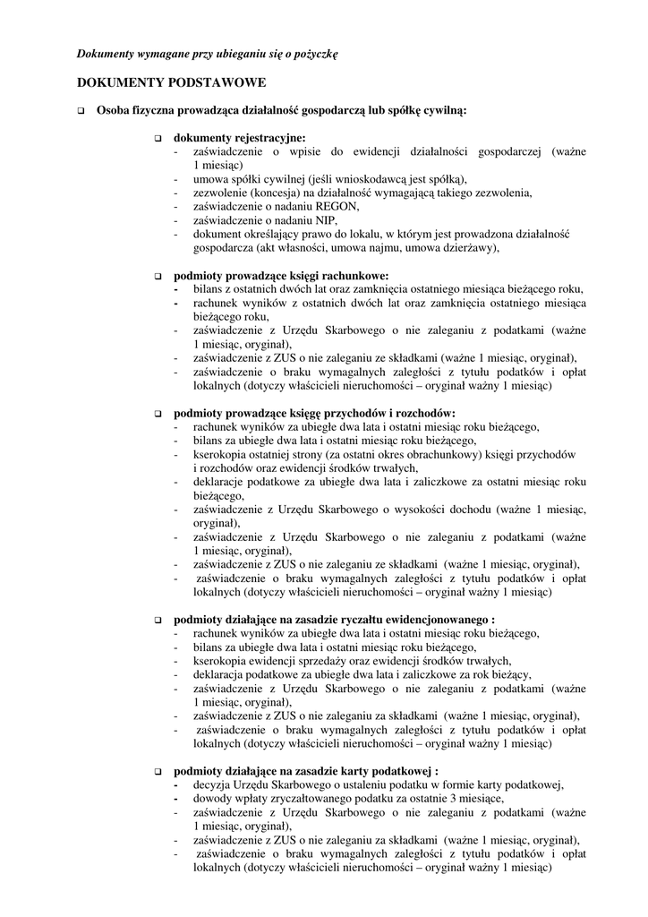 Dokumenty wymagane przy ubieganiu si o po yczk DOKUMENTY PODSTAWOWE Osoba fizyczna prowadz ca działalno gospodarcz lub spółk cywiln : dokumenty rejestracyjne: - za wiadczenie o wpisie do ewidencji działalno ci gospodarczej (wa ne 1 miesi c) - umowa spółki cywilnej (je li wnioskodawc jest spółk ), - zezwolenie (koncesja) na działalno wymagaj c takiego zezwolenia, - za wiadczenie o nadaniu REGON, - za wiadczenie o nadaniu NIP, - dokument okre laj cy prawo do lokalu, w którym jest prowadzona działalno gospodarcza (akt własno ci, umowa najmu, umowa dzier awy), podmioty prowadz ce ksi gi rachunkowe: - bilans z ostatnich dwóch lat oraz zamkni cia ostatniego miesi ca bie cego roku, - rachunek wyników z ostatnich dwóch lat oraz zamkni cia ostatniego miesi ca bie cego roku, - za wiadczenie z Urz du Skarbowego o nie zaleganiu z podatkami (wa ne 1 miesi c, oryginał), - za wiadczenie z ZUS o nie zaleganiu ze składkami (wa ne 1 miesi c, oryginał), - za wiadczenie o braku wymagalnych zaległo ci z tytułu podatków i opłat lokalnych (dotyczy wła cicieli nieruchomo ci – oryginał wa ny 1 miesi c) podmioty prowadz ce ksi g przychodów i rozchodów: - rachunek wyników za ubiegłe dwa lata i ostatni miesi c roku bie cego, - bilans za ubiegłe dwa lata i ostatni miesi c roku bie cego, - kserokopia ostatniej strony (za ostatni okres obrachunkowy) ksi gi przychodów i rozchodów oraz ewidencji rodków trwałych, - deklaracje podatkowe za ubiegłe dwa lata i zaliczkowe za ostatni miesi c roku bie cego, - za wiadczenie z Urz du Skarbowego o wysoko ci dochodu (wa ne 1 miesi c, oryginał), - za wiadczenie z Urz du Skarbowego o nie zaleganiu z podatkami (wa ne 1 miesi c, oryginał), - za wiadczenie z ZUS o nie zaleganiu ze składkami (wa ne 1 miesi c, oryginał), za wiadczenie o braku wymagalnych zaległo ci z tytułu podatków i opłat lokalnych (dotyczy wła cicieli nieruchomo ci – oryginał wa ny 1 miesi c) podmioty działaj ce na zasadzie ryczałtu ewidencjonowanego : - rachunek wyników za ubiegłe dwa lata i ostatni miesi c roku bie cego, - bilans za ubiegłe dwa lata i ostatni miesi c roku bie cego, - kserokopia ewidencji sprzeda y oraz ewidencji rodków trwałych, - deklaracja podatkowe za ubiegłe dwa lata i zaliczkowe za rok bie cy, - za wiadczenie z Urz du Skarbowego o nie zaleganiu z podatkami (wa ne 1 miesi c, oryginał), - za wiadczenie z ZUS o nie zaleganiu za składkami (wa ne 1 miesi c, oryginał), za wiadczenie o braku wymagalnych zaległo ci z tytułu podatków i opłat lokalnych (dotyczy wła cicieli nieruchomo ci – oryginał wa ny 1 miesi c) podmioty działaj ce na zasadzie karty podatkowej : - decyzja Urz du Skarbowego o ustaleniu podatku w formie karty podatkowej, - dowody wpłaty zryczałtowanego podatku za ostatnie 3 miesi ce, - za wiadczenie z Urz du Skarbowego o nie zaleganiu z podatkami (wa ne 1 miesi c, oryginał), - za wiadczenie z ZUS o nie zaleganiu za składkami (wa ne 1 miesi c, oryginał), za wiadczenie o braku wymagalnych zaległo ci z tytułu podatków i opłat lokalnych (dotyczy wła cicieli nieruchomo ci – oryginał wa ny 1 miesi c) Spółka akcyjna Spółka z o.o. - statut spółki , odpis z rejestru handlowego (wa ny 3 miesi ce), dokument zezwolenie (koncesja) na działalno wymagaj c takiego zezwolenia, za wiadczenie o nadaniu statystycznego numeru identyfikacyjnego REGON, za wiadczenie o nadaniu NIP, bilans z ostatnich dwóch lat ora zamkni cia ostatniego miesi ca bie cego roku, rachunek wyników z ostatnich dwóch lat oraz zamkni cia ostatniego miesi ca bie cego roku, dokument okre laj cy prawo do lokalu, w którym jest prowadzona działalno gospodarcza (akt własno ci, umowa najmu, umowa dzier awy), za wiadczenie z Urz du Skarbowego o nie zaleganiu z podatkami (wa ne 1 miesi c, oryginał), za wiadczenie z ZUS o nie zaleganiu ze składkami (wa ne 1 miesi c, oryginał) za wiadczenie o braku wymagalnych zaległo ci z tytułu podatków i opłat lokalnych (dotyczy wła cicieli nieruchomo ci – oryginał wa ny 1 miesi c) umowa spółki, odpis z rejestru handlowego (wa ny 3 miesi ce) , dokument zezwolenie (koncesja) na działalno wymagaj c takiego zezwolenia, za wiadczenie o nadaniu REGON, za wiadczenie o nadaniu NIP, bilans z ostatnich dwóch lat ora zamkni cia ostatniego miesi ca bie cego roku, rachunek wyników z ostatnich dwóch lat oraz zamkni cia ostatniego miesi ca bie cego roku, dokument okre laj cy prawo do lokalu, w którym jest prowadzona działalno (akt własno ci, umowa najmu, umowa dzier awy), za wiadczenie z Urz du Skarbowego o nie zaleganiu z podatkami (wa ne 1 miesi c, oryginał), za wiadczenie z ZUS o nie zaleganiu ze składkami (wa ne 1 miesi c, oryginał), za wiadczenie o braku wymagalnych zaległo ci z tytułu podatków i opłat lokalnych (dotyczy wła cicieli nieruchomo ci – oryginał wa ny 1 miesi c) DOKUMENTY DODATKOWE opinia banków, w których wnioskodawca posiada rachunki, umowy kredytowe, po yczkowe oraz za wiadczenie o wysoko ci zadłu enia i terminowo ci spłat, biznes plan dotycz cy inwestycji - przy ubieganiu si o po yczk powy ej 50.000 zł, projekcja finansowa bilansu i rachunku wyników na okres wnioskowanej po yczki, rachunek przepływów wg wzoru GARR S.A., zawarte kontrakty i umowy na realizacj inwestycji, w tym na zakupy inwestycyjne z terminem ich realizacji, upowa nienie do Infomonitora na podstawie podpisanego formularza /zał cznik 5.1/, wydruk historii rachunku z 3 miesi cy.