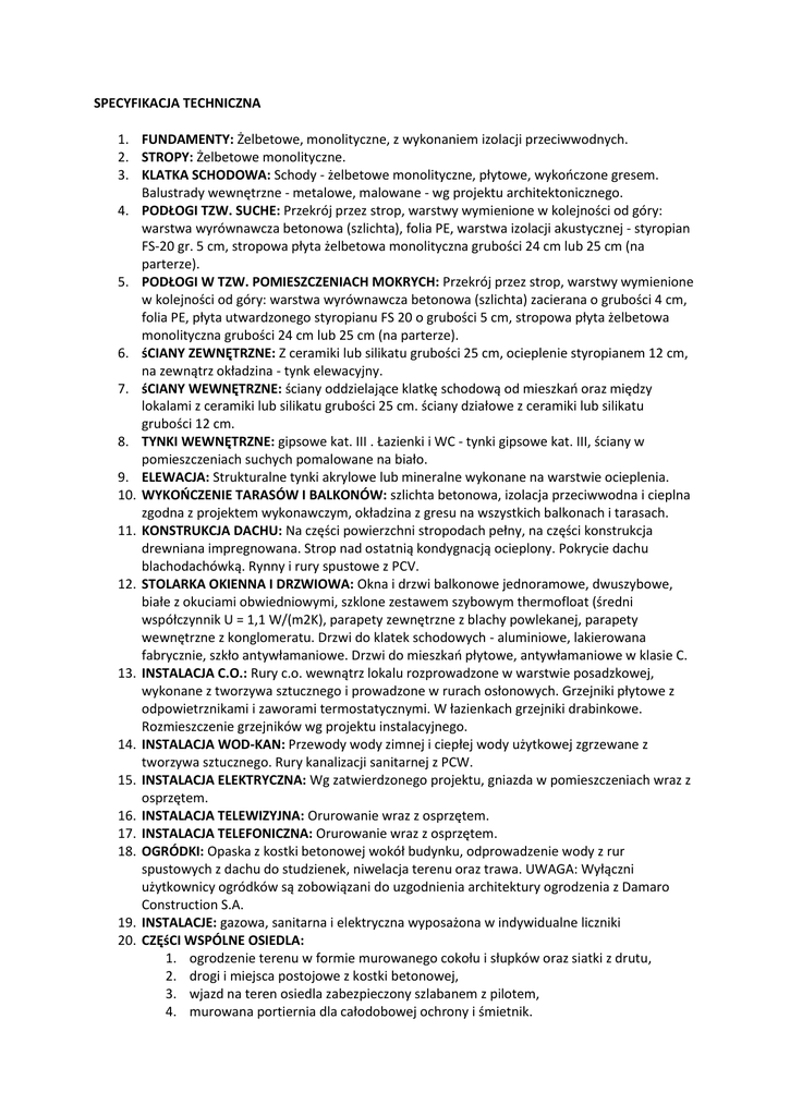 SPECYFIKACJA TECHNICZNA 1. FUNDAMENTY: Żelbetowe, monolityczne, z wykonaniem izolacji przeciwwodnych. 2. STROPY: Żelbetowe monolityczne. 3. KLATKA SCHODOWA: Schody - żelbetowe monolityczne, płytowe, wykończone gresem. Balustrady wewnętrzne - metalowe, malowane - wg projektu architektonicznego. 4. PODŁOGI TZW. SUCHE: Przekrój przez strop, warstwy wymienione w kolejności od góry: warstwa wyrównawcza betonowa (szlichta), folia PE, warstwa izolacji akustycznej - styropian FS-20 gr. 5 cm, stropowa płyta żelbetowa monolityczna grubości 24 cm lub 25 cm (na parterze). 5. PODŁOGI W TZW. POMIESZCZENIACH MOKRYCH: Przekrój przez strop, warstwy wymienione w kolejności od góry: warstwa wyrównawcza betonowa (szlichta) zacierana o grubości 4 cm, folia PE, płyta utwardzonego styropianu FS 20 o grubości 5 cm, stropowa płyta żelbetowa monolityczna grubości 24 cm lub 25 cm (na parterze). 6. śCIANY ZEWNĘTRZNE: Z ceramiki lub silikatu grubości 25 cm, ocieplenie styropianem 12 cm, na zewnątrz okładzina - tynk elewacyjny. 7. śCIANY WEWNĘTRZNE: ściany oddzielające klatkę schodową od mieszkań oraz między lokalami z ceramiki lub silikatu grubości 25 cm. ściany działowe z ceramiki lub silikatu grubości 12 cm. 8. TYNKI WEWNĘTRZNE: gipsowe kat. III . Łazienki i WC - tynki gipsowe kat. III, ściany w pomieszczeniach suchych pomalowane na biało. 9. ELEWACJA: Strukturalne tynki akrylowe lub mineralne wykonane na warstwie ocieplenia. 10. WYKOŃCZENIE TARASÓW I BALKONÓW: szlichta betonowa, izolacja przeciwwodna i cieplna zgodna z projektem wykonawczym, okładzina z gresu na wszystkich balkonach i tarasach. 11. KONSTRUKCJA DACHU: Na części powierzchni stropodach pełny, na części konstrukcja drewniana impregnowana. Strop nad ostatnią kondygnacją ocieplony. Pokrycie dachu blachodachówką. Rynny i rury spustowe z PCV. 12. STOLARKA OKIENNA I DRZWIOWA: Okna i drzwi balkonowe jednoramowe, dwuszybowe, białe z okuciami obwiedniowymi, szklone zestawem szybowym thermofloat (średni współczynnik U = 1,1 W/(m2K), parapety zewnętrzne z blachy powlekanej, parapety wewnętrzne z konglomeratu. Drzwi do klatek schodowych - aluminiowe, lakierowana fabrycznie, szkło antywłamaniowe. Drzwi do mieszkań płytowe, antywłamaniowe w klasie C. 13. INSTALACJA C.O.: Rury c.o. wewnątrz lokalu rozprowadzone w warstwie posadzkowej, wykonane z tworzywa sztucznego i prowadzone w rurach osłonowych. Grzejniki płytowe z odpowietrznikami i zaworami termostatycznymi. W łazienkach grzejniki drabinkowe. Rozmieszczenie grzejników wg projektu instalacyjnego. 14. INSTALACJA WOD-KAN: Przewody wody zimnej i ciepłej wody użytkowej zgrzewane z tworzywa sztucznego. Rury kanalizacji sanitarnej z PCW. 15. INSTALACJA ELEKTRYCZNA: Wg zatwierdzonego projektu, gniazda w pomieszczeniach wraz z osprzętem. 16. INSTALACJA TELEWIZYJNA: Orurowanie wraz z osprzętem. 17. INSTALACJA TELEFONICZNA: Orurowanie wraz z osprzętem. 18. OGRÓDKI: Opaska z kostki betonowej wokół budynku, odprowadzenie wody z rur spustowych z dachu do studzienek, niwelacja terenu oraz trawa. UWAGA: Wyłączni użytkownicy ogródków są zobowiązani do uzgodnienia architektury ogrodzenia z Damaro Construction S.A. 19. INSTALACJE: gazowa, sanitarna i elektryczna wyposażona w indywidualne liczniki 20. CZĘśCI WSPÓLNE OSIEDLA: 1. ogrodzenie terenu w formie murowanego cokołu i słupków oraz siatki z drutu, 2. drogi i miejsca postojowe z kostki betonowej, 3. wjazd na teren osiedla zabezpieczony szlabanem z pilotem, 4. murowana portiernia dla całodobowej ochrony i śmietnik.