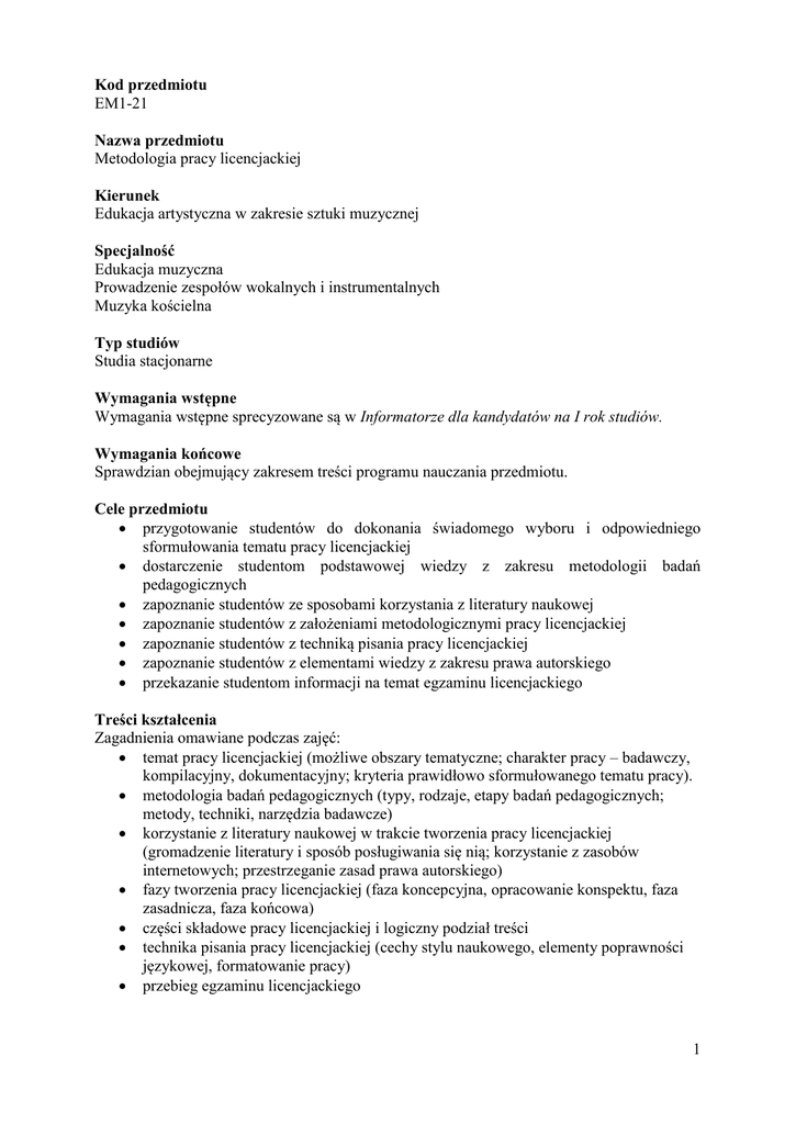 Kod przedmiotu EM1-21 Nazwa przedmiotu Metodologia pracy licencjackiej Kierunek Edukacja artystyczna w zakresie sztuki muzycznej Specjalność Edukacja muzyczna Prowadzenie zespołów wokalnych i instrumentalnych Muzyka kościelna Typ studiów Studia stacjonarne Wymagania wstępne Wymagania wstępne sprecyzowane są w Informatorze dla kandydatów na I rok studiów. Wymagania końcowe Sprawdzian obejmujący zakresem treści programu nauczania przedmiotu. Cele przedmiotu przygotowanie studentów do dokonania świadomego wyboru i odpowiedniego sformułowania tematu pracy licencjackiej dostarczenie studentom podstawowej wiedzy z zakresu metodologii badań pedagogicznych zapoznanie studentów ze sposobami korzystania z literatury naukowej zapoznanie studentów z założeniami metodologicznymi pracy licencjackiej zapoznanie studentów z techniką pisania pracy licencjackiej zapoznanie studentów z elementami wiedzy z zakresu prawa autorskiego przekazanie studentom informacji na temat egzaminu licencjackiego Treści kształcenia Zagadnienia omawiane podczas zajęć: temat pracy licencjackiej (możliwe obszary tematyczne; charakter pracy – badawczy, kompilacyjny, dokumentacyjny; kryteria prawidłowo sformułowanego tematu pracy). metodologia badań pedagogicznych (typy, rodzaje, etapy badań pedagogicznych; metody, techniki, narzędzia badawcze) korzystanie z literatury naukowej w trakcie tworzenia pracy licencjackiej (gromadzenie literatury i sposób posługiwania się nią; korzystanie z zasobów internetowych; przestrzeganie zasad prawa autorskiego) fazy tworzenia pracy licencjackiej (faza koncepcyjna, opracowanie konspektu, faza zasadnicza, faza końcowa) części składowe pracy licencjackiej i logiczny podział treści technika pisania pracy licencjackiej (cechy stylu naukowego, elementy poprawności językowej, formatowanie pracy) przebieg egzaminu licencjackiego 1 Zamierzone efekty kształcenia Po ukończeniu semestralnego cyklu nauczania przedmiotu metodologia pracy licencjackiej na studiach I stopnia studenci powinni: w zakresie wiedzy - przyswoić sobie zasady tworzenia pracy licencjackiej w zakresie merytorycznym i formalnym; - orientować się w piśmiennictwie dotyczącym metodologii pracy licencjackiej (EM_W05) - posiadać wiedzę umożliwiającą dotarcie do informacji niezbędnych dla napisania pracy licencjackiej (zawartych w książkach, nagraniach, materiałach nutowych lub w Internecie) oraz ich właściwe analizowanie i interpretowanie (EM_W06) - posiadać elementarną wiedzę z zakresu metodologii badań pedagogicznych, umożliwiającą przeprowadzenie elementarnych badań pedagogicznych związanych z tematem pracy licencjackiej (EM_W12) w zakresie umiejętności - być przygotowani do swobodnego wypowiadania się w piśmie w obszarze merytorycznym związanym z tematem pracy (EM_U15) - być przygotowani do praktycznego zastosowania wiedzy dotyczącej: 1) badań pedagogicznych, dającej kwalifikacje do przeprowadzenia takich badań na potrzeby własnej pracy licencjackiej (EM_U20), 2) metodologii tworzenia pracy licencjackiej w zakresie kompetencji społecznych - być przygotowani do podjęcia samodzielnego opracowania zagadnienia wynikającego z tematu pracy, wykazując się przy tym umiejętnością zbierania, analizowania i interpretowania informacji oraz formułowania krytycznej argumentacji (EM_K02) - opanować umiejętność zorganizowania procesu tworzenia pracy licencjackiej (EM_K03) - wykazywać się samodzielnym myśleniem w trakcie przygotowywania się do podjęcia pisania pracy licencjackiej (EM_K05) - przyswoić sobie podstawowe pojęcia i zasady z zakresu ochrony własności intelektualnej i prawa autorskiego (EM_K16) Formy kształcenia Wykład zbiorowy Nakład pracy studenta niezbędny do osiągnięcia zamierzonych efektów kształcenia Rok I Semestr 1 2 3 Punkty ECTS Liczba godzin w tygodniu Rodzaj zaliczenia Legenda z – zaliczenie bez stopnia II III 4 1 1 5 6 z 2 Kryteria oceny Przy ocenianiu studenta brane są pod uwagę następujące elementy: - wiedza teoretyczna studenta z zakresu metodologii badań pedagogicznych i metodologii tworzenia pracy licencjackiej, przejawiająca się w znajomości pojęć i umiejętności ich wyjaśniania - zaawansowanie w przygotowaniu do podjęcia pisania pracy licencjackiej Literatura Boć Jan, Jak pisać pracę magisterską. Wrocław 2009. Łobocki Mieczysław, Wprowadzenie do metodologii badań pedagogicznych. Kraków 2009. Popławska Agata, Jak napisać pracę dyplomową z pedagogiki. Białystok 2008. Węglińska Maria, Jak pisać pracę magisterską. Kraków 1997. Wojciechowska Renata, Przewodnik metodyczny pisania pracy dyplomowej. Warszawa 2010. Wrycza-Bekier Joanna, Kreatywna praca dyplomowa. Gliwice 2011. Zaczyński Władysław, Praca badawcza nauczyciela. Warszawa 1997. Zenderowski Radosław, Praca magisterska. Licencjat. Krótki przewodnik po metodologii pisania i obrony pracy dyplomowej. Warszawa [b.r.w.]. Język wykładowy polski Prowadzący st. wykł. Dorota Kanafa 3