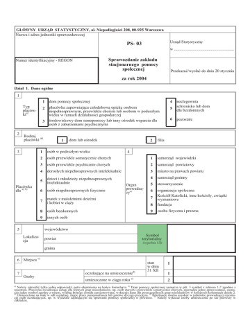 G£ÓWNY URZ¥D STATYSTYCZNY, al. Niepodleg³oœci 208, 00-925 Warszawa Nazwa i adres jednostki sprawozdawczej Urz¹d Statystyczny PS- 03 w ......................................................... Sprawozdanie zak³adu stacjonarnego pomocy spo³ecznej Numer identyfikacyjny - REGON Przekazaæ/wys³aæ do dnia 20 stycznia za rok 2004 Dzia³ 1. Dane ogólne 1 Typ placówkia) 1 dom pomocy spo³ecznej 4 2 placówka zapewniaj¹ca ca³odobow¹ opiekê osobom niepe³nosprawnym, przewlekle chorym lub osobom w podesz³ym wieku w ramach dzia³alnoœci gospodarczej œrodowiskowy dom samopomocy lub inny oœrodek wsparcia dla osób z zaburzeniami psychicznymi 5 noclegownia schronisko lub dom dla bezdomnych 6 pozosta³e 3 2 Rodzaj a) placówki 3 Placówka dla a) b) 1 dom lub oœrodek 2 filia 1 osób w podesz³ym wieku 2 osób przewlekle somatycznie chorych 1 samorz¹d wojewódzki 3 osób przewlekle psychicznie chorych 2 samorz¹d powiatowy 4 doros³ych niepe³nosprawnych intelektualnie 3 miasto na prawach powiatu 5 dzieci i m³odzie¿y niepe³nosprawnych intelektualnie 4 samorz¹d gminny 5 stowarzyszenie 6 8 organizacja spo³eczna Koœció³ Katolicki, inne koœcio³y, zwi¹zki wyznaniowe fundacja 9 osoba fizyczna i prawna 6 osób niepe³nosprawnych fizycznie 7 matek z ma³oletnimi dzieæmi i kobiet w ci¹¿y 8 osób bezdomnych 9 innych osób 4 Organ prowadz¹cya) 7 województwo 5 Lokalizacja Symbol terytorialny powiat (wype³nia US) gmina 6 Miejsca c) 7 Osoby oczekuj¹ce na umieszczenied) umieszczone w ci¹gu roku e) stan w dniu 31 XII 1 1 2 a) Nale¿y zakreœliæ tylko jedn¹ odpowiedŸ, patrz objaœnienia na koñcu formularza. b) Dom pomocy spo³ecznej zaznacza w pkt. 3 symbol z zakresu 1-7 zgodnie z rejestrem. Placówka œwiadcz¹ca us³ugi dla ró¿nych grup mieszkañców, np. osób starych i przewlekle somatycznie chorych, sporz¹dza jedno sprawozdanie, zaznacza jeden symbol zgodny z typem, wed³ug którego zosta³a zarejestrowana, wykazuje dane dla poszczególnych grup mieszkañców w kolejnych kolumnach dzia³u 2. c) Umieszczone na sta³e w sali sypialnej, zajête przez pensjonariusza lub gotowe do jego przyjêcia. d) Informacje mo¿na uzyskaæ w jednostce prowadz¹cej rejestracjê osób oczekuj¹cych, np. w wydziale zajmuj¹cym siê sprawami pomocy spo³ecznej w powiecie. e) Nale¿y wykazaæ osoby umieszczone po raz pierwszy w zak³adzie. Dzia³ 2. Mieszkañcya) “Oddzia³y” Wyszczególnienie 0 Symbol b) 1 2 3 03 do 18 lat 04 19 - 40 lat 05 41 - 60 lat 06 61 - 74 lata 07 75 lat i wiêcej 08 z emerytury lub renty 09 z zasi³ku sta³ego 10 przez cz³onków rodziny, opiekuna prawnego 11 przez gminê 12 Op³acaj¹cy pobyt w pe³nej wysokoœci 13 Osoby nie opuszczaj¹ce ³ó¿ek Osobodni III 02 w tym kobiety Z wiersza 02 op³acaj¹cy pobyt g³ównie II 01 Liczba mieszkañców w dniu 31 XII (w. 04 do w. 08) Z wiersza 02 w wieku I pobytu mieszkañców 14 c) ¿ywienia mieszkañców 15 d) 16 a) Zak³ad œwiadcz¹cy us³ugi dla jednej grupy mieszkañców wype³nia kolumnê I. Placówka posiadaj¹ca tzw. “oddzia³y”, tj. œwiadcz¹ca zgodnie z regulaminem organizacyjnym us³ugi dla ró¿nych grup mieszkañców, wype³nia dla ka¿dej osobn¹ kolumnê. Kolumnê I wype³nia siê dla grupy mieszkañców o symbolu zakreœlonym w dziale 1, pkt 3 (dla której zak³ad zosta³ zarejestrowany). Kolumny II i III wype³nia siê dla kolejnych grup mieszkañców (w obrêbie tego samego zak³adu). b) Pod numerem kolumny nale¿y wpisaæ symbol “oddzia³u”, korzystaj¹c z symboli wyszczególnionych w dziale 1, pkt 3 (ale nie zakreœlaæ d) ich tam). c) Suma liczby dni pobytu mieszkañców zak³adu w okresie roku sprawozdawczego (przebywaj¹cych, urlopowanych oraz skierowanych na leczenie). Suma liczby dni ¿ywienia mieszkañców zak³adu w okresie roku sprawozdawczego, a nie racji ¿ywieniowych (np. osoby chore na cukrzycê otrzymuj¹ podwójne racje ¿ywieniowe). Nie wlicza siê ¿ywienia osób dochodz¹cych. Dzia³ 3. Pracuj¹cy (w osobach) - stan w dniu 31 XII a) Ogó³em w tym lekarze 01 Pielêgniarki 03 02 Rehabilitanci 04 a) Nale¿y wykazaæ wszystkie osoby pracuj¹ce, niezale¿nie od formy zatrudnienia, dla których jest to g³ówne (pierwsze) miejsce pracy. Filie podaj¹ dane o pracuj¹cych i wolontariuszach na swoim sprawozdaniu. Jednostka œwiadcz¹ca us³ugi dla ró¿nych grup mieszkañców wykazuje jeden raz osobê pracuj¹c¹ np. dla dwóch grup mieszkañców, tj. na dwóch “oddzia³ach”. Liczba osób pracuj¹cych na zasadach wolontariatu ................................ Adres e-mail osoby sporz¹dzaj¹cej sprawozdanie ............................................................. (imiê, nazwisko i telefon osoby, która sporz¹dzi³a sprawozdanie) ................................................. (miejscowoœæ i data) .................................................................................... (piecz¹tka imienna i podpis osoby dzia³aj¹cej w imieniu sprowozdawcy) OBJAŒNIENIA DO FORMULARZA Sprawozdanie dotyczy stacjonarnych zak³adów pomocy spo³ecznej oraz oœrodków wsparcia posiadaj¹cych miejsca ca³odobowe okresowego pobytu. Nie badamy zak³adów opiekuñczo-leczniczych i placówek pielêgnacyjno-opiekuñczych. Akty prawne: 1. Ustawa z dnia 12 marca 2004 r. o pomocy spo³ecznej (Dz. U. Nr 64, poz. 593, z póŸn. zm.), 2. Rozporz¹dzenie Ministra Pracy i Polityki Spo³ecznej z dnia 15 wrzeœnia 2000 r. w sprawie domów pomocy spo³ecznej (Dz. U. Nr 82, poz. 929), 3. Ustawa z dnia 19 sierpnia 1994 r. o ochronie zdrowia psychicznego (Dz. U. Nr 111, poz. 535, z póŸn. zm.). Dom pomocy spo³ecznej - œwiadczy us³ugi bytowe, opiekuñcze, wspomagaj¹ce i edukacyjne na poziomie obowi¹zuj¹cego standardu, w zakresie i formach wynikaj¹cych z indywidualnych potrzeb osób w nim przebywaj¹cych. Pobyt w domu jest odp³atny. W zale¿noœci od tego dla kogo placówki s¹ przeznaczone dziel¹ siê na domy dla: - osób w podesz³ym wieku, - osób przewlekle somatycznie chorych, - osób pr