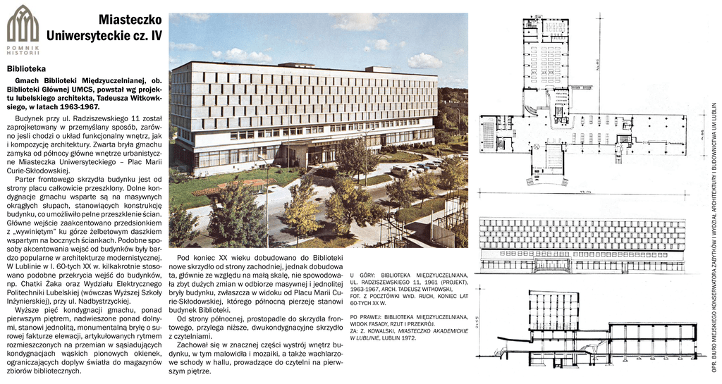 Miasteczko Uniwersyteckie cz. IV Gmach Biblioteki Międzyuczelnianej, ob. Biblioteki Głównej UMCS, powstał wg projektu lubelskiego architekta, Tadeusza Witkowksiego, w latach 1963-1967. Budynek przy ul. Radziszewskiego 11 został zaprojketowany w przemyślany sposób, zarówno jesli chodzi o układ funkcjonalny wnętrz, jak i kompozycję architektury. Zwarta bryła gmachu zamyka od północy główne wnętrze urbanistyczne Miasteczka Uniwersyteckiego – Plac Marii Curie-Skłodowskiej. Parter frontowego skrzydła budynku jest od strony placu całkowicie przeszklony. Dolne kondygnacje gmachu wsparte są na masywnych okrągłych słupach, stanowiących konstrukcję budynku, co umożliwiło pelne przeszklenie ścian. Główne wejście zaakcentowano przedsionkiem z „wywiniętym” ku górze żelbetowym daszkiem wspartym na bocznych ściankach. Podobne sposoby akcentowania wejsć od budynków były bardzo popularne w architekturze modernistycznej. W Lublinie w l. 60-tych XX w. kilkakrotnie stosowano podobne przekrycia wejść do budynków, np. Chatki Żaka oraz Wydziału Elektrycznego Politechniki Lubelskiej (wówczas Wyższej Szkoły Inżynierskiej), przy ul. Nadbystrzyckiej. Wyższe pięć kondygnacji gmachu, ponad pierwszym piętrem, nadwieszone ponad dolnymi, stanowi jednolitą, monumentalną bryłę o surowej fakturze elewacji, artykułowanych rytmem rozmieszczonych na przemian w sąsiadujących kondygnacjach wąskich pionowych okienek, ograniczających doplyw światła do magazynów zbiorów bibliotecznych. Pod koniec XX wieku dobudowano do Biblioteki nowe skrzydło od strony zachodniej, jednak dobudowa ta, głównie ze względu na małą skalę, nie spowodowała zbyt dużych zmian w odbiorze masywnej i jednolitej bryły budynku, zwłaszcza w widoku od Placu Marii Curie-Skłodowskiej, którego północną pierzeję stanowi budynek Biblioteki. Od strony północnej, prostopadle do skrzydla frontowego, przylega niższe, dwukondygnacyjne skrzydło z czytelniami. Zachował się w znacznej części wystrój wnętrz budynku, w tym malowidła i mozaiki, a także wachlarzowe schody w hallu, prowadzące do czytelni na pierwszym piętrze. u góry: Biblioteka Międzyuczelniana, ul. Radziszewskiego 11, 1961 (projekt), 1963-1967, arch. Tadeusz Witkowski, fot. z pocztówki wyd. RUCH, koniec lat 60-tych XX w. po prawej: biblioteka Międzyuczelniana, widok fasady, rzut i przekrój. za: Z. Kowalski, Miasteczko Akademickie w Lublinie, Lublin 1972. OPR. BIURO MIEJSKIEGO KONSERWATORA ZABYTKÓW i Wydział Architektury i Budownictwa UM Lublin Biblioteka