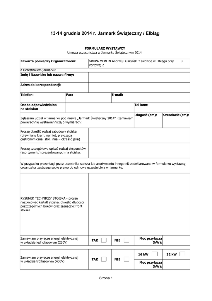 13-14 grudnia 2014 r. Jarmark Świąteczny / Elbląg FORMULARZ WYSTAWCY Umowa uczestnictwa w Jarmarku Świątecznym 2014 Zawarta pomiędzy Organizatorem: GRUPA MERLIN Andrzej Duszyński z siedzibą w Elblągu przy Portowej 2 ul. a Uczestnikiem jarmarku: Imię i Nazwisko lub nazwa firmy: Adres do korespondencji: Telefon: Fax: E-mail: Osoba odpowiedzialna na stoisku: Tel kom: Zgłaszam udział w jarmarku pod nazwą „Jarmark Świąteczny 2014” i zamawiam powierzchnię wystawienniczą o wymiarach: Długość (cm): Szerokość (cm): Proszę określić rodzaj zabudowy stoiska (drewniany kram, namiot, przyczepa gastronomiczna, stół, inna – określić jaka) Proszę szczegółowo opisać rodzaj eksponatów (asortymentu) prezentowanych na stoisku. W przypadku prezentacji przez uczestnika stoiska lub asortymentu innego niż zadeklarowane w formularzu wystawcy, organizator zastrzega sobie prawo do odmowy uczestnictwa w jarmarku. RYSUNEK TECHNICZY STOISKA - proszę naszkicować kształt stoiska, określić długości poszczególnych boków oraz zaznaczyć front stoiska. Zamawiam przyłącze energii elektrycznej w układzie jednofazowym (230V) Zamawiam przyłącze energii elektrycznej w układzie trójfazowym (400V) TAK NIE Moc przyłącza (kW): 16 kW TAK NIE Strona 1 Moc przyłącza (kW): 32 kW Dodatkowe uwagi: W Elbląskim Jarmarku Świątecznym biorę udział po raz : Imię i Nazwisko osoby upoważnionej do podpisania umowy uczestnictwa: Data wypełnienia formularza: Zapoznałem się i akceptuję warunki Regulaminu Jarmarku pn. „Jarmark Świąteczny 2014” stanowiącego integralną część niniejszej umowy uczestnictwa oraz wyrażam zgodę na przetwarzanie moich danych osobowych w celu realizacji postanowień niniejszej umowy. czytelny podpis i /lub pieczątka uczestnika Termin dostarczenia zgłoszeń upływa w dniu: 08 grudnia 2014 Wypełniony i podpisany formularz oraz fotografię należy dostarczyć do organizatora w formie zeskanowanej na adres e-mail, przesłać faksem lub listem poleconym na poniższe dane. Za datę dostarczenia zgłoszenia uważa się datę wpłynięcia do organizatora prawidłowo wypełnionego i podpisanego formularza. Telefon / Fax: 55 643 43 12 E-mail: [email protected] Adres do korespondencji: Biuro Organizacyjne Jarmarku „Jarmark Świąteczny 2014”, 82-300 Elbląg, ul. Portowa 2 Adres e-mail Proszę zaznaczyć preferowaną formę otrzymania zwrotnego potwierdzenia przyjęcia zgłoszenia: Fax List polecony Potwierdzenie przyjęcia zgłoszenia Data przyjęcia zgłoszenia: Podpis i pieczątka organizatora Strona 2